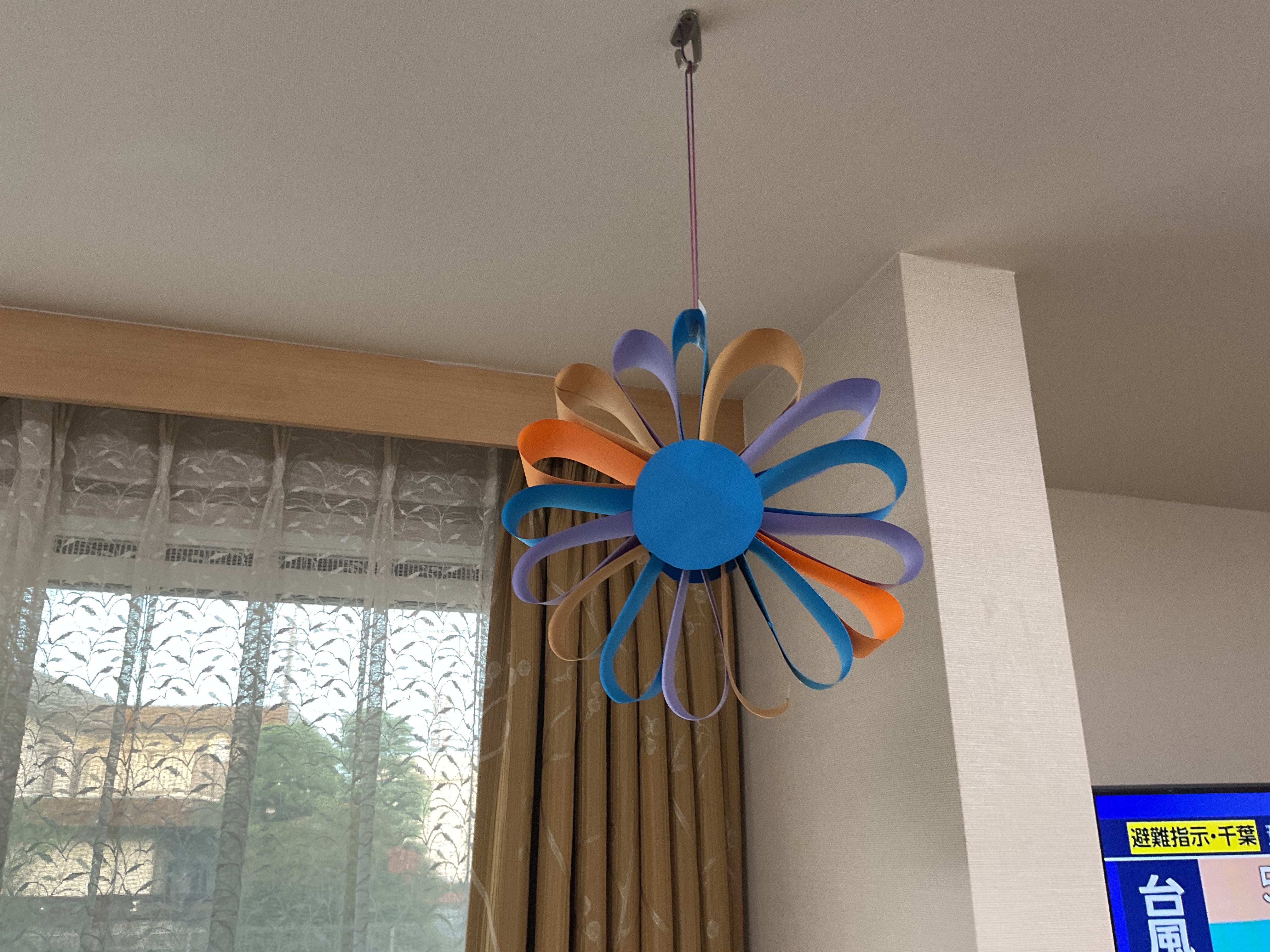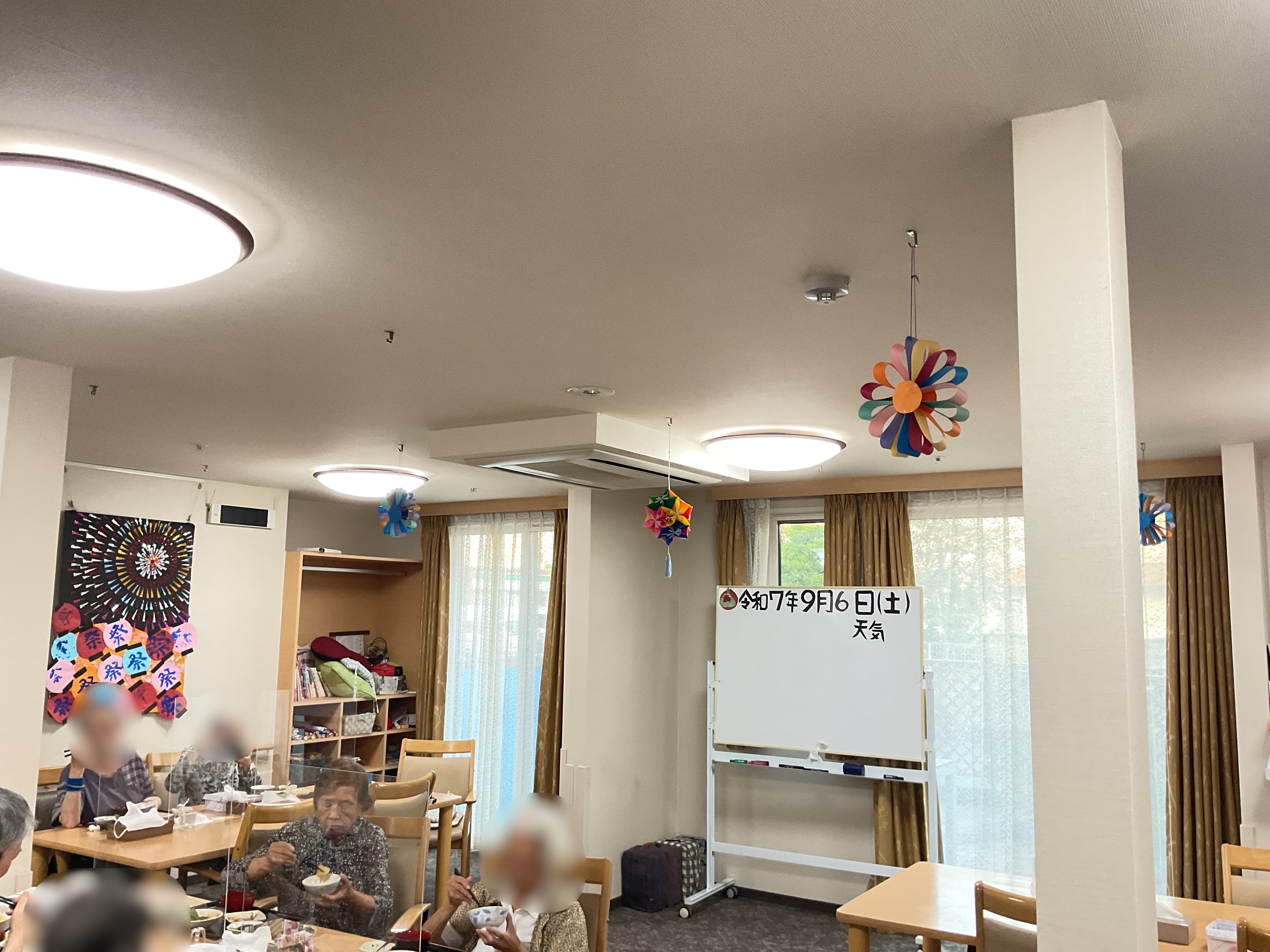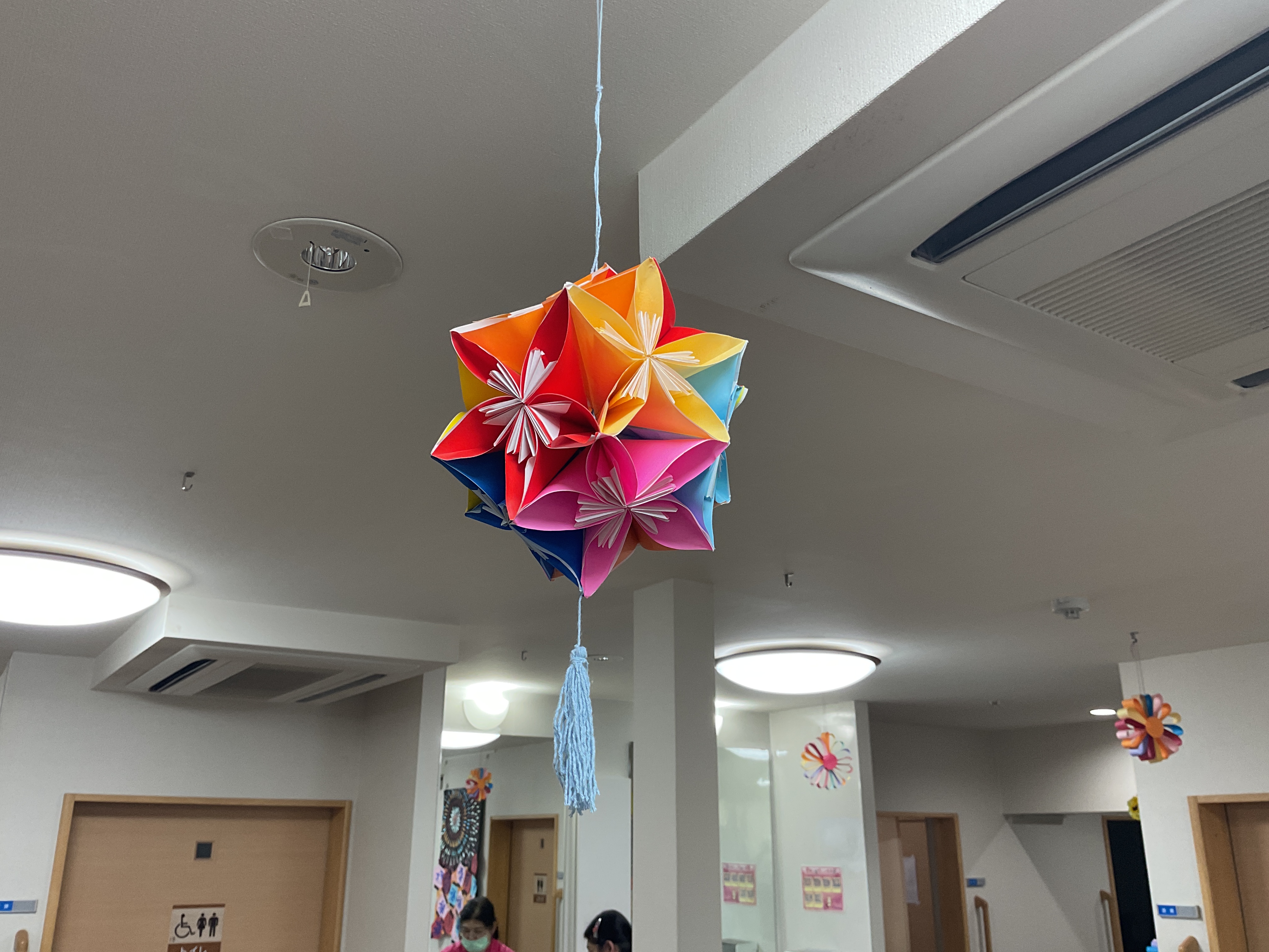月が替わり少し経った頃、フロアの天井を飾っていたスイカ🍉を外し新しい飾りを吊るしました。 今月の飾りは…… 大きな紙のお花です! 天井の飾りは毎月交換しており、季節に合った飾りや利用者様が作った飾りなどを使っております。 来月の飾りもお楽しみに。