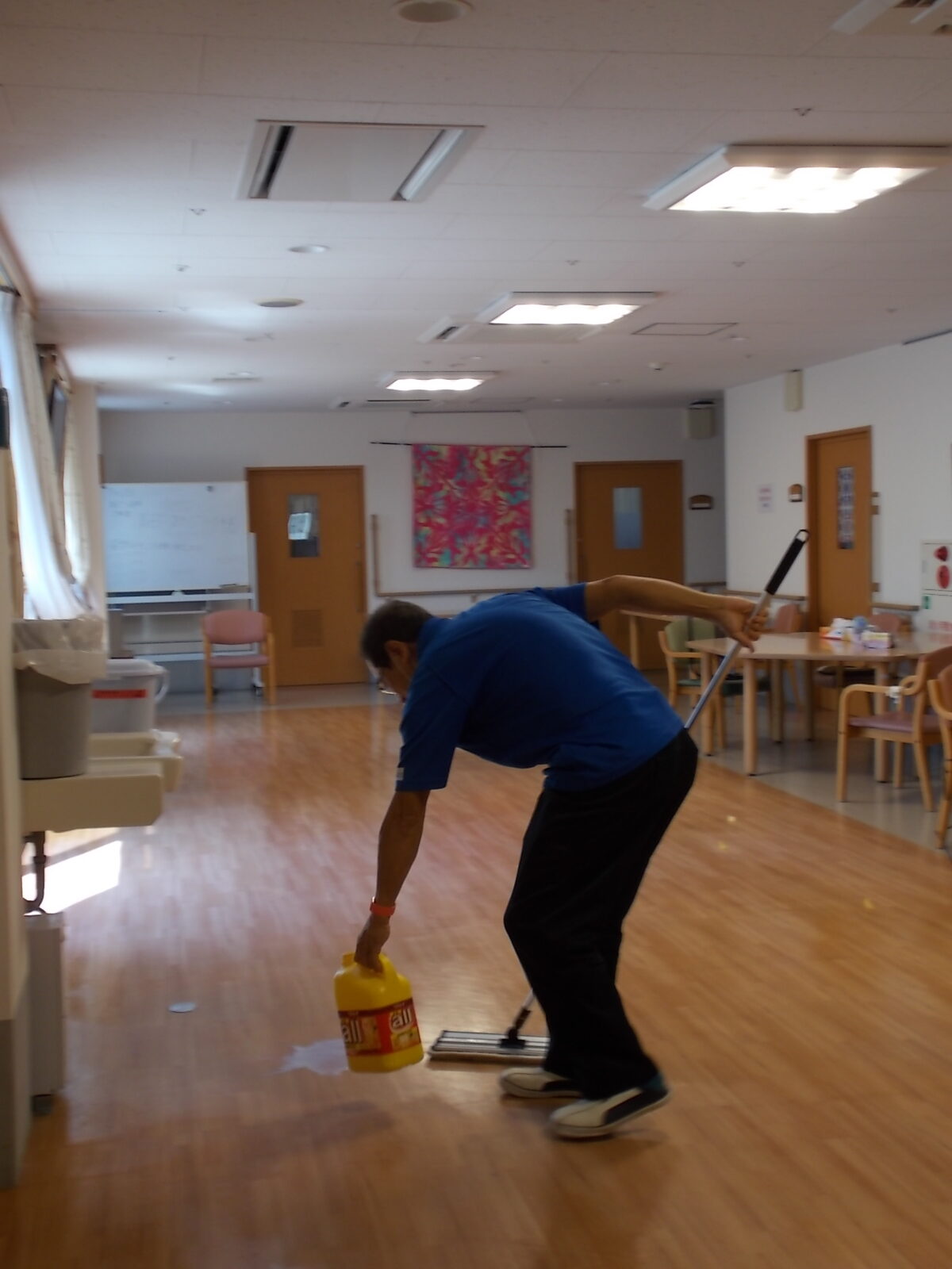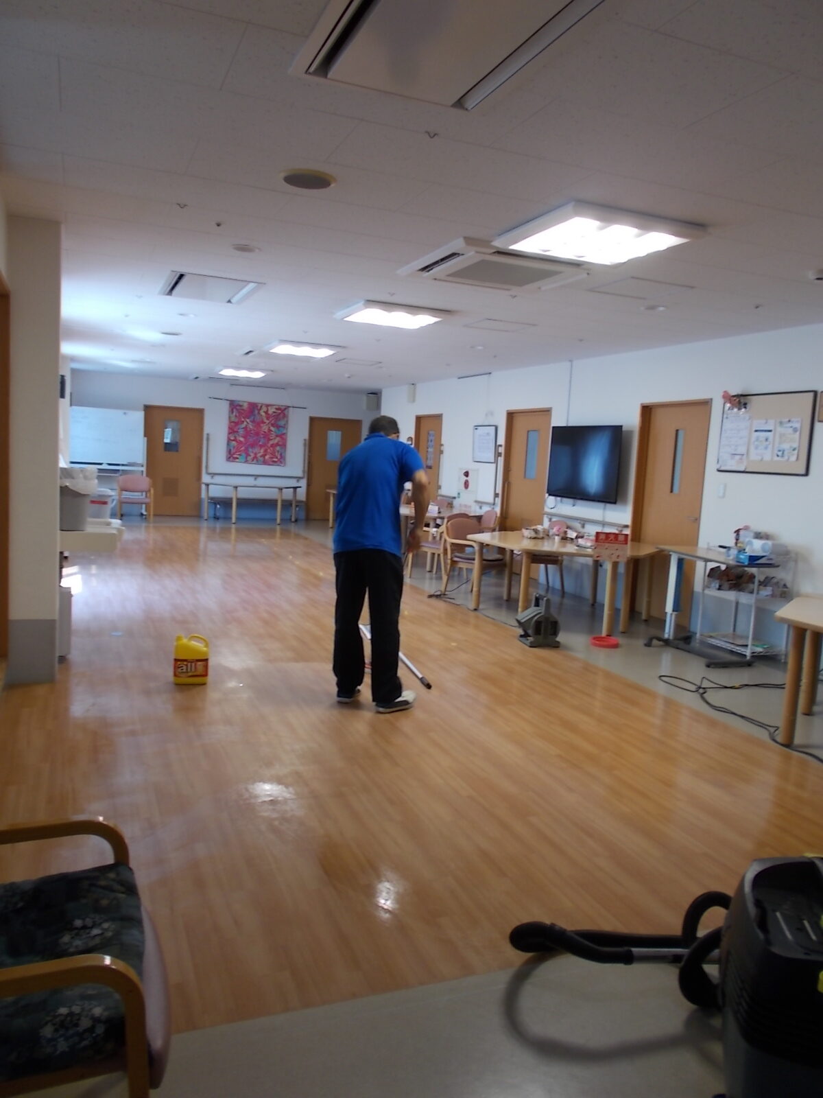 床のワックスがけもまた施設のメンテナンスの一つです。定期的にやっているからこそ、ご利用者が心地よくに過ごせ、我々職員も働きやすい環境となります。一人での作業は大変そうですが、今後ともよろしくお願いします!