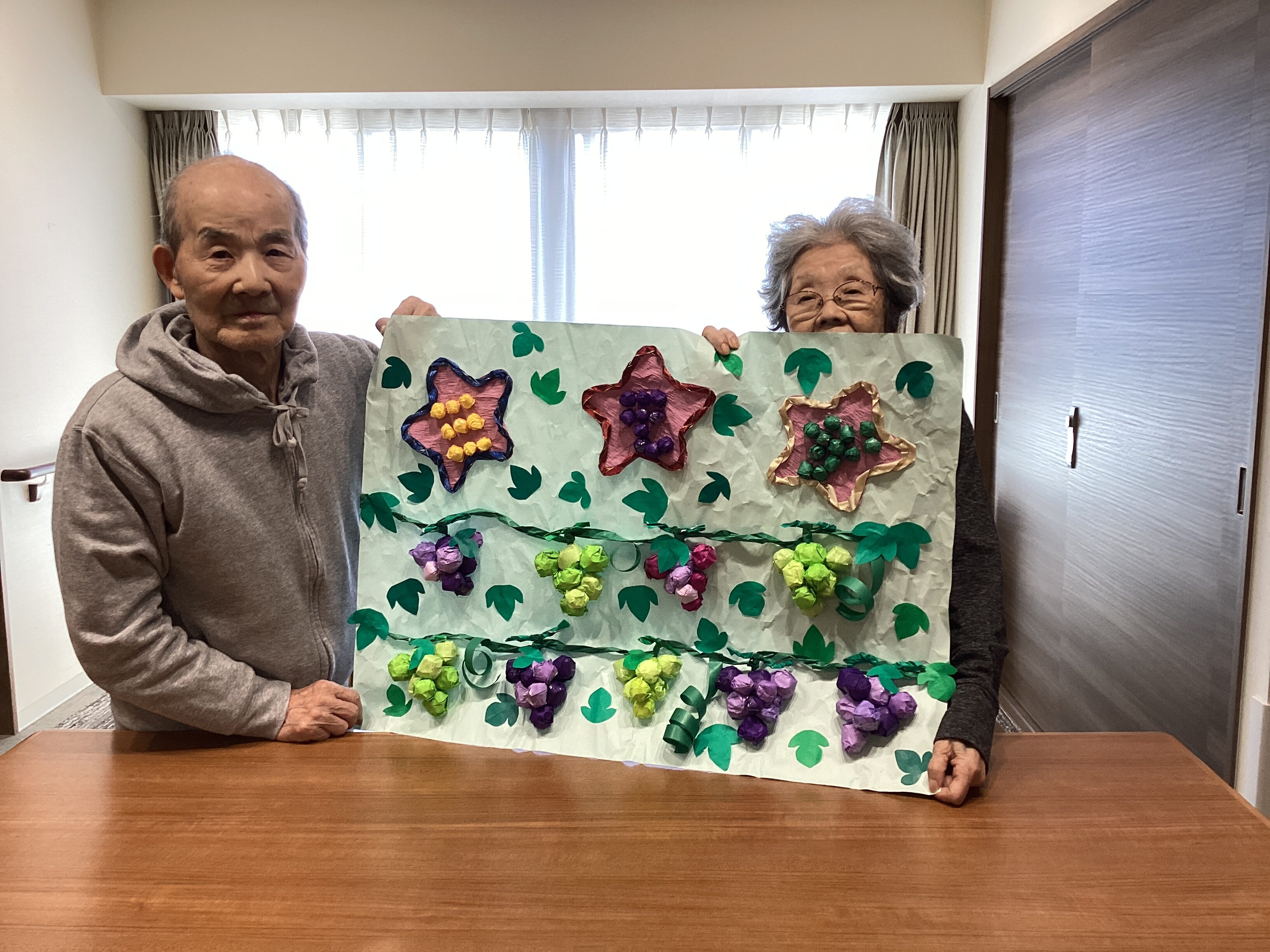 紙を丸めて丸めてブドウを作りました!なかなか上手にできたでしょ?!