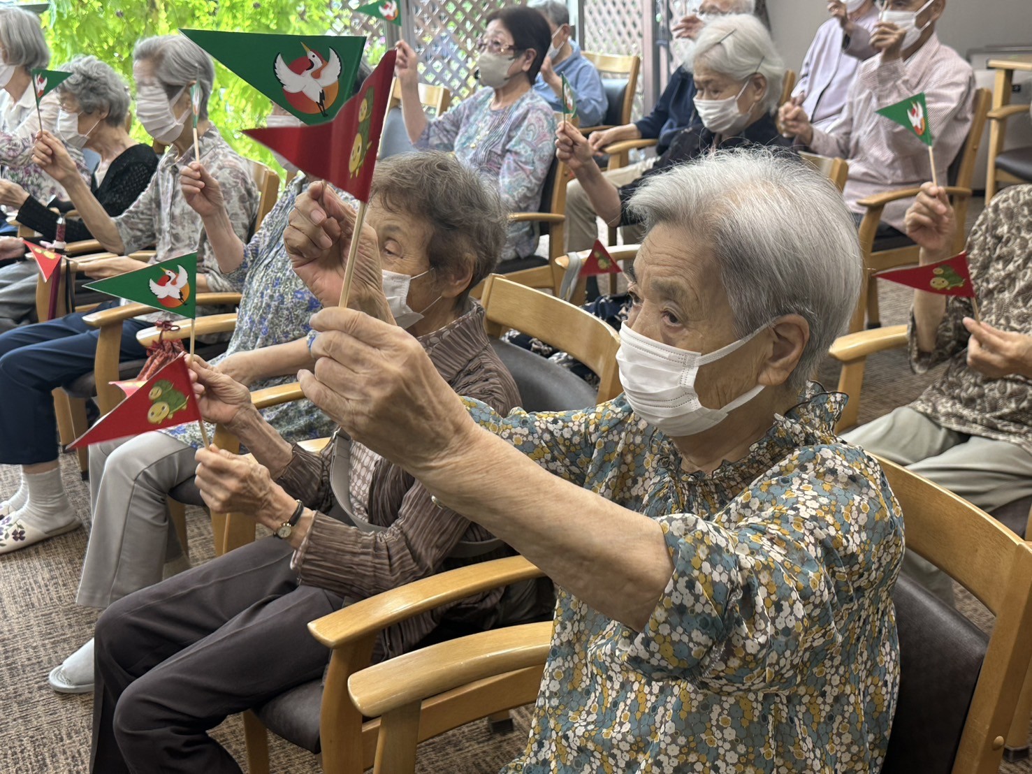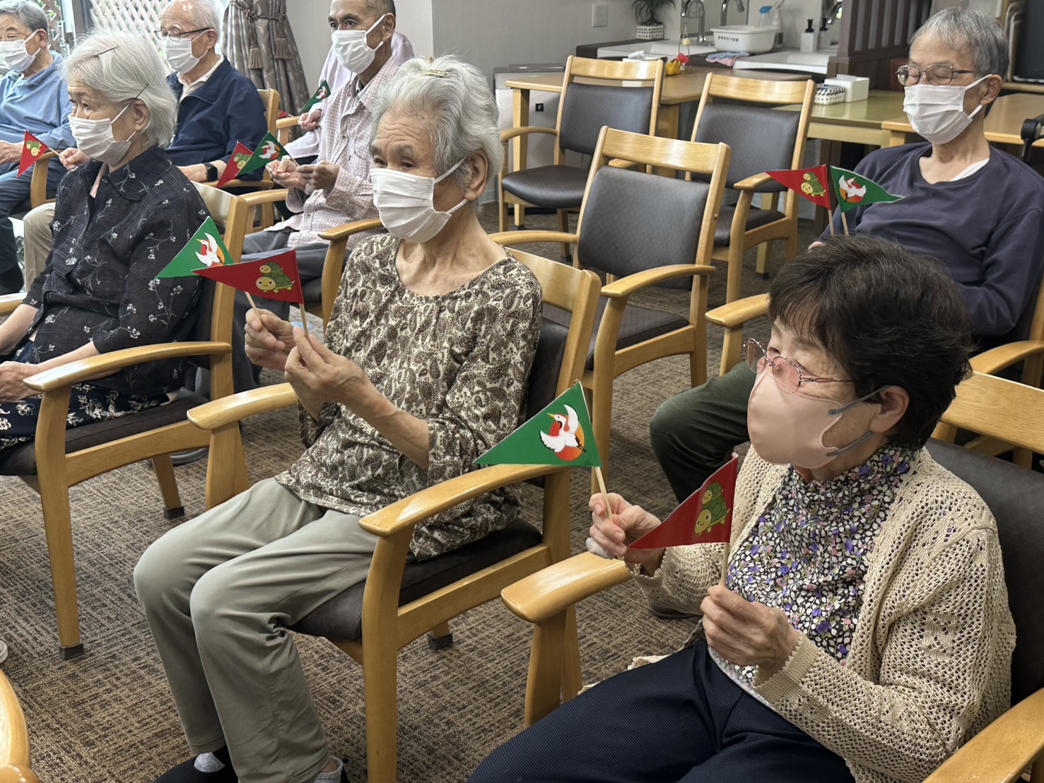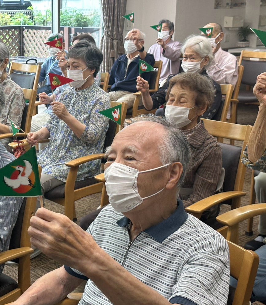 スタッフによるマツケンサンバです。頑張って練習しました。 次は入居者様の体操です。脳トレも含めて頑張りました。 恒例になりました鶴と亀の旗揚げゲームです。鶴揚げて!亀揚げて!だんだんとテンポも速くなり真剣な顔つきに変わっていきます。