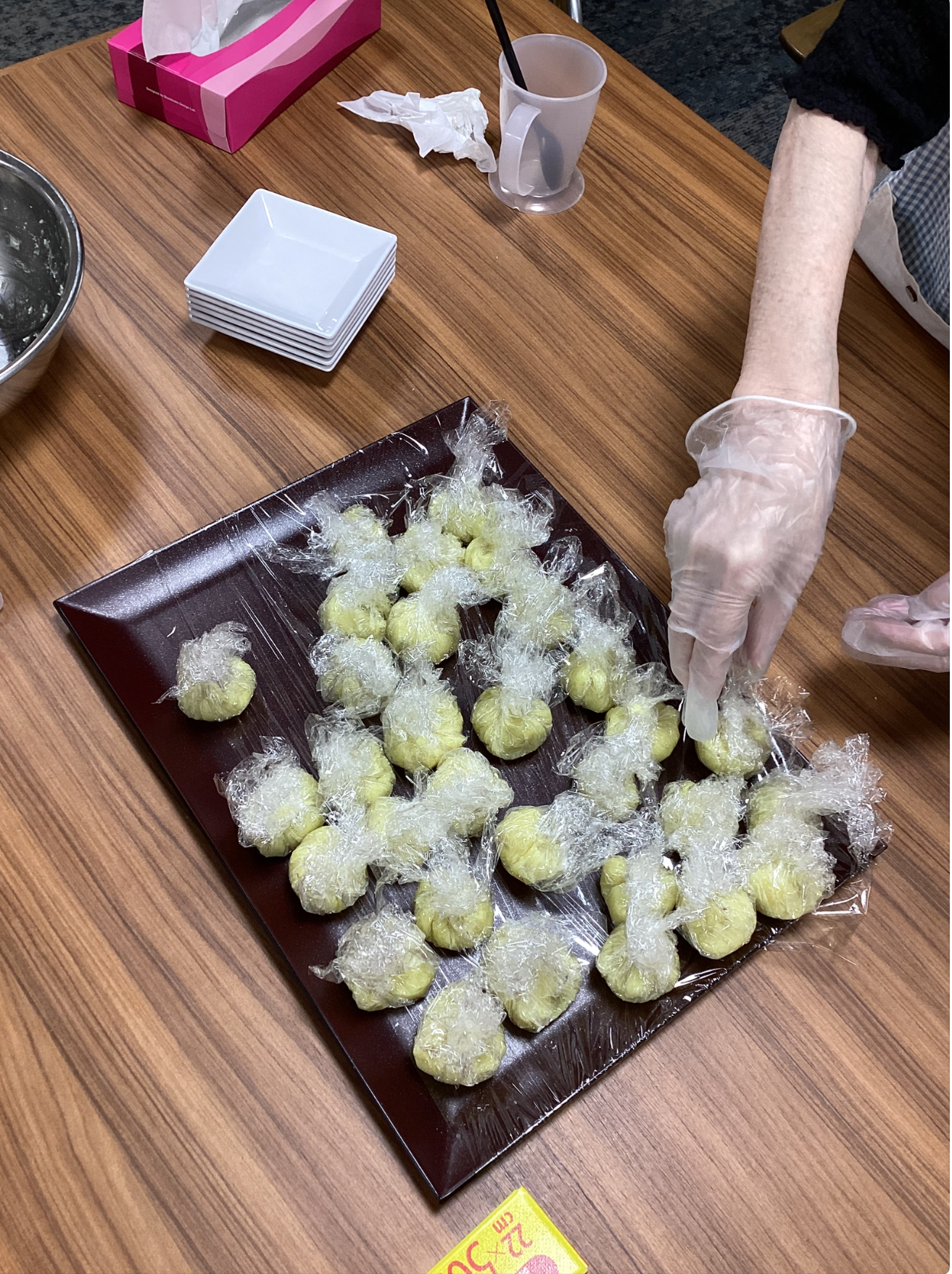 秋の味覚を頂きました。 冬至かぼちゃとサツマイモの茶巾包です(^▽^)/ 女性の利用者様も楽しみながら作る事が出来ました。 とても上品な味に仕上がって、皆様、大満足!!