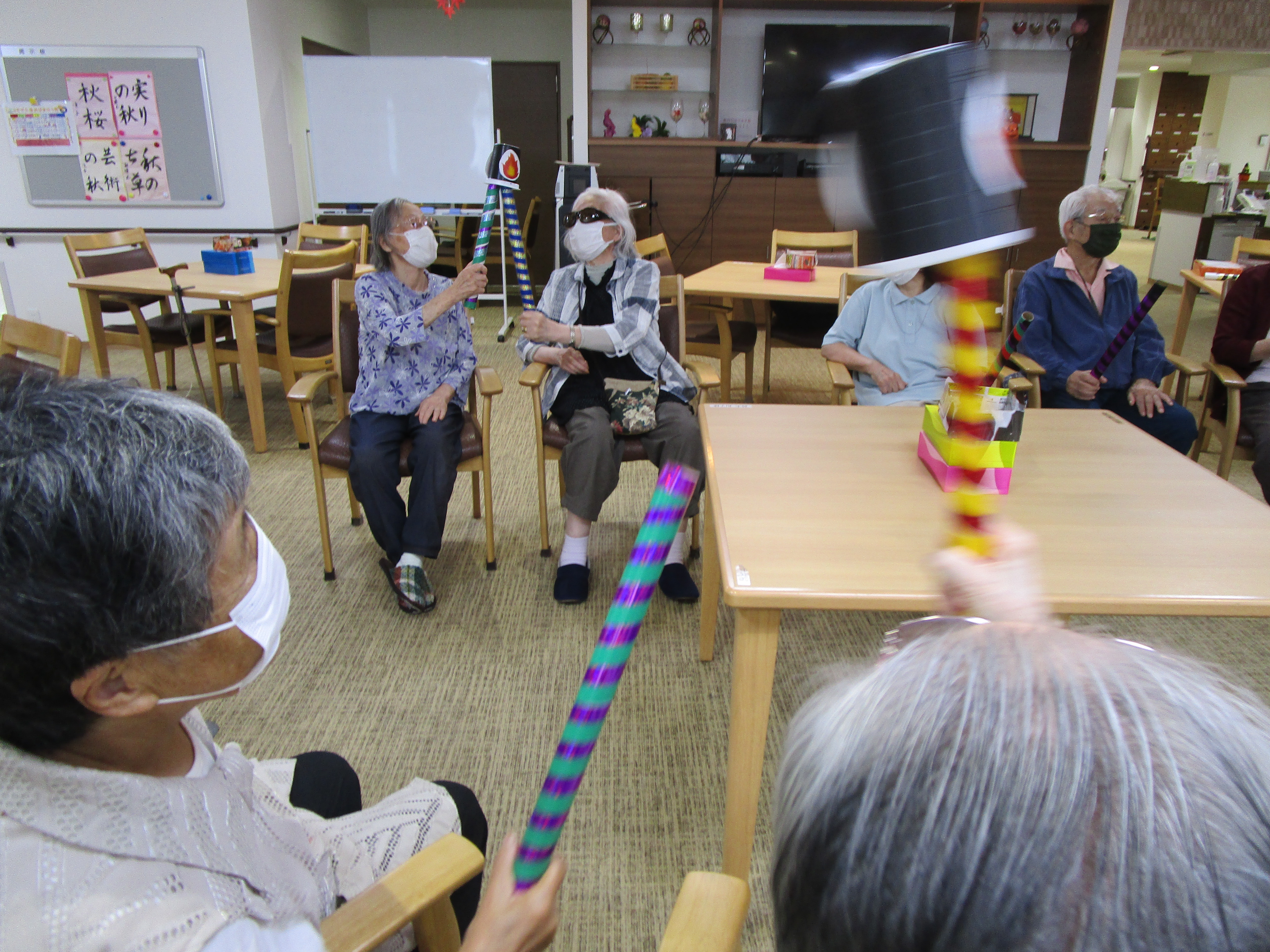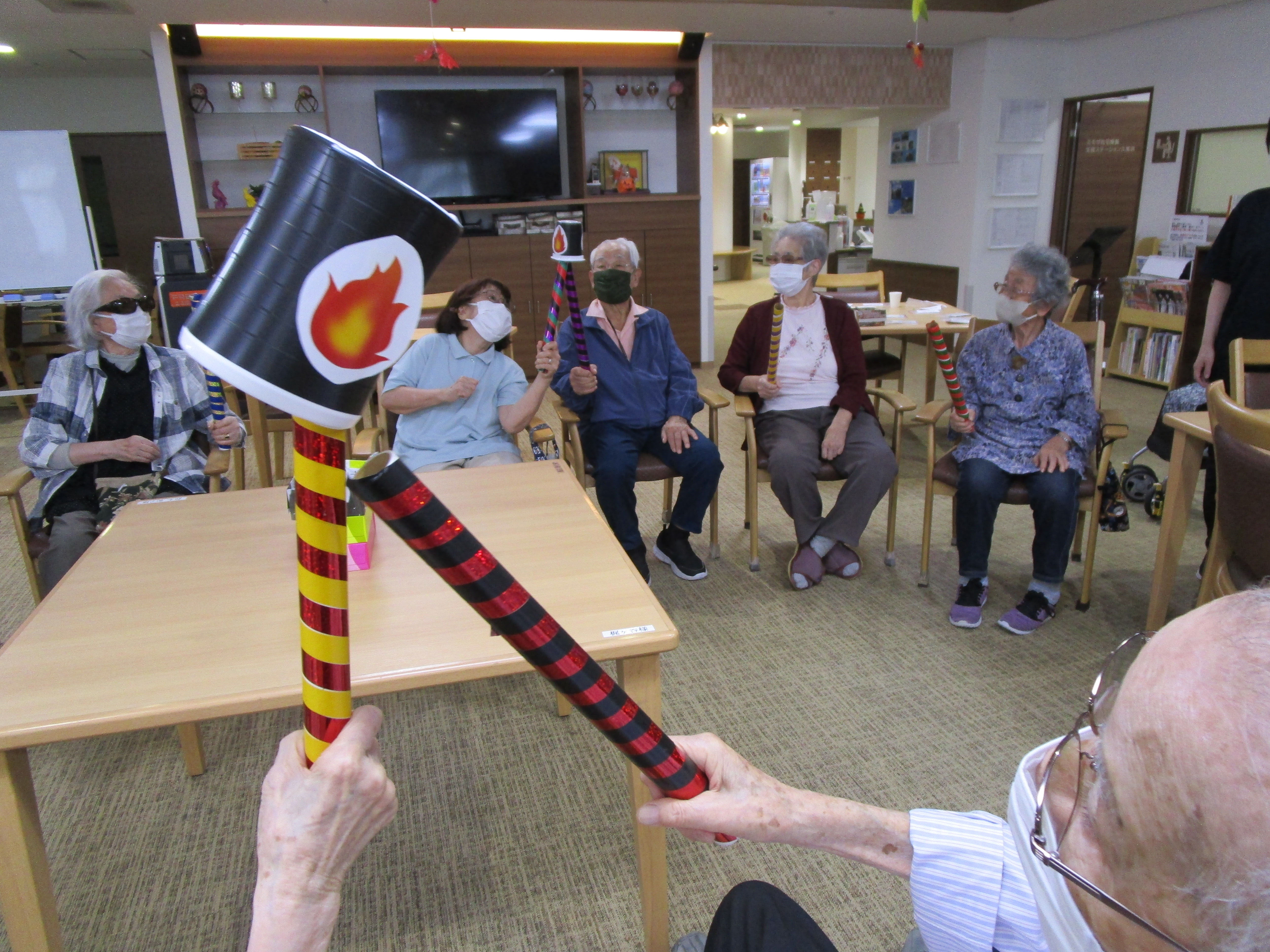 はまゆう苑では、レクの時間に、コップ聖火リレーを行いました。二組に別れてどちらが速いか競争しました(^^♪ 勝ったチームには景品付きとの事で、張り切って行われていました。 皆様、とても楽しまれていました♬