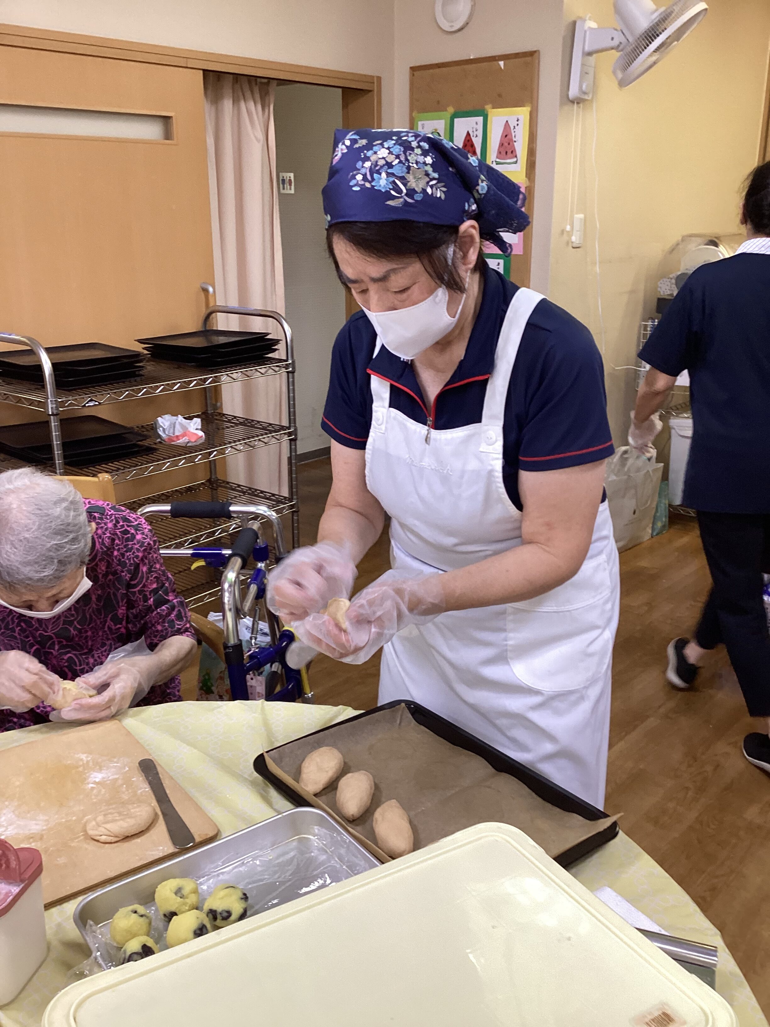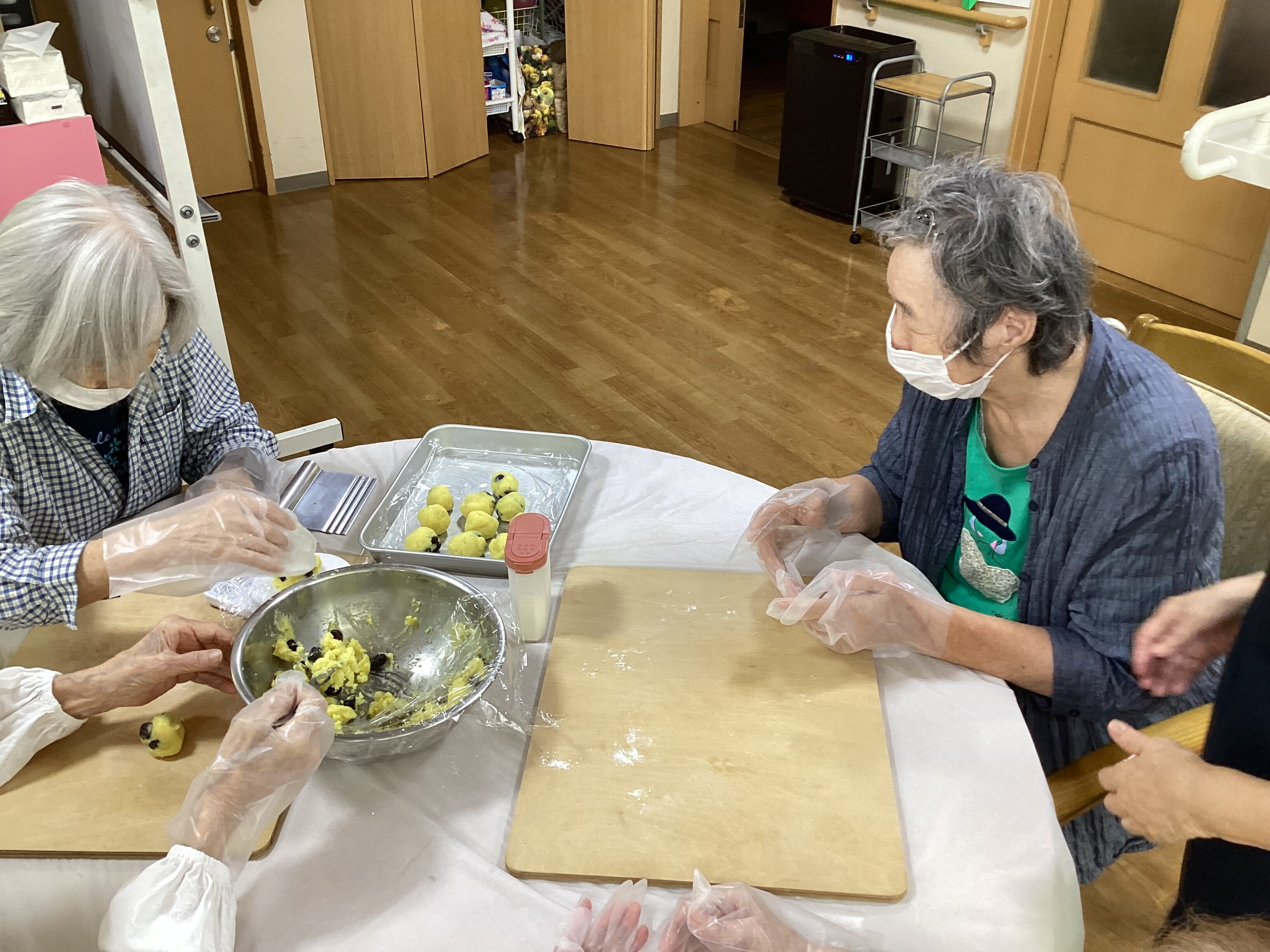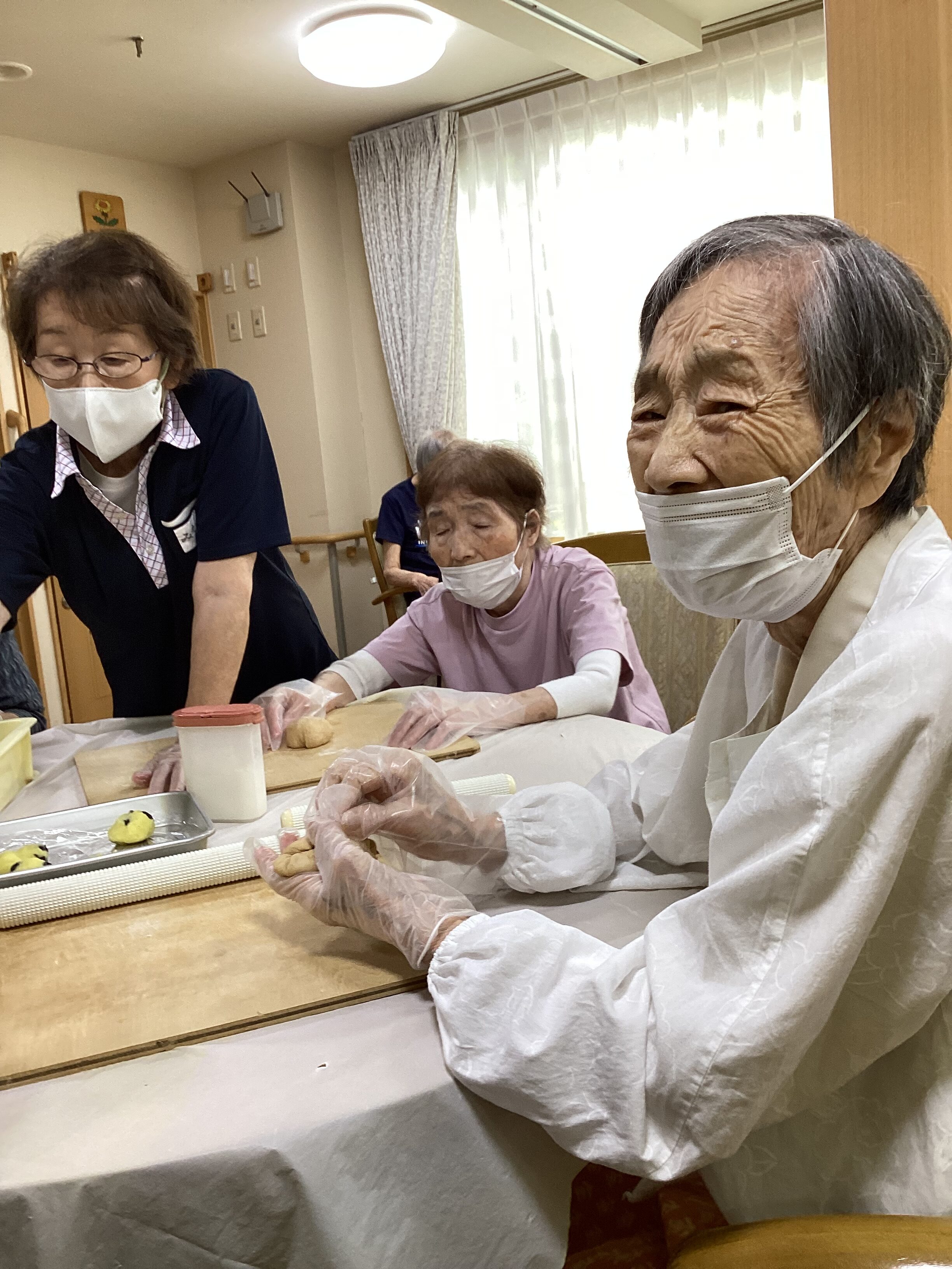 敬老の日にパン作りをしました。 皆さん楽しみながらパン作りに集中し、さつまいもパンを完成されました。日頃の感謝を込めてカードもお渡ししました。