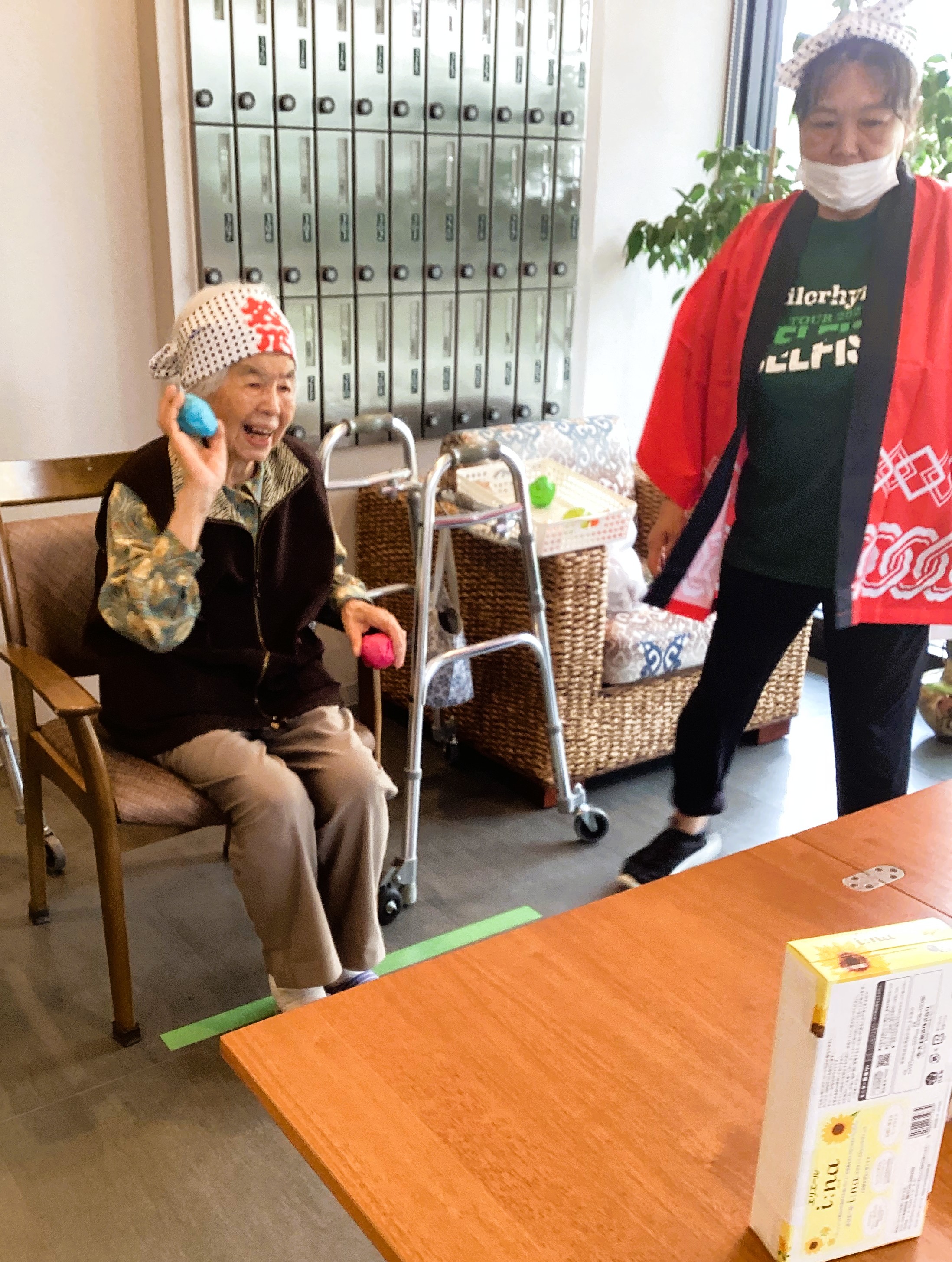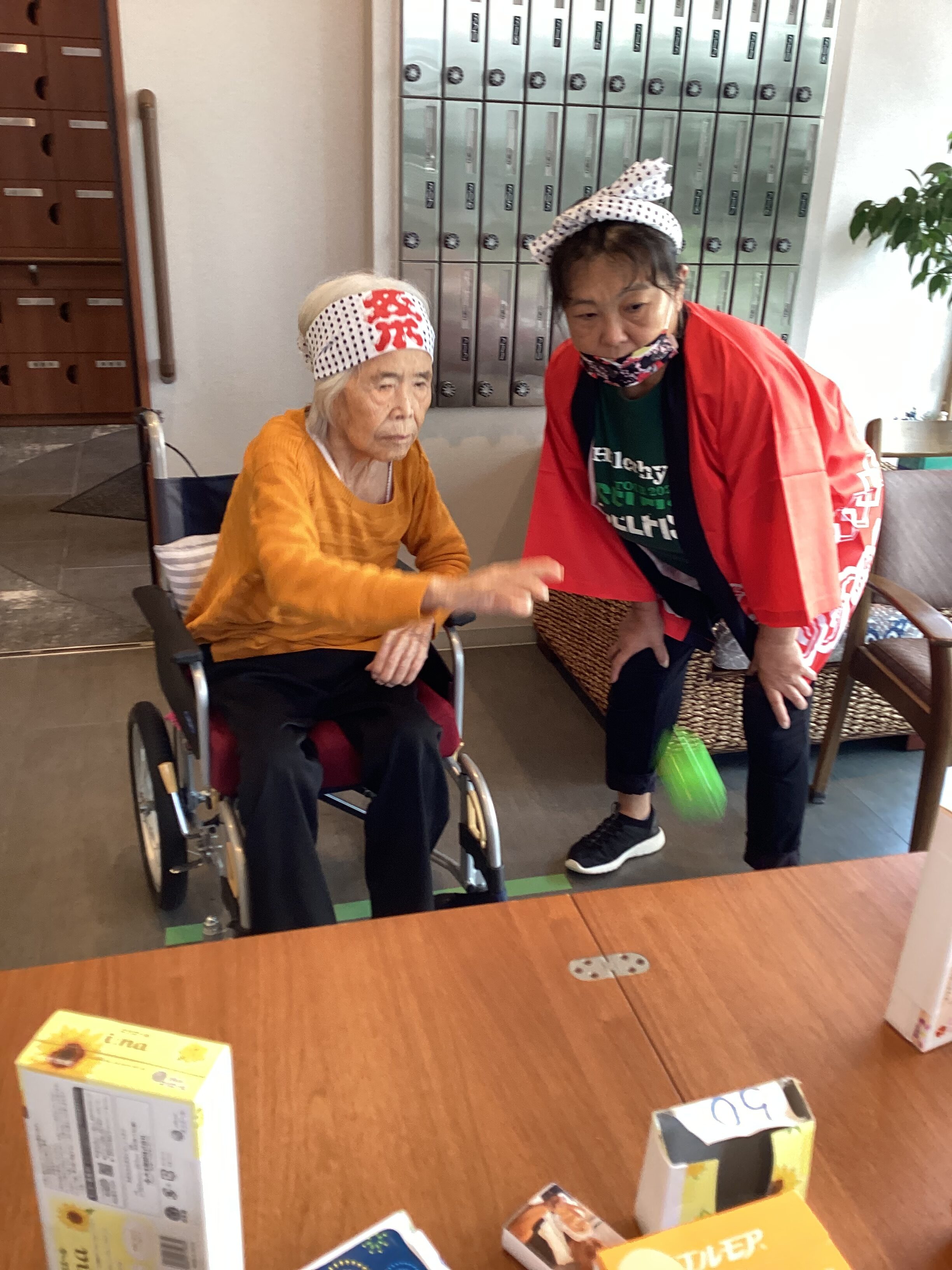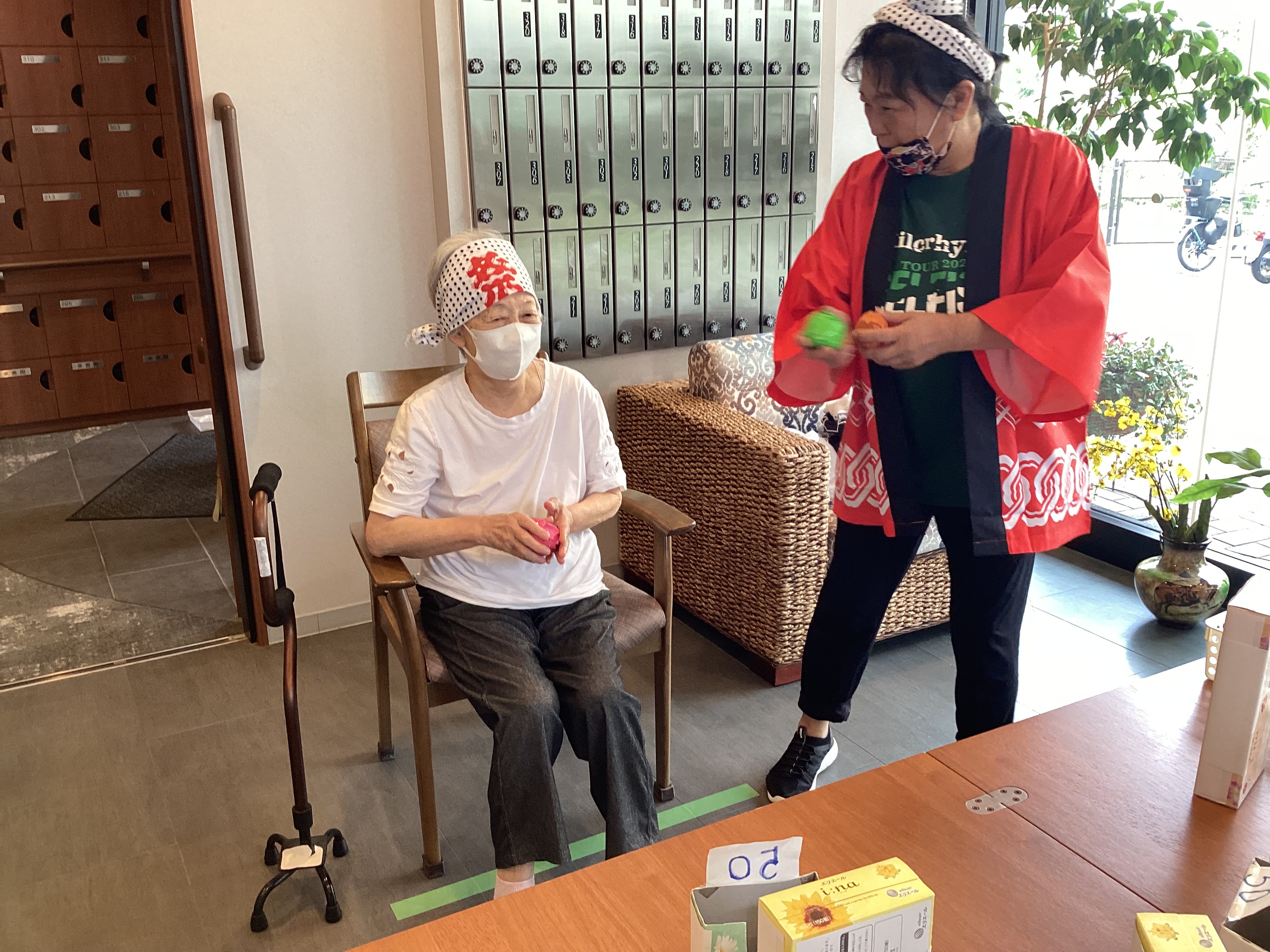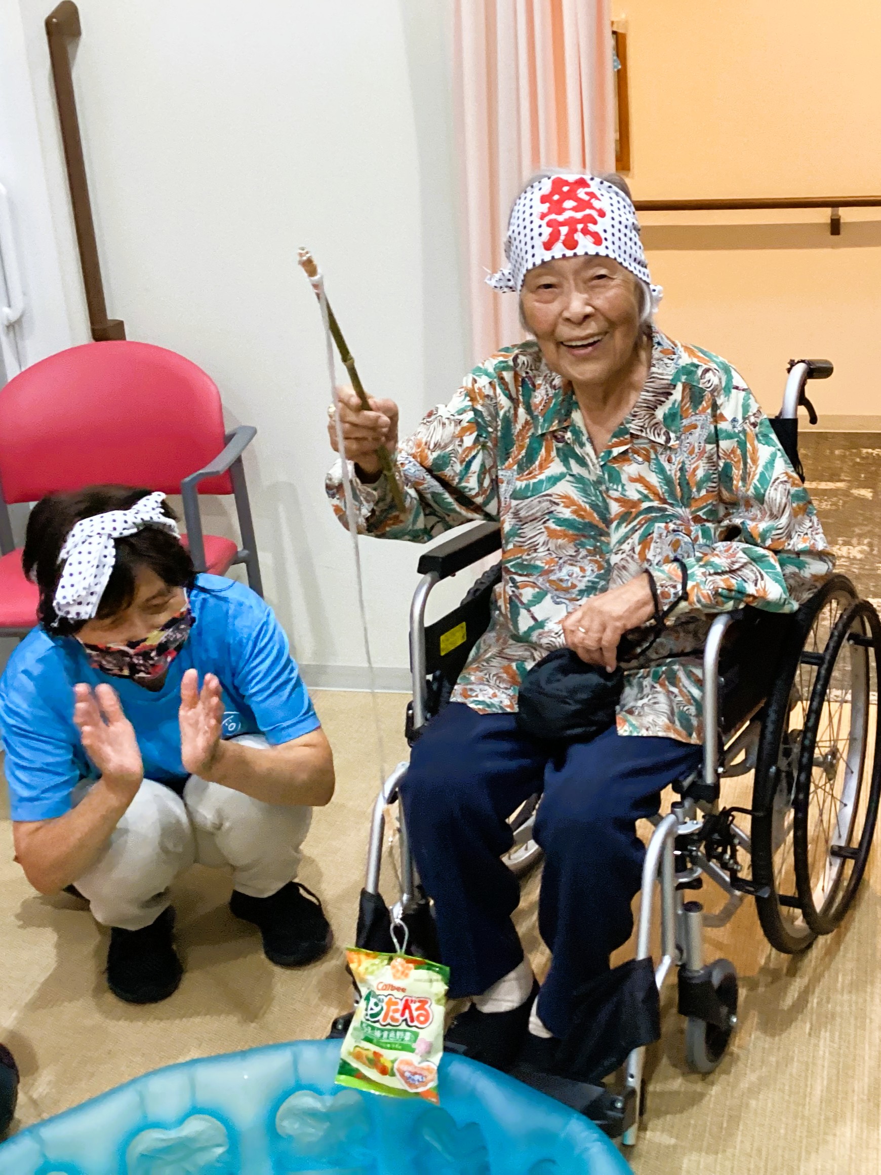 館内はお祭り仕様に設え、スタッフははっぴを着て、お祭り気分を盛り上げました。 ご入居者の皆さまのいい表情の写真がたくさん撮れましたのでご覧下さいませ。 まずはゲームコーナーの「的当て」と「お菓子釣り」の写真です。