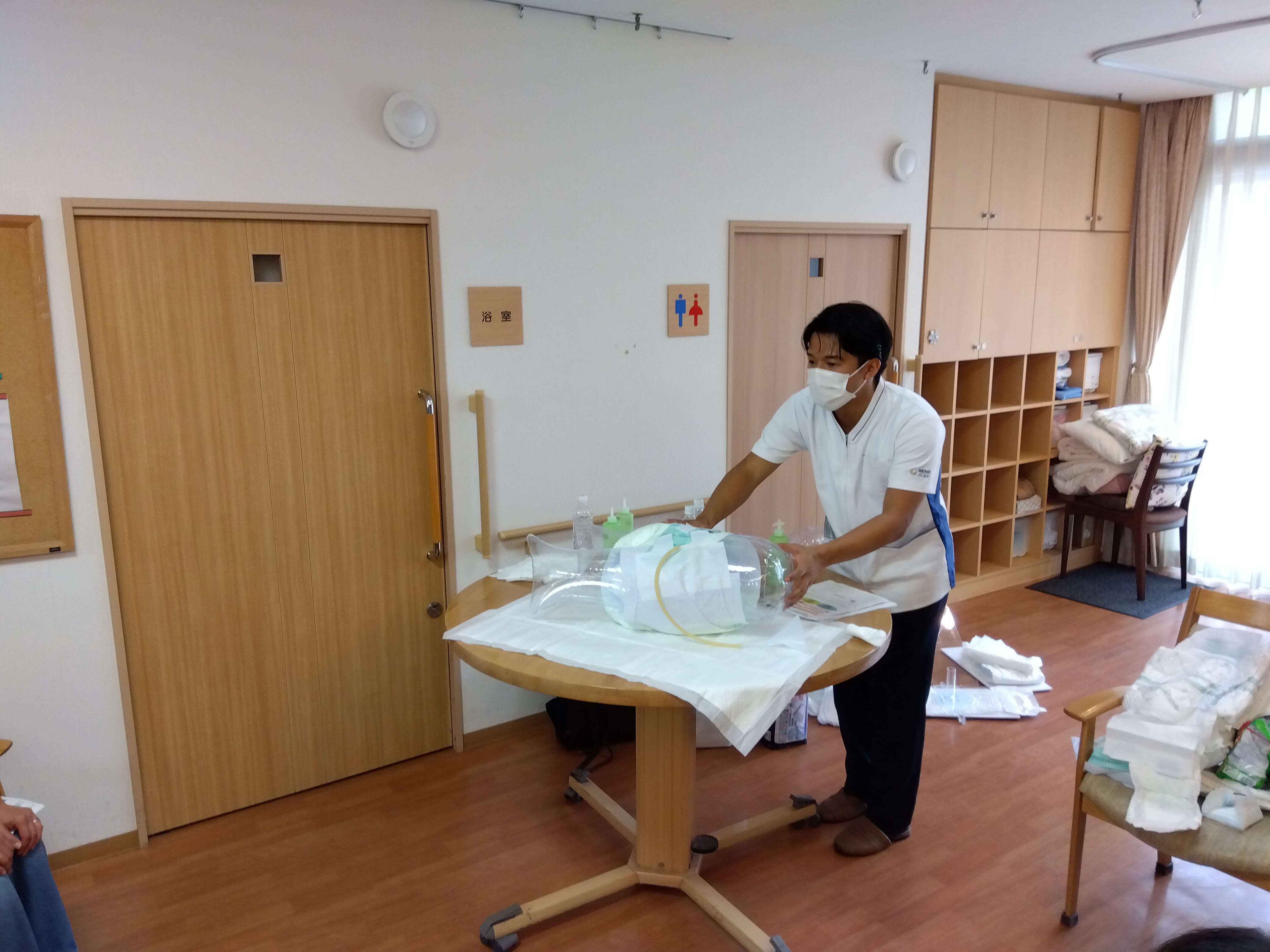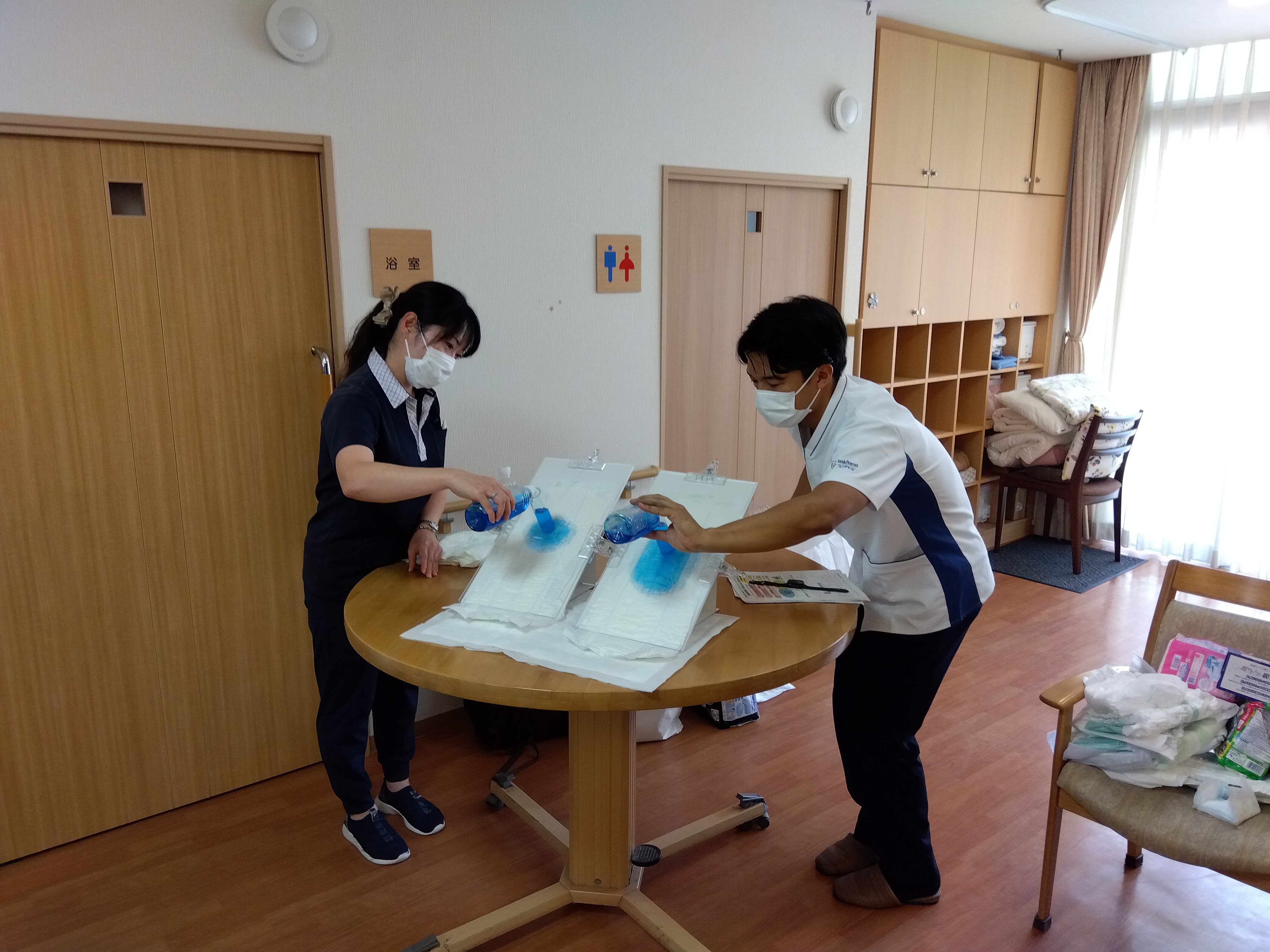 ユニ・チャームの方に来ていただき実際に皆様にリハビリパンツやオムツを装着していただき、日々皆様がどのように過ごされているのかを体験していただきました。
