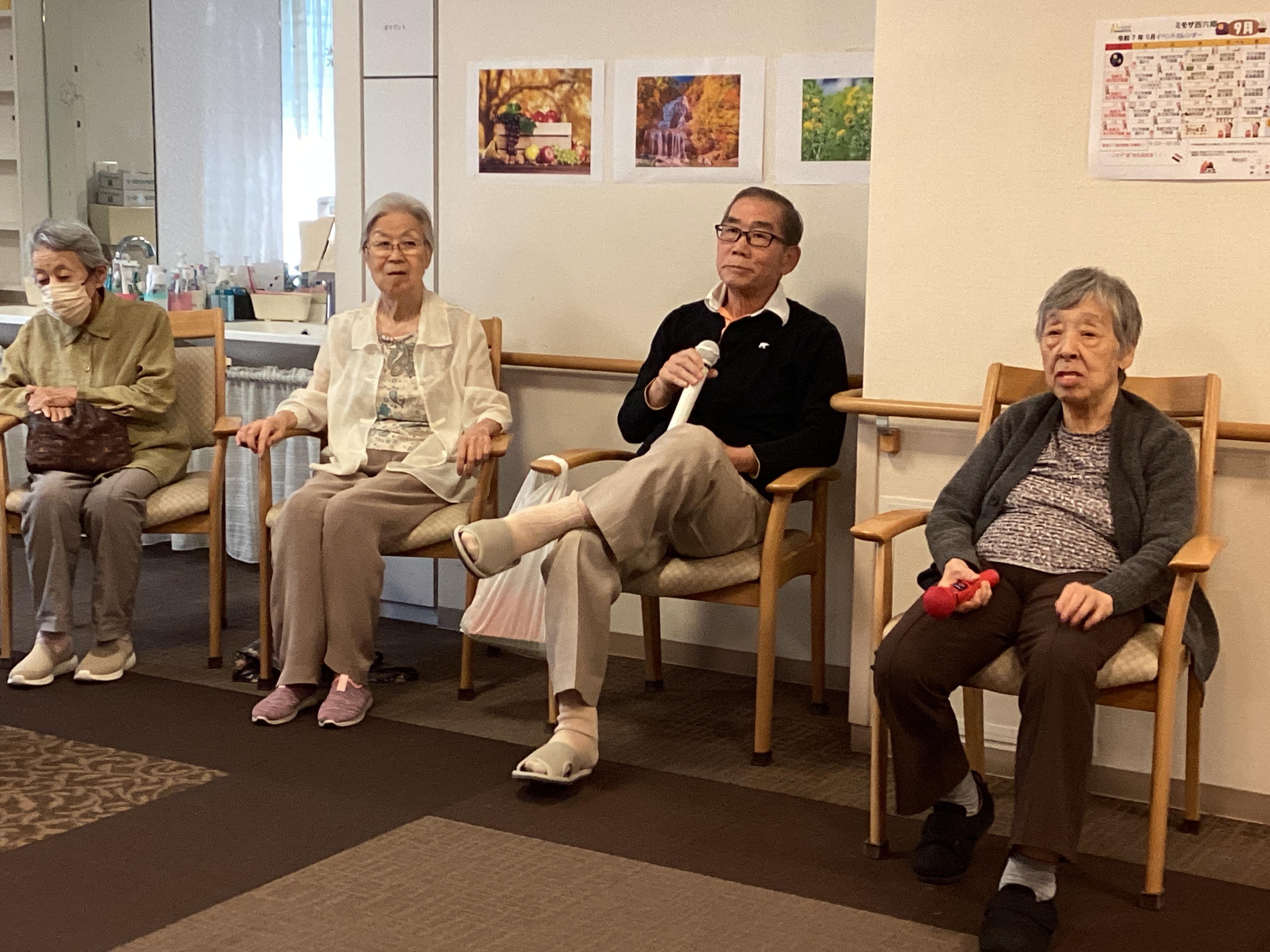 朝晩の気温差にだんだんと秋の足音が聞こえ始めてきましたね。ミモザでは毎週土曜日にカラオケを実施しています!皆様とても楽しみにされておりほかの人の歌唱に聞き入っています。「青い山脈」や「高校三年生」などは皆様で歌って楽しまれています。