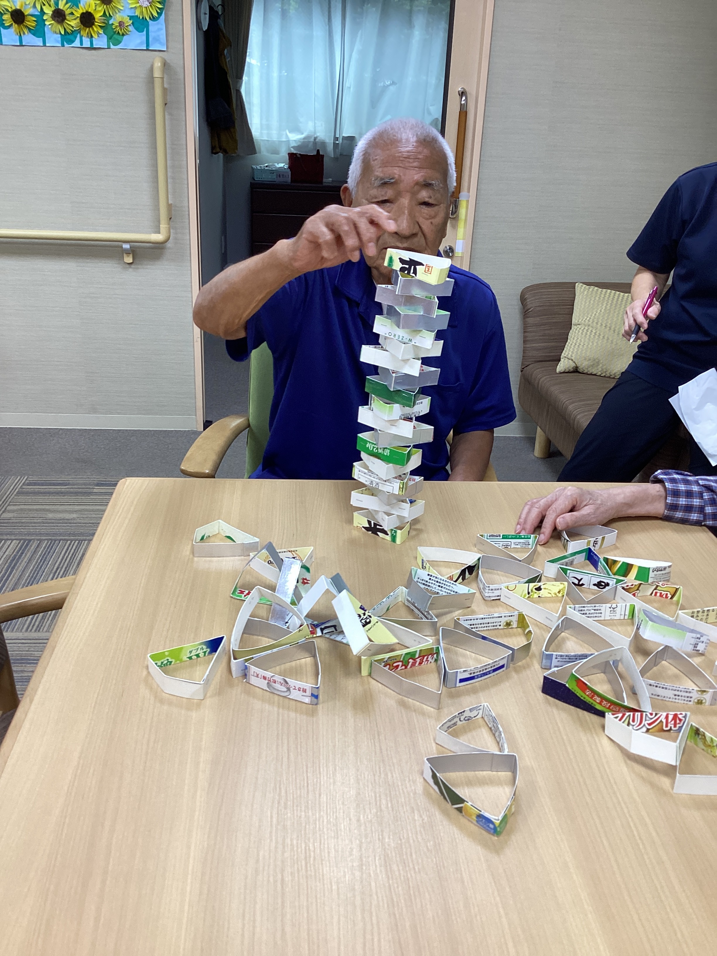 三角輪っか積み📐一つひとつ丁寧に積み上げながらバランスを崩さないように真剣な表情で挑戦されていました🤨周りからも応援されながら見事に積みあがると皆さん拍手され笑顔がみられました😆👏🏻ハラハラドキドキしながら楽しみました✨