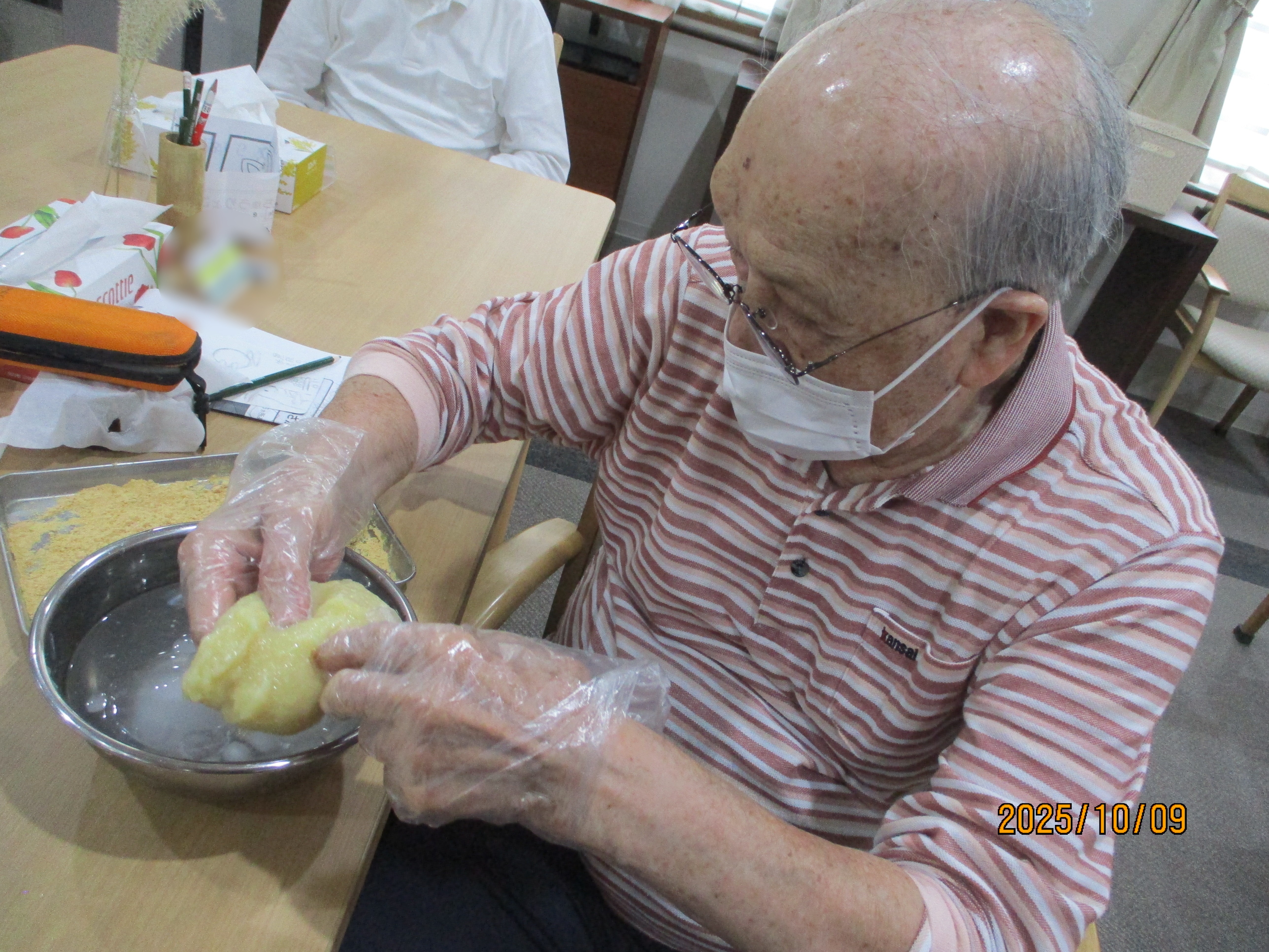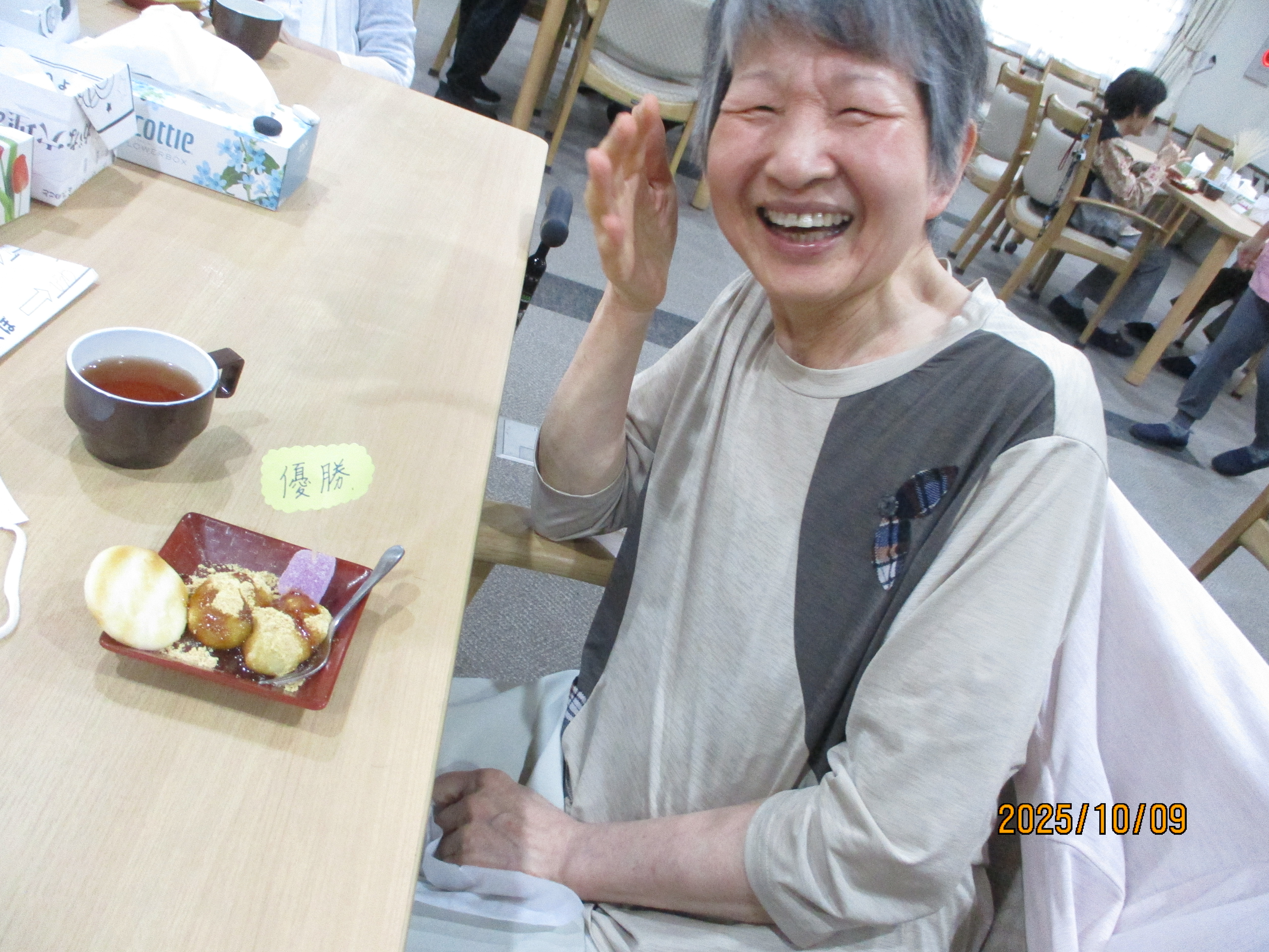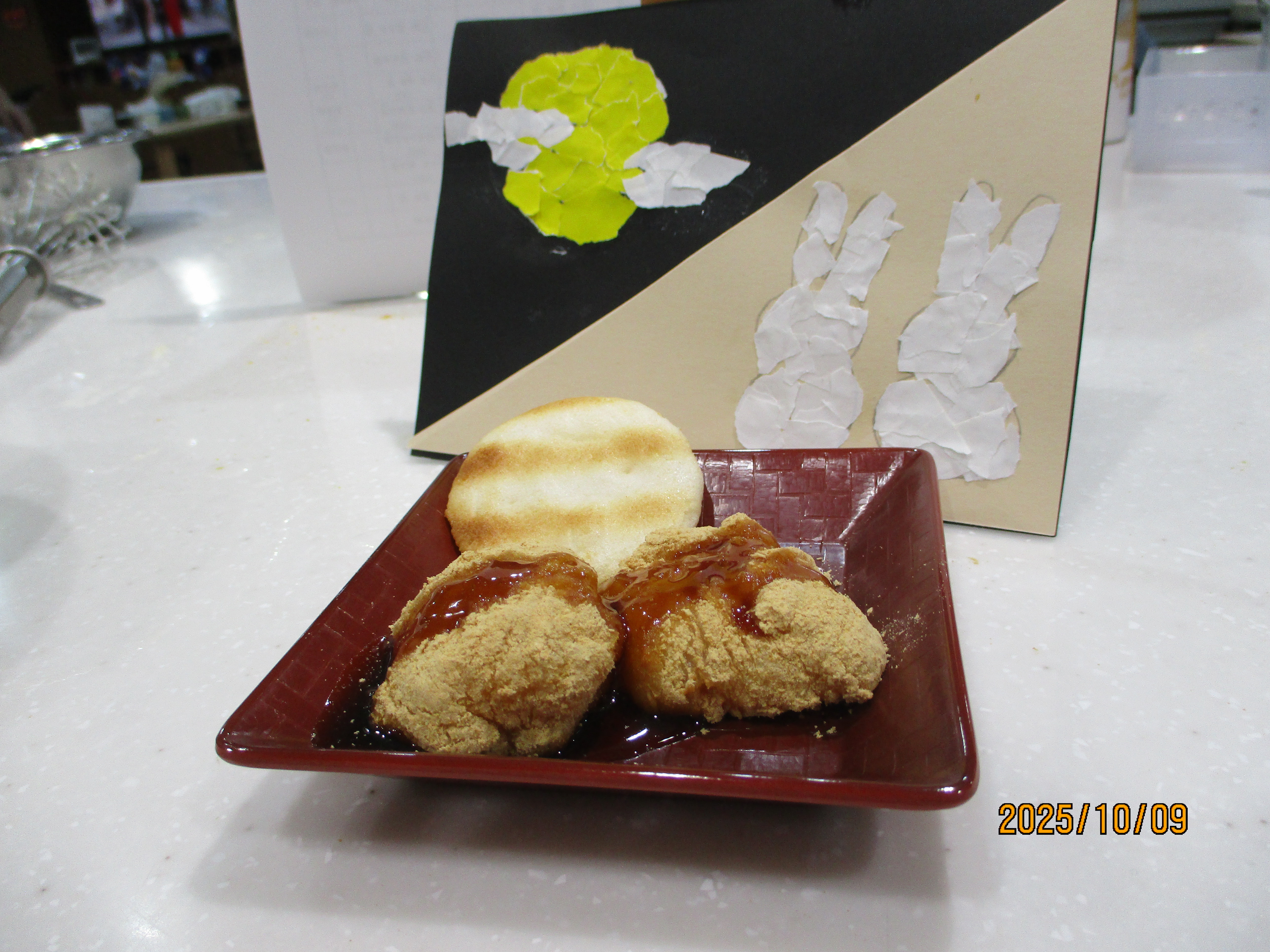 ピンポン玉(お月様)を使ったレクリエーションで皆さま盛り上がりました!! おやつは、職員とご利用者で手作りしたお月見団子でした!!皆様、美味しく召し上がっておられました!!