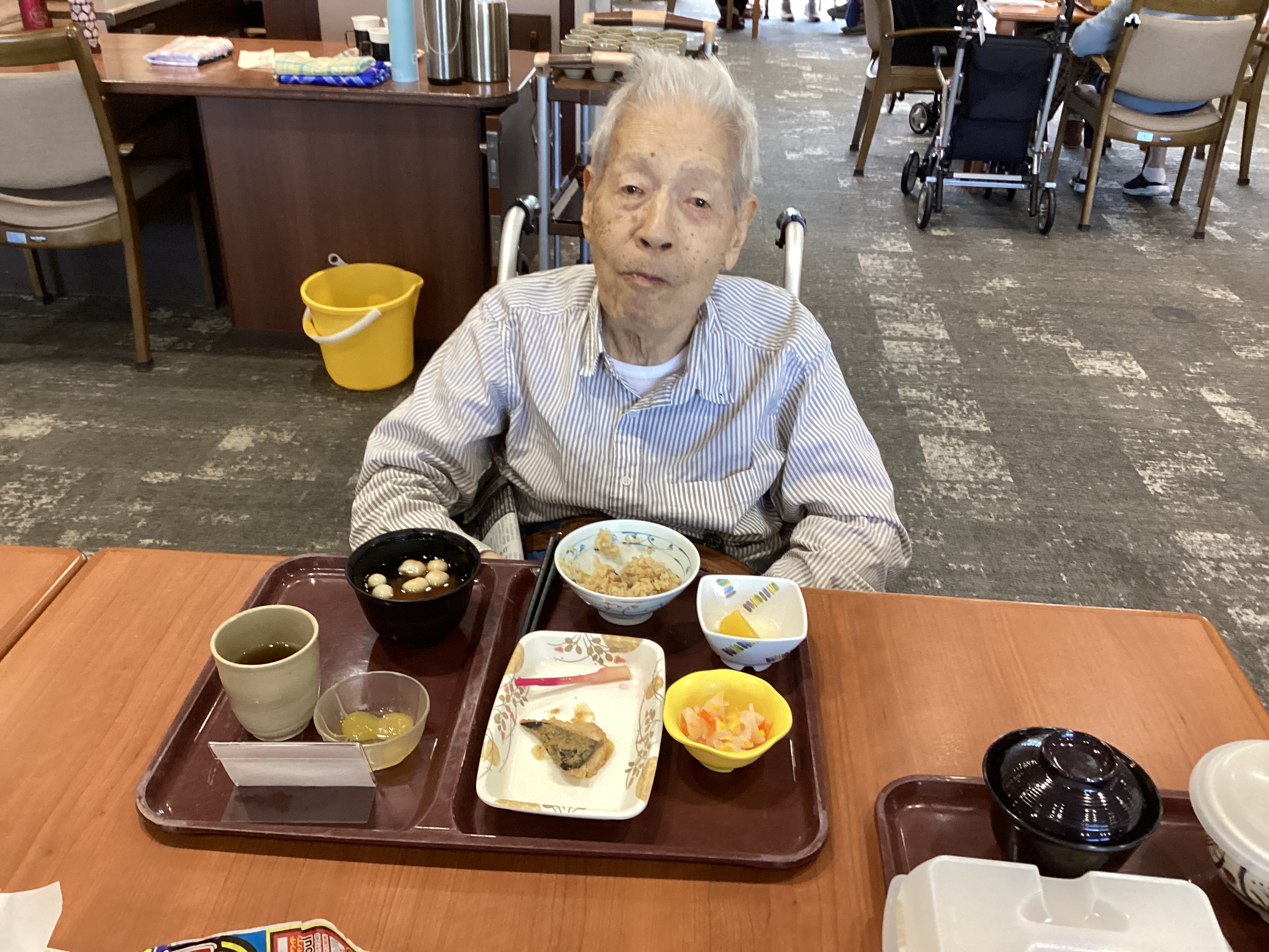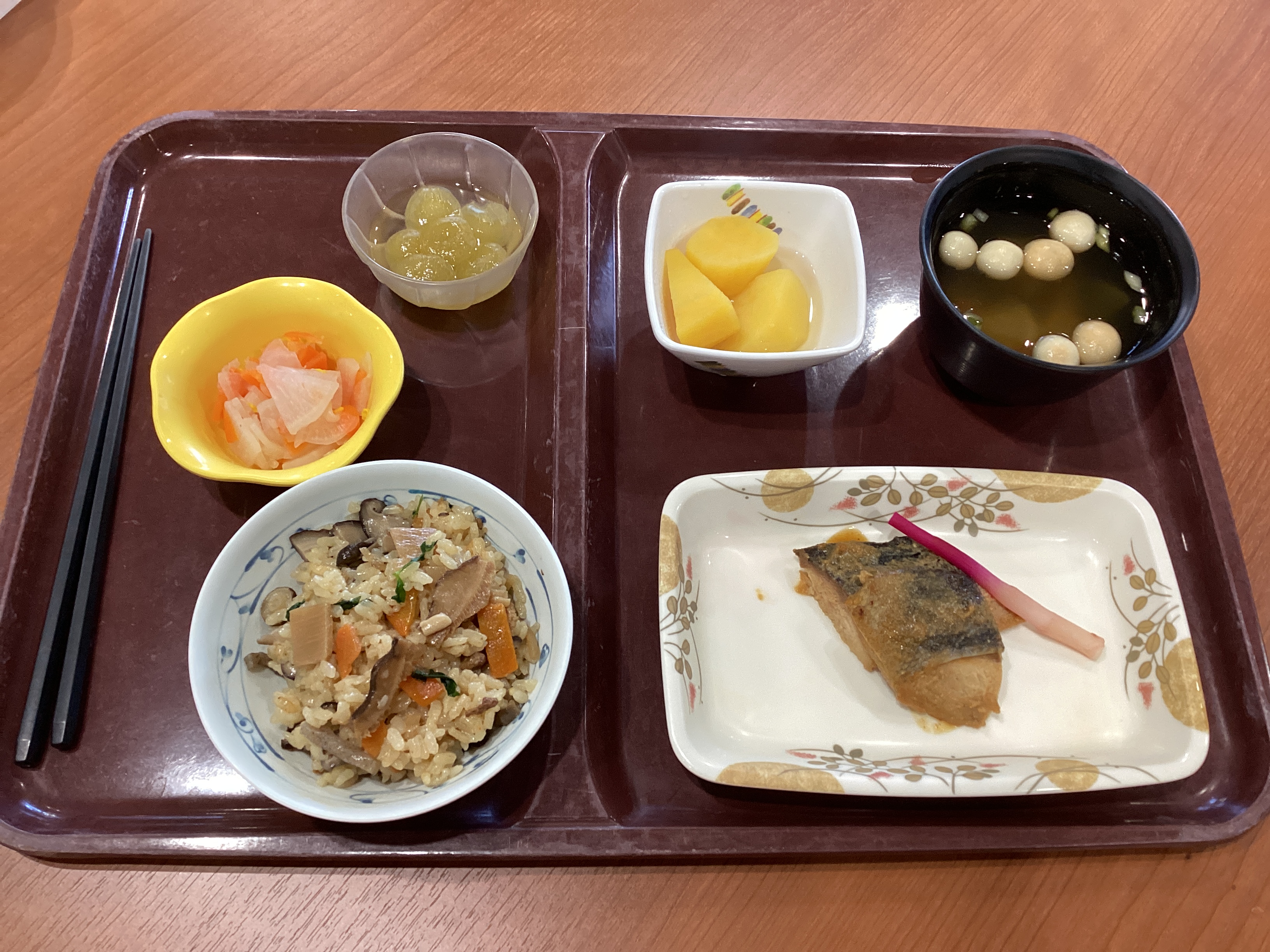 秋のおこわ、月見汁、サケのみそ焼き、サツマイモのレモン煮、大根と菊の酢の物、フルーツ