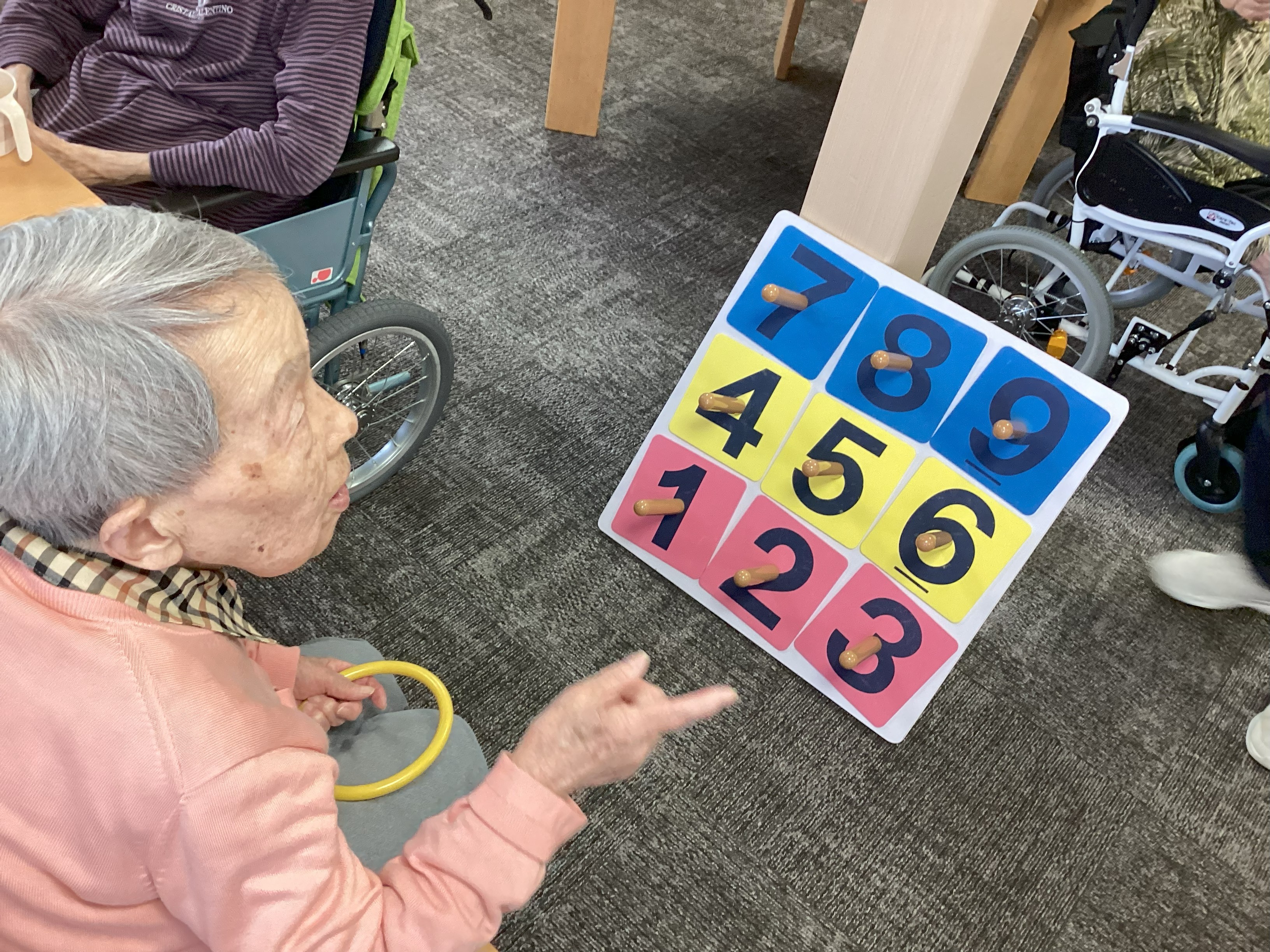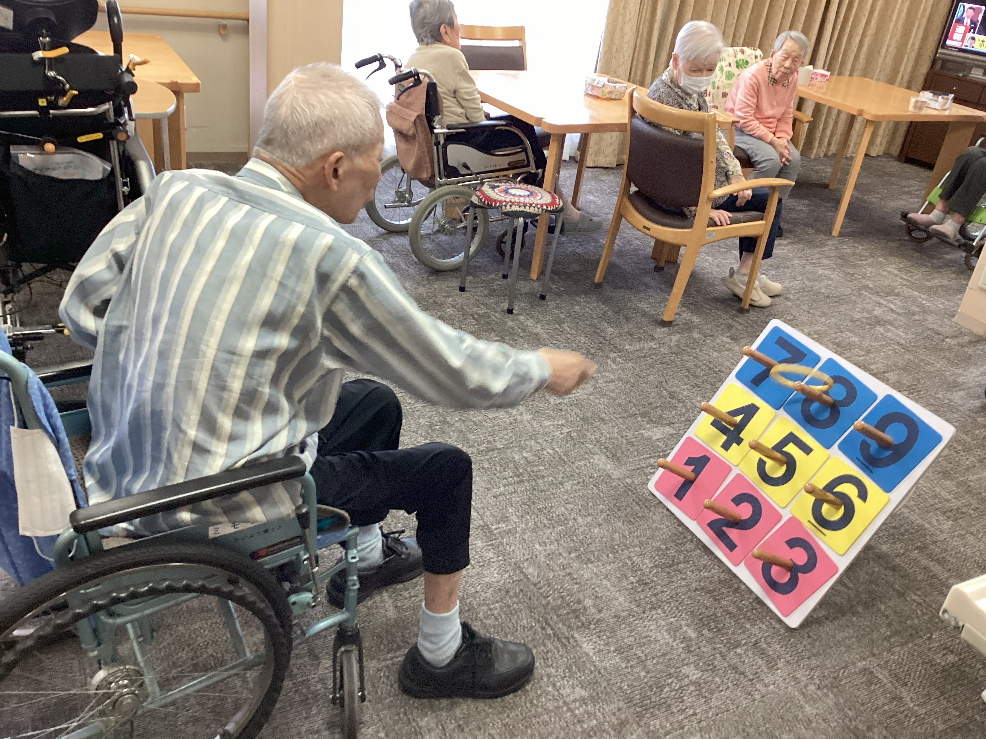 スポーツの秋に、歩けなくても輪投げならできる!と、皆さま一生懸命腕を動かしました。