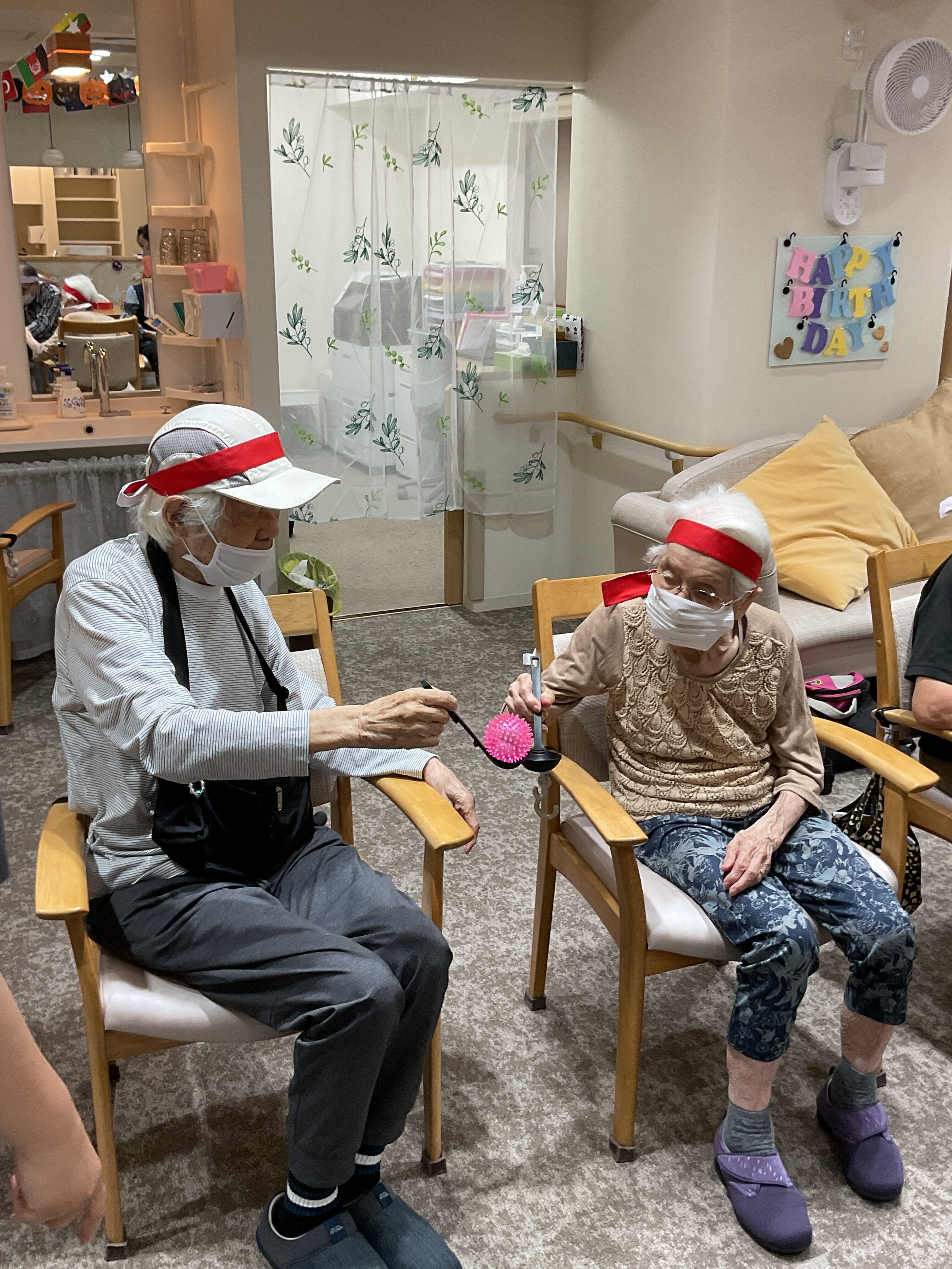 おたまを使い、チクチクボールを落とさぬように送るというとても団結力が試される競技になります🧑🤝🧑