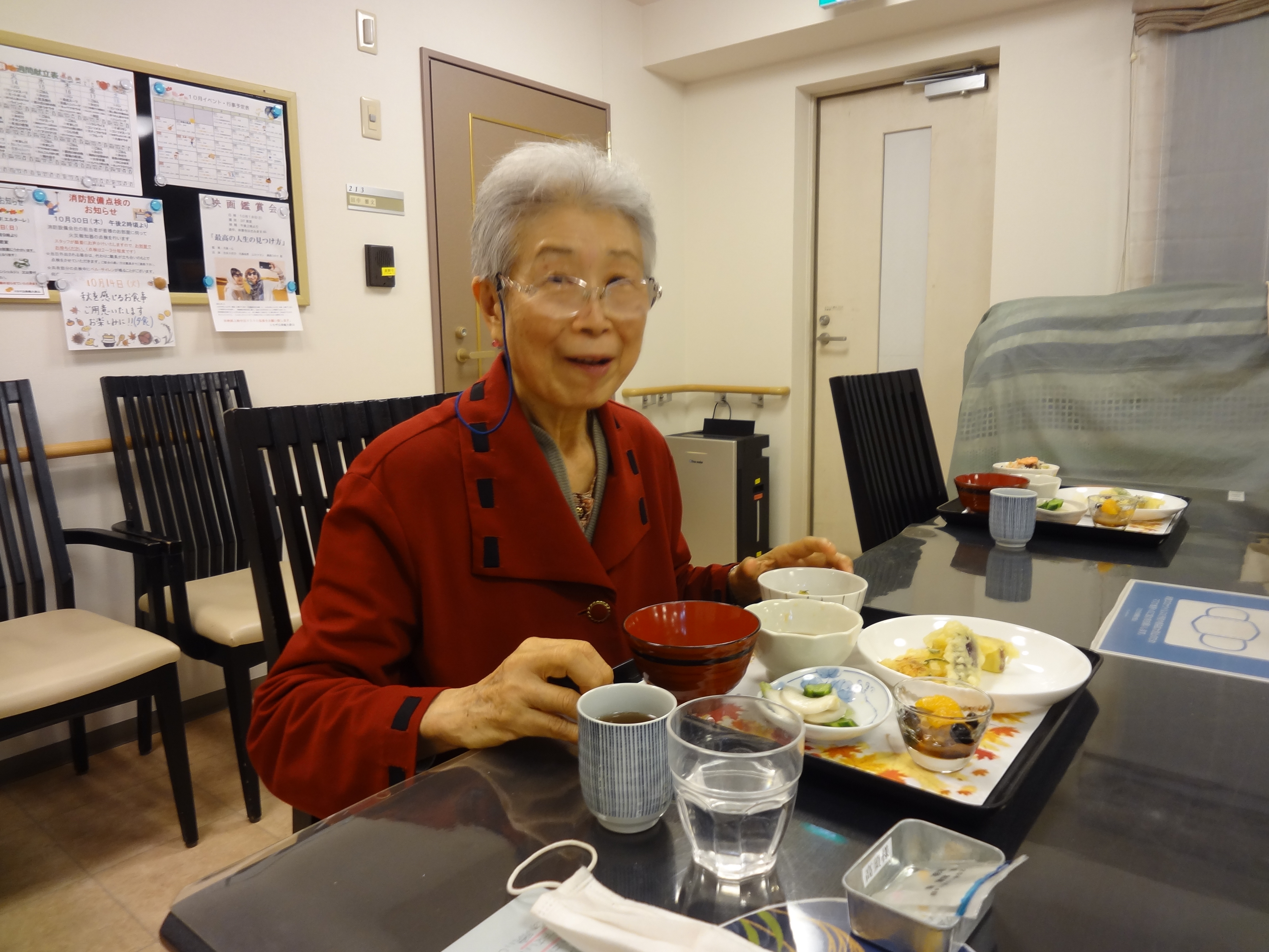 ご利用者の皆様のご希望でてんぷらをお夕食に出しました。 秋の混ぜご飯は鮭としめじです。 皆様の笑顔が沢山なイベント食!大成功でした。