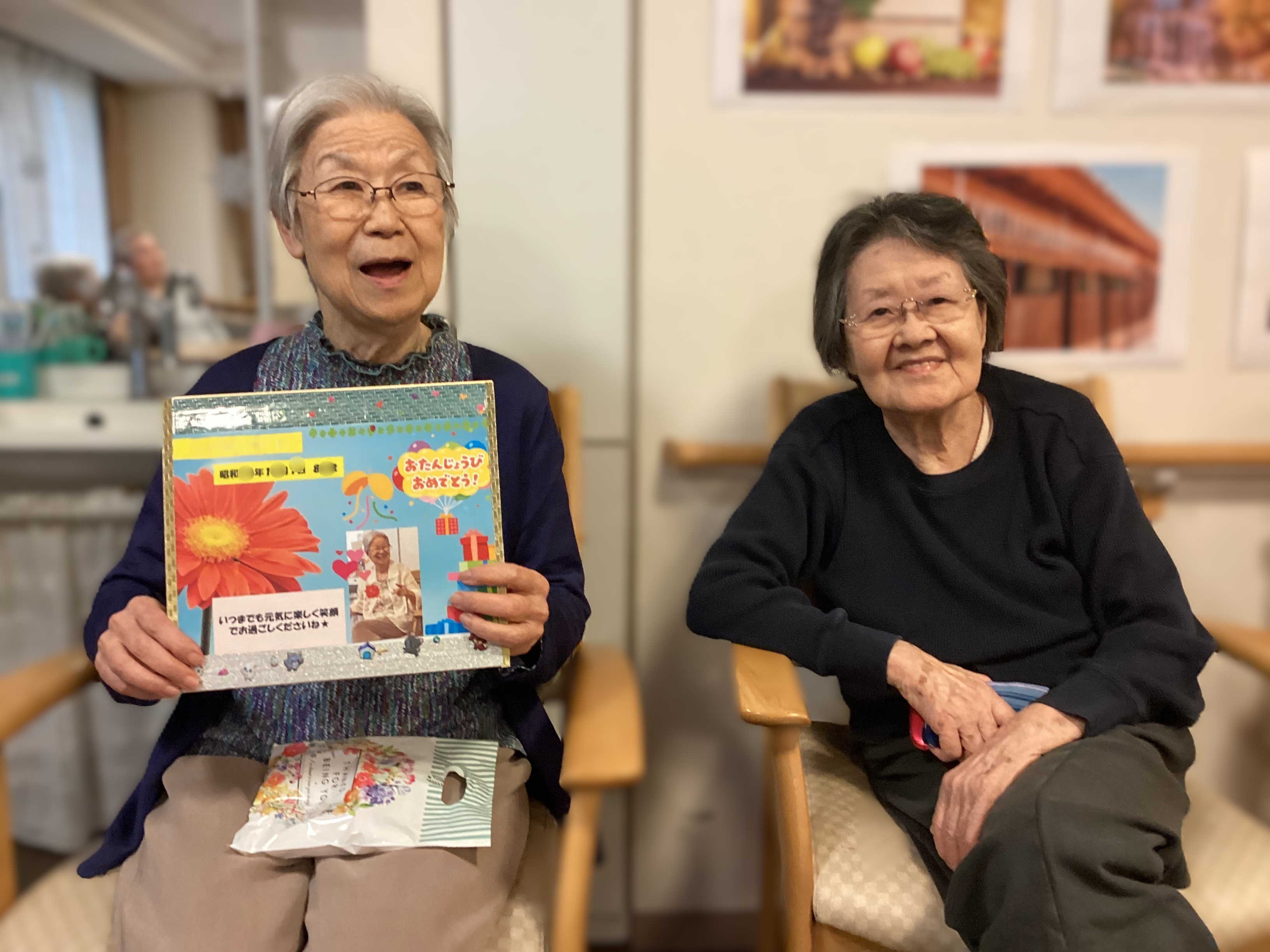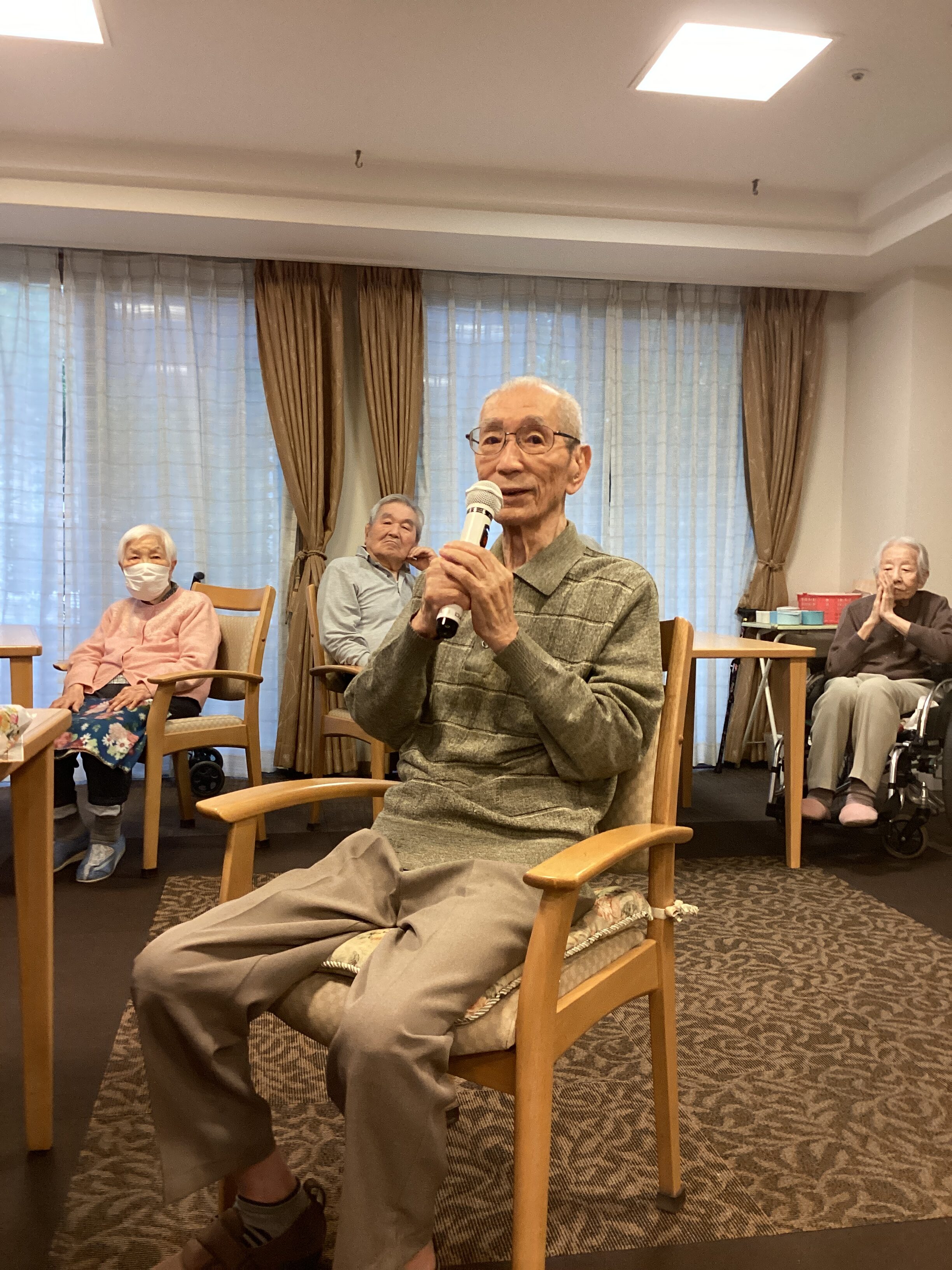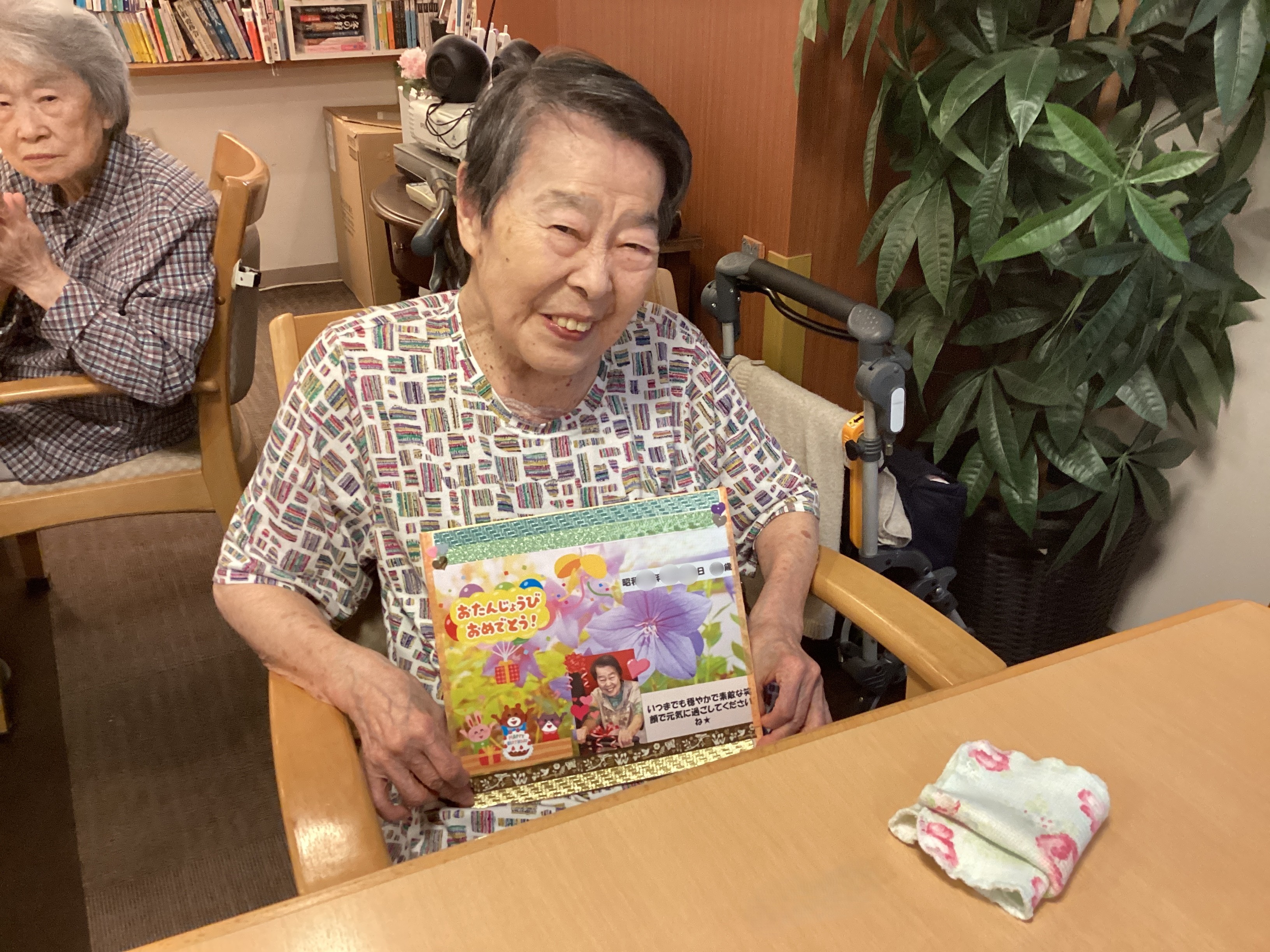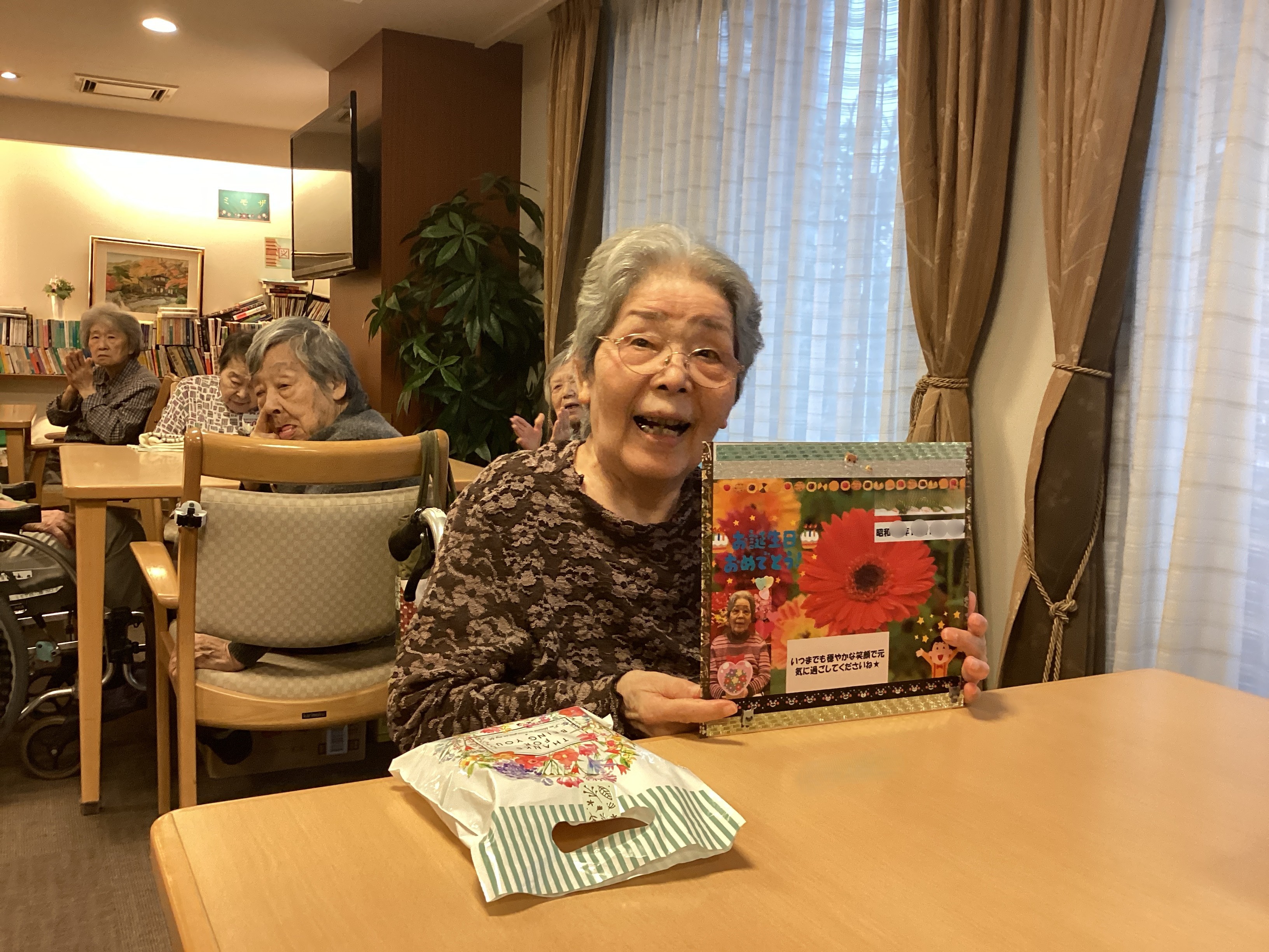 今月のお誕生日会では当施設内での一番のご長寿さんがまた一つ年を重ねられました!皆さん一言コメントをいただくと照れながらもしっかりと感謝を述べられていました。ケーキは皆さん「美味しい美味しい」と喜んで食べられていました。