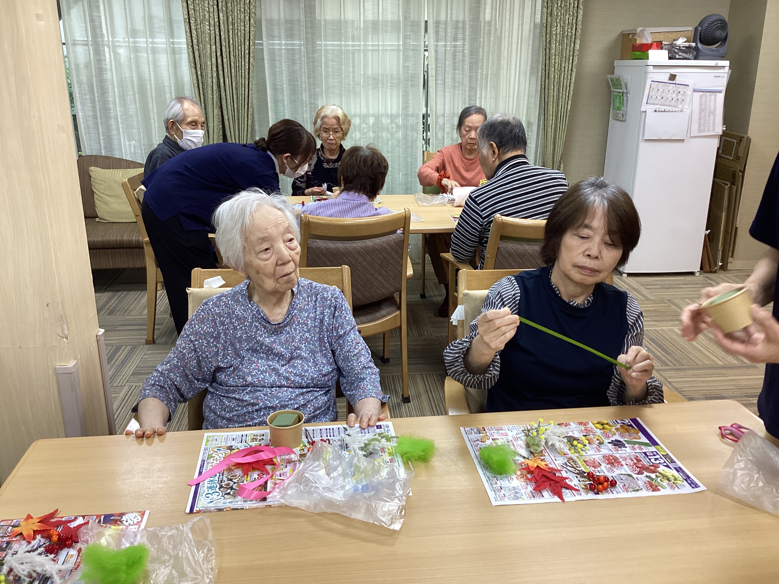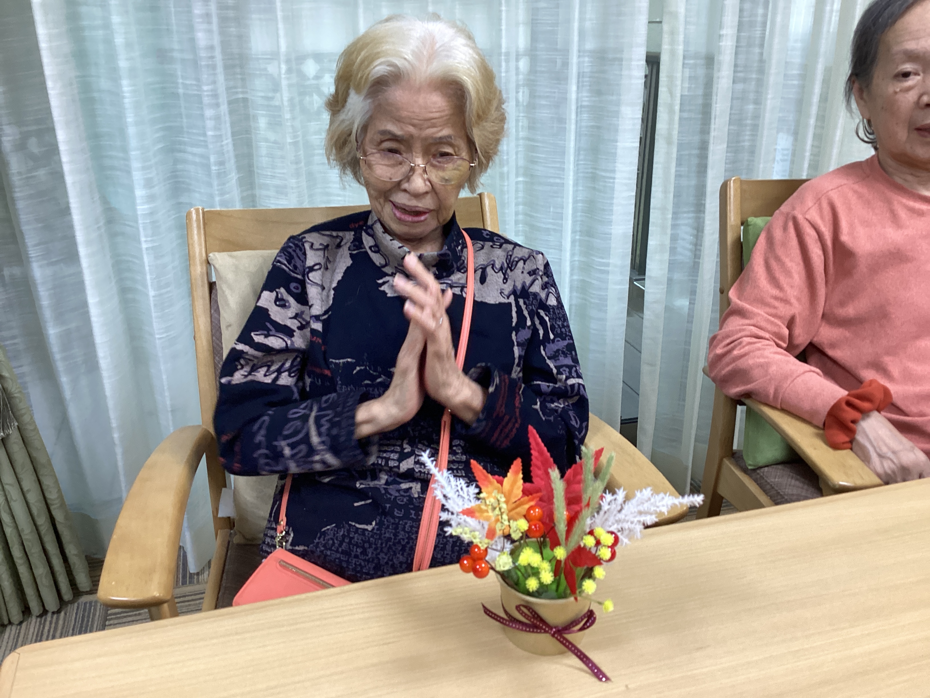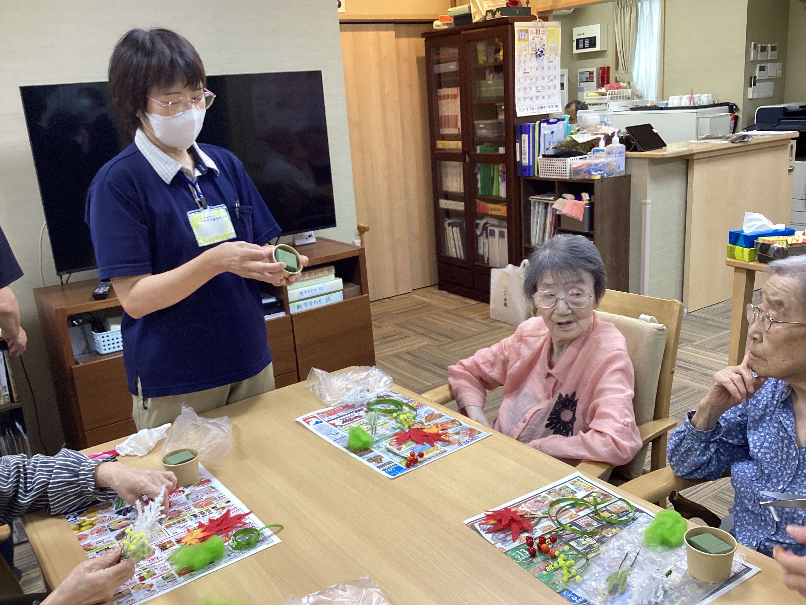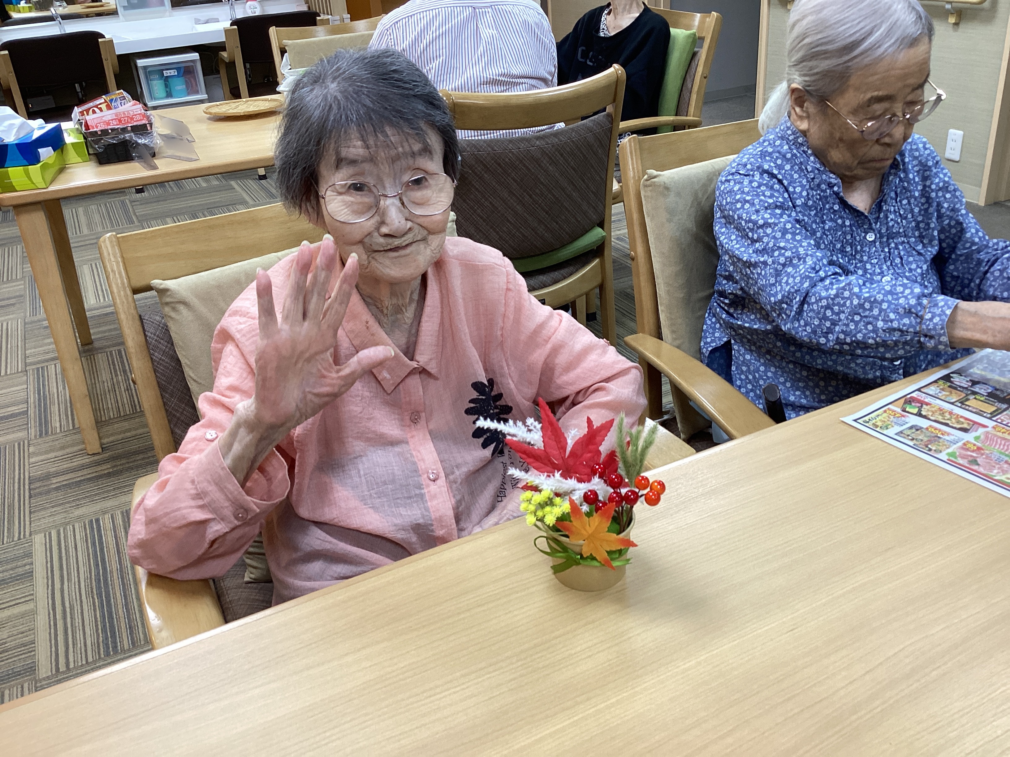秋のフラワーアレンジメントを行いました!紅葉の葉や木の実を使い、それぞれ個性あふれる素敵な作品が完成しました✨皆さん迷いながらも真剣な表情で作成され🤔秋の訪れを感じられる時間となりました🍁