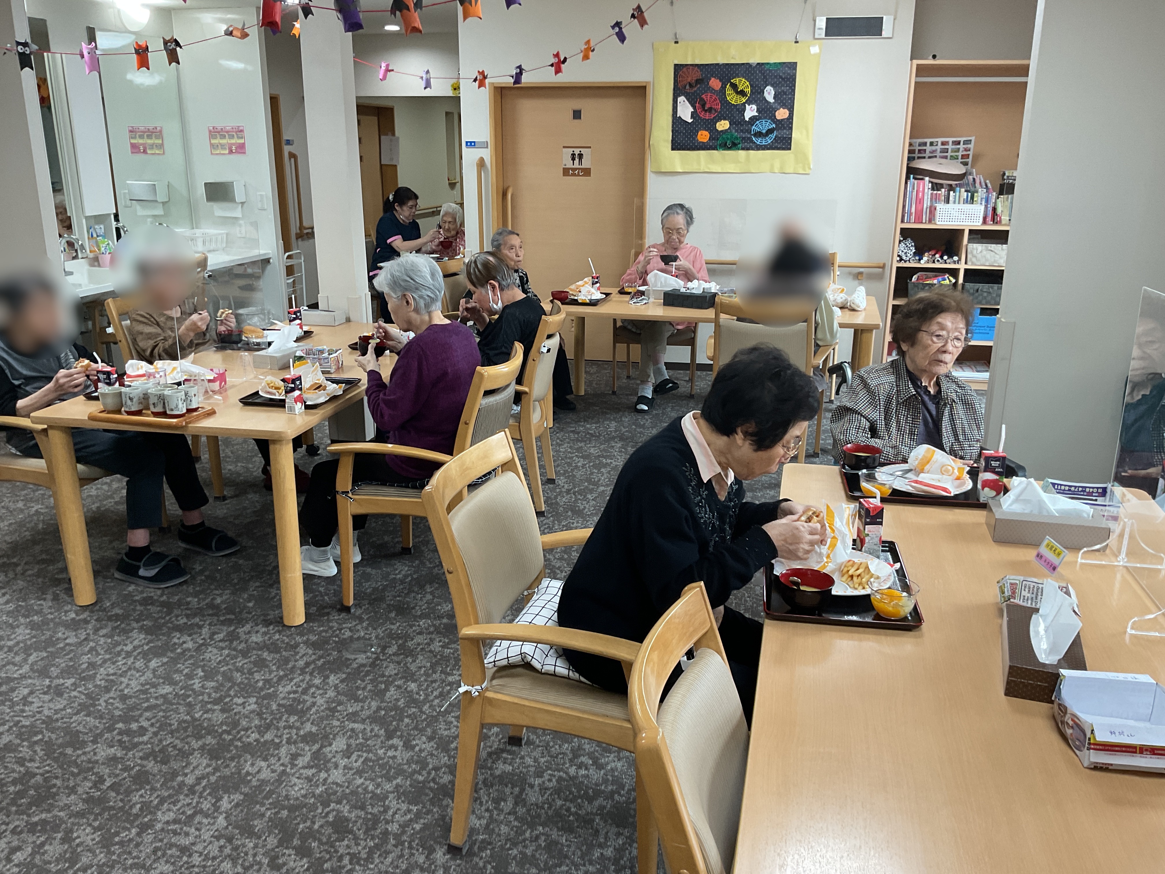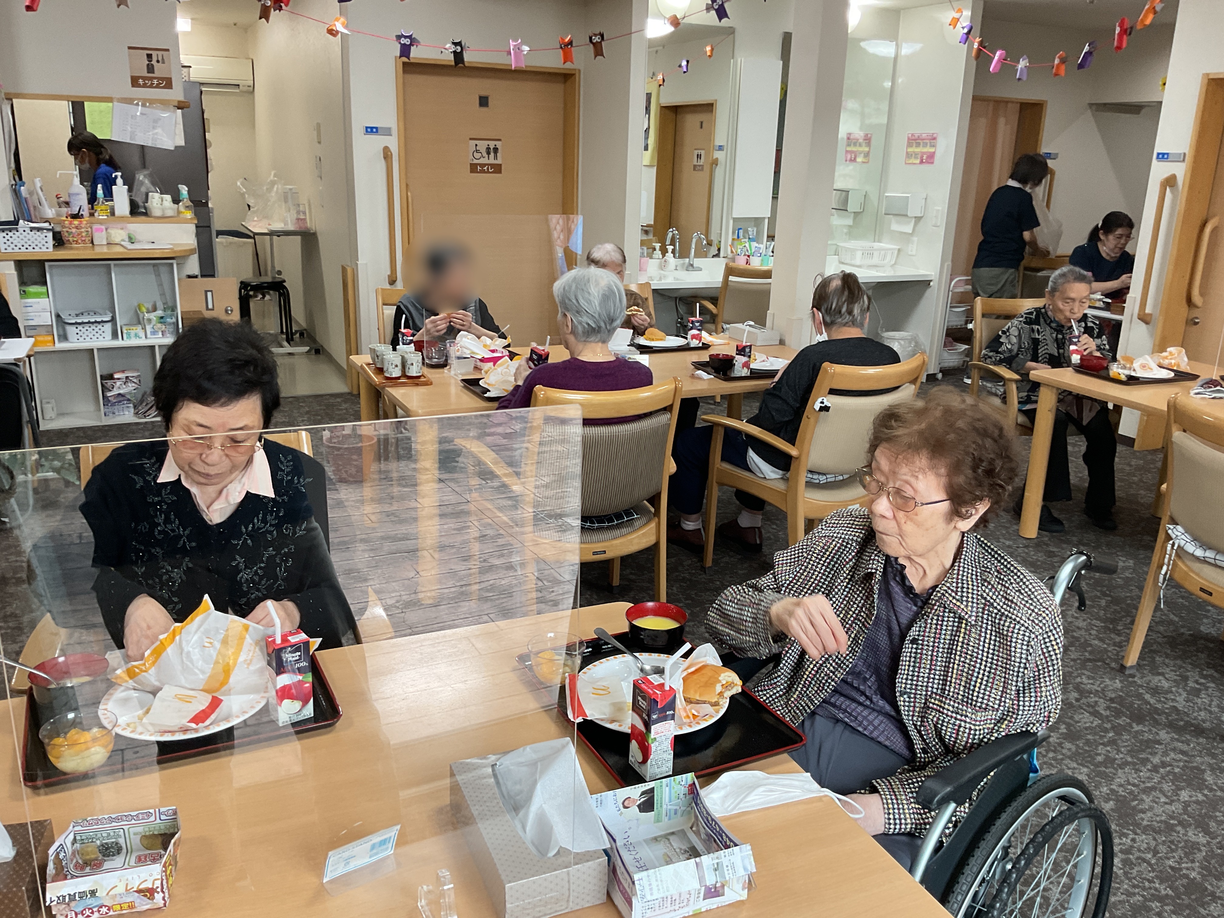 今日のお昼ご飯はハンバーガー! いつも食べているご飯とは違う味を楽しみました。
