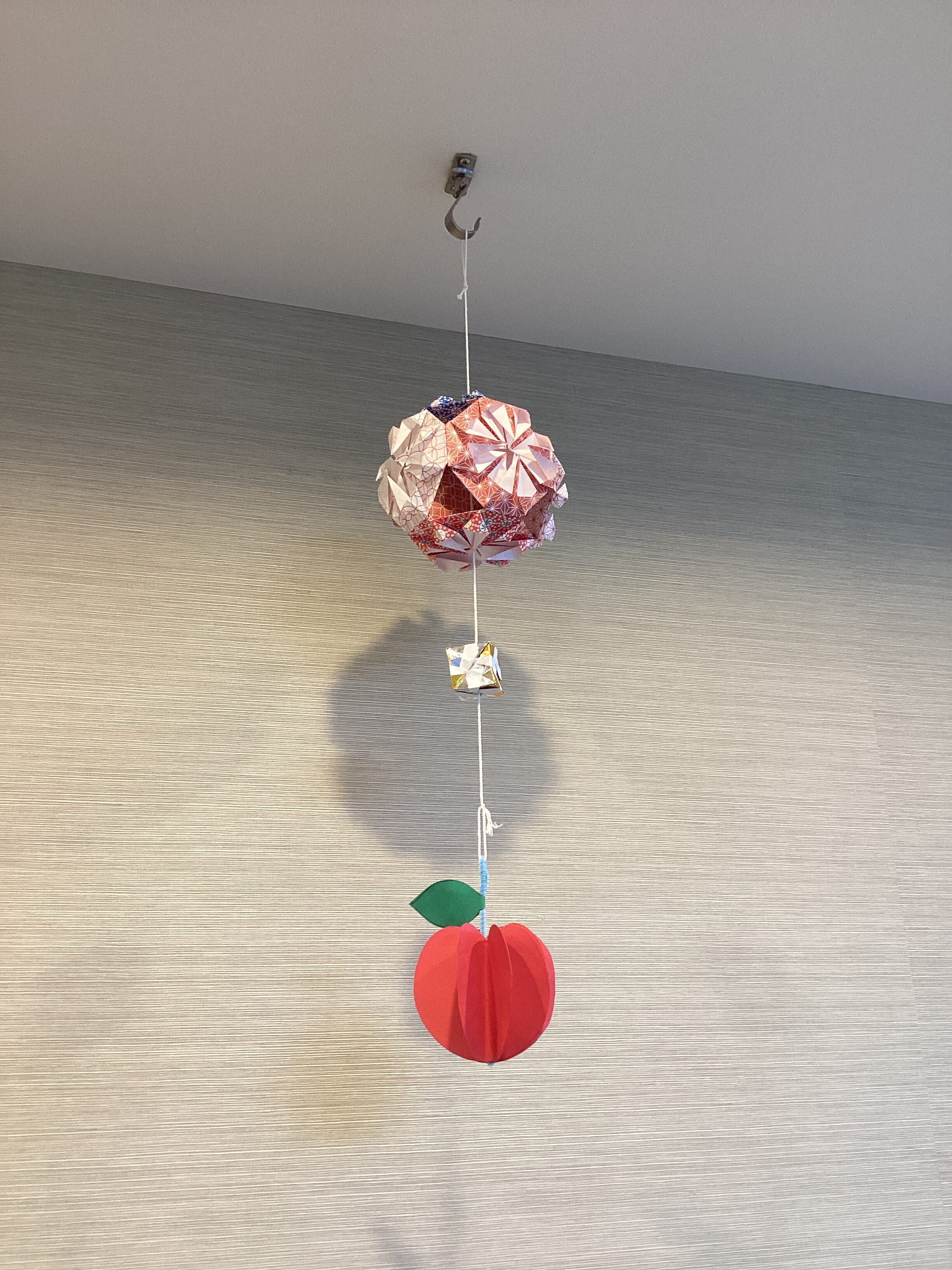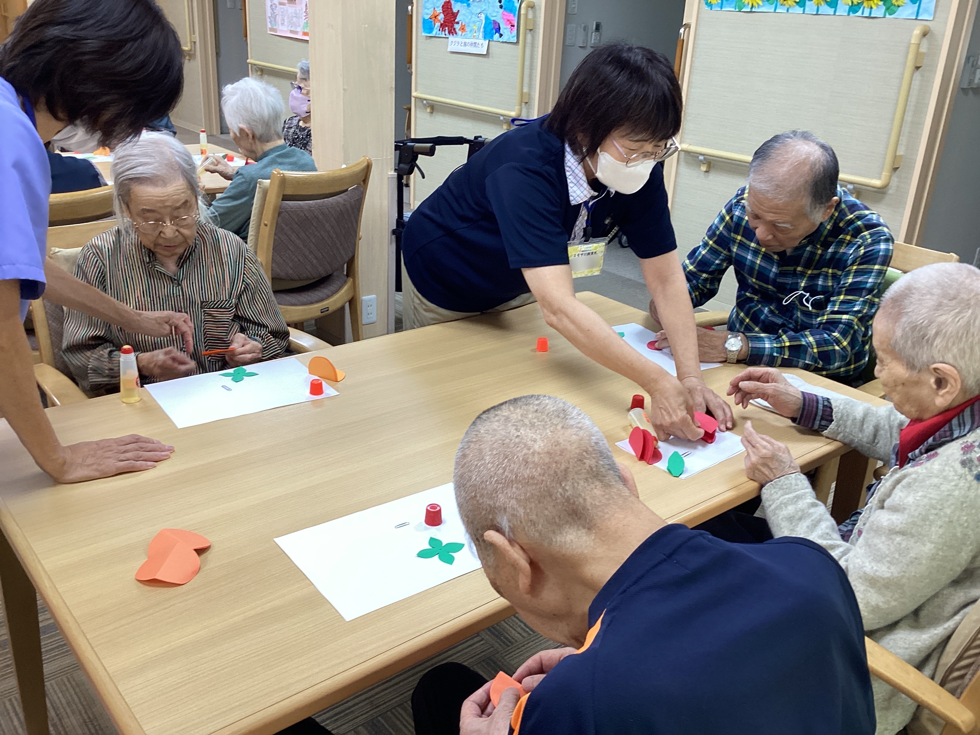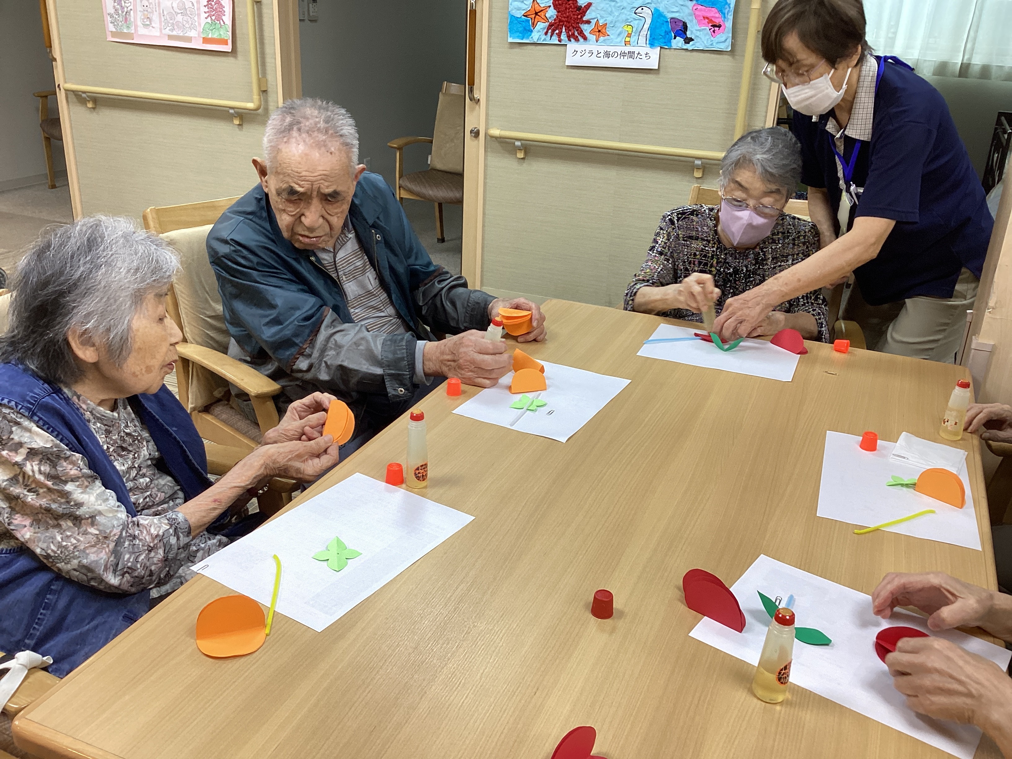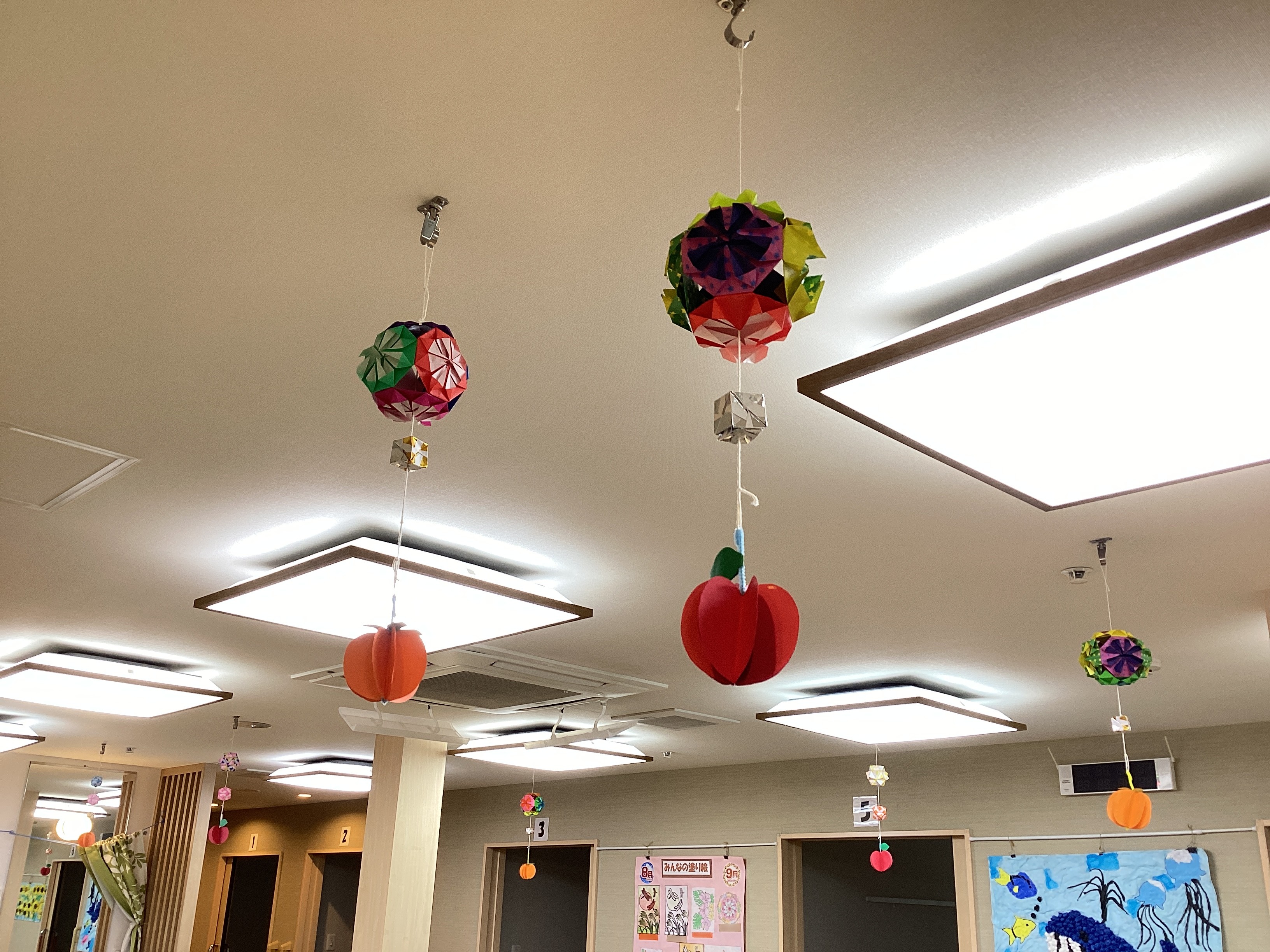 本日は林檎と柿の吊り飾りを作成しました🍎職員の手を借りながら丁寧に作る皆さんの表情はとても真剣で、完成した作品を天井から吊るすと「可愛いね!」と笑顔に😊秋らしい作品に囲まれ施設内が明るくなりました🤗🍂