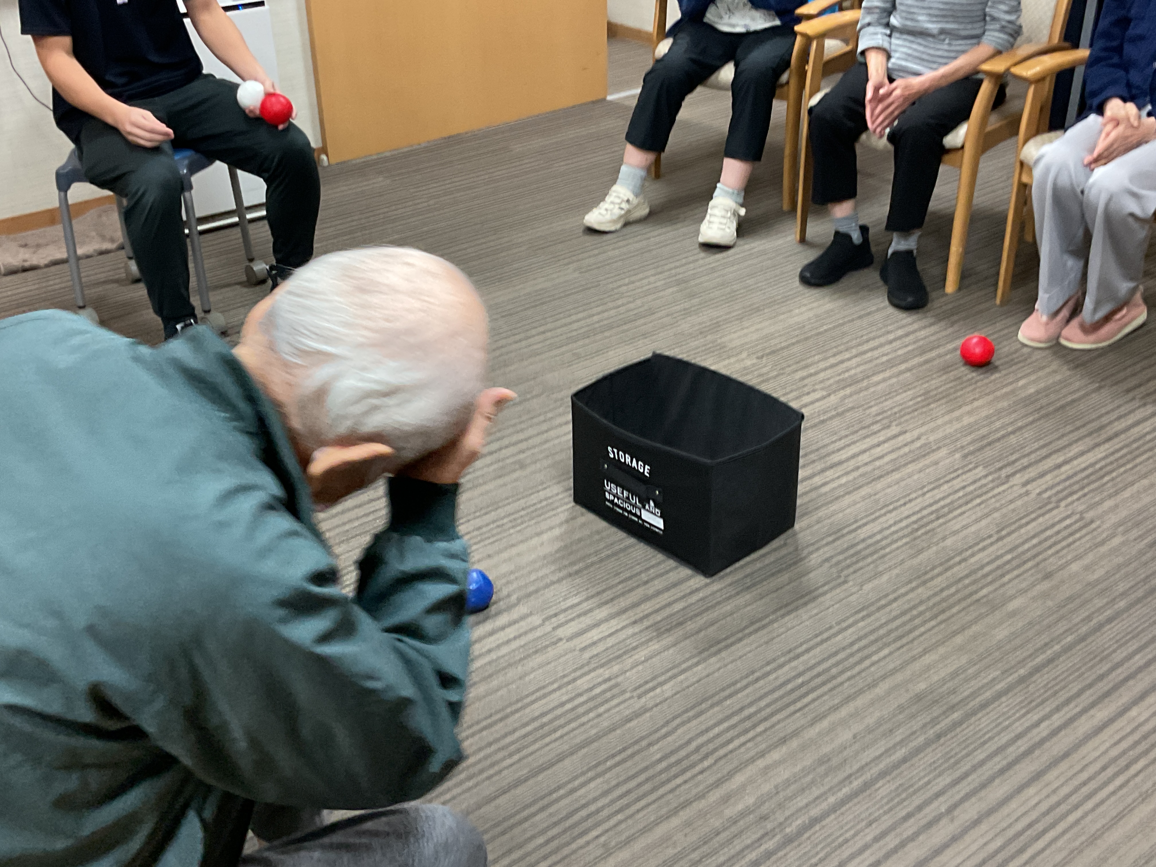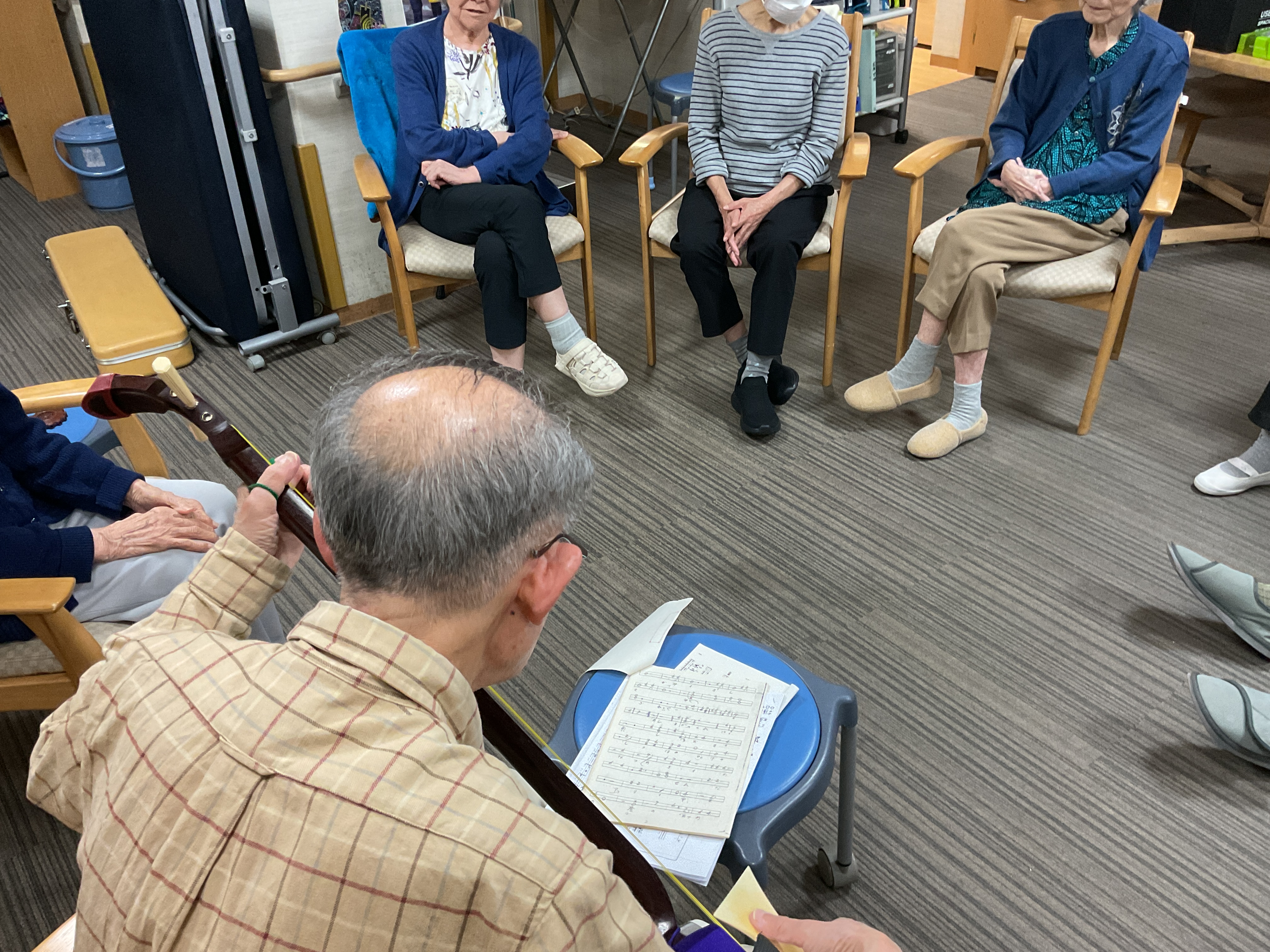 白いボールを先に落とした方が勝ち!赤・青チームに分かれて対戦しました(^^) カゴになかなかボールが入らず悔しそうでした、、、 三味線と長唄を皆さんに披露して下さいました!職員もご利用者も感動です!