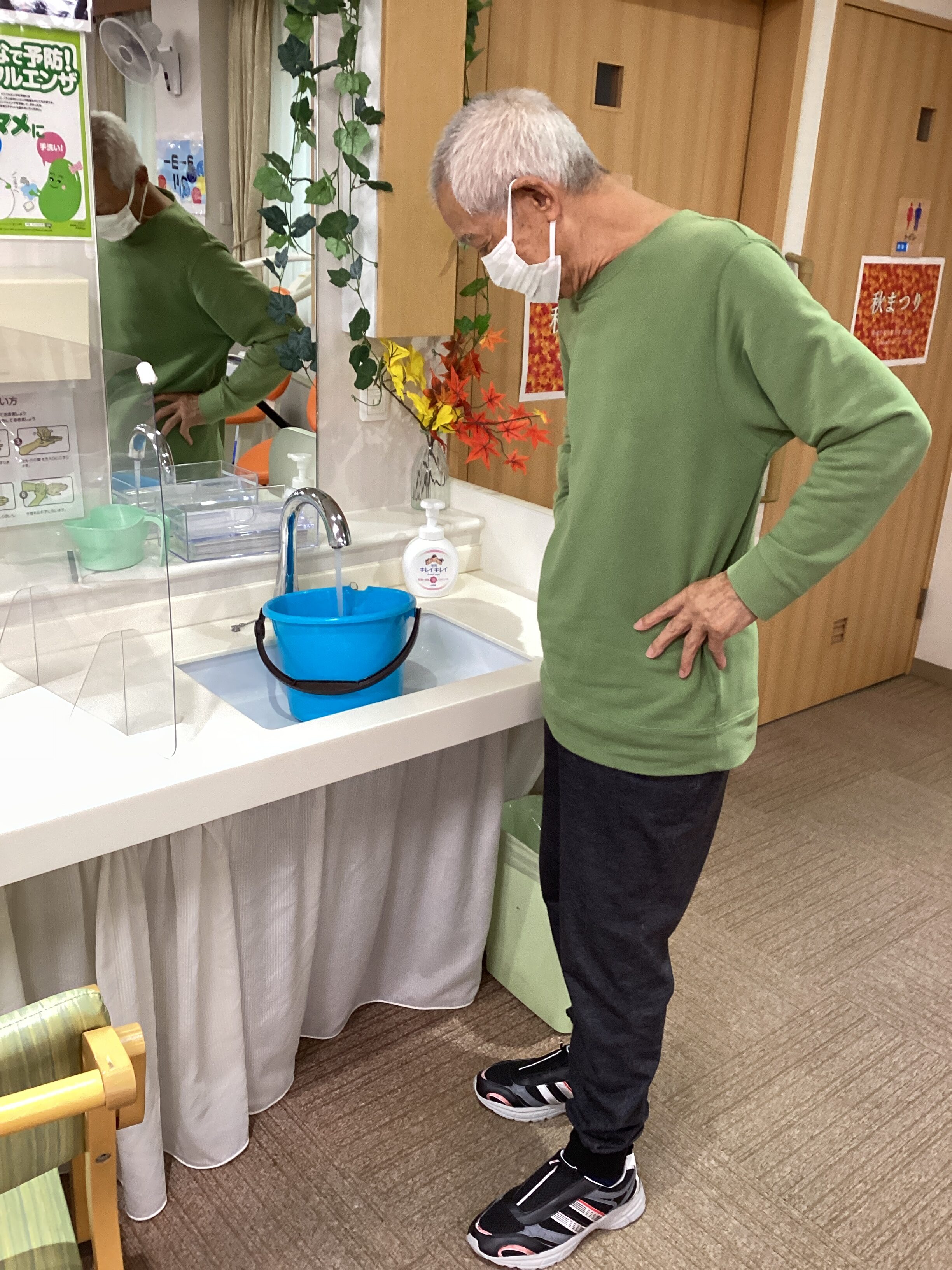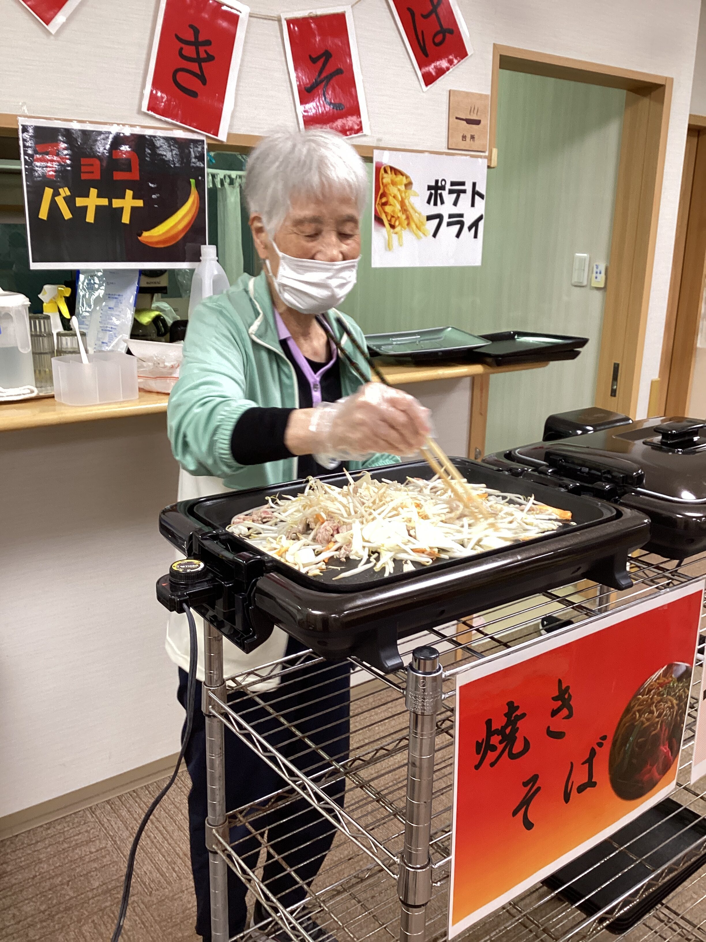 さ~秋祭りの準備です!ご利用者も一緒に準備参加型!ヨーヨーを浮かべるプールへ水を運び… 焼きそばの野菜も炒めて…食べるのが楽しみ~!!メニューは、焼きそば、フランクフルト、ポテトフライ、豆腐ドーナツ、バナナチョコ🍌 皆さん✨ウキウキ・わくわく✨