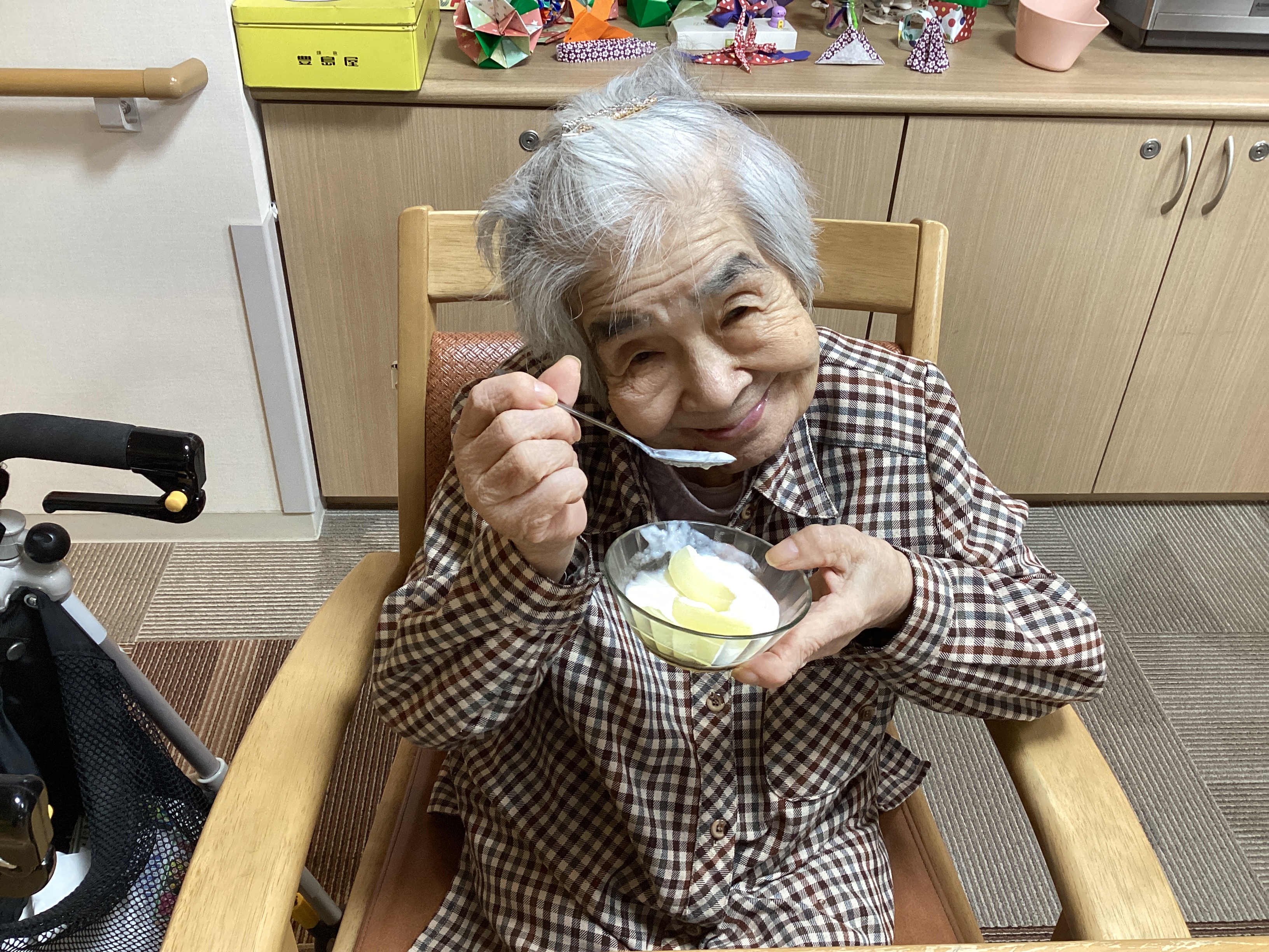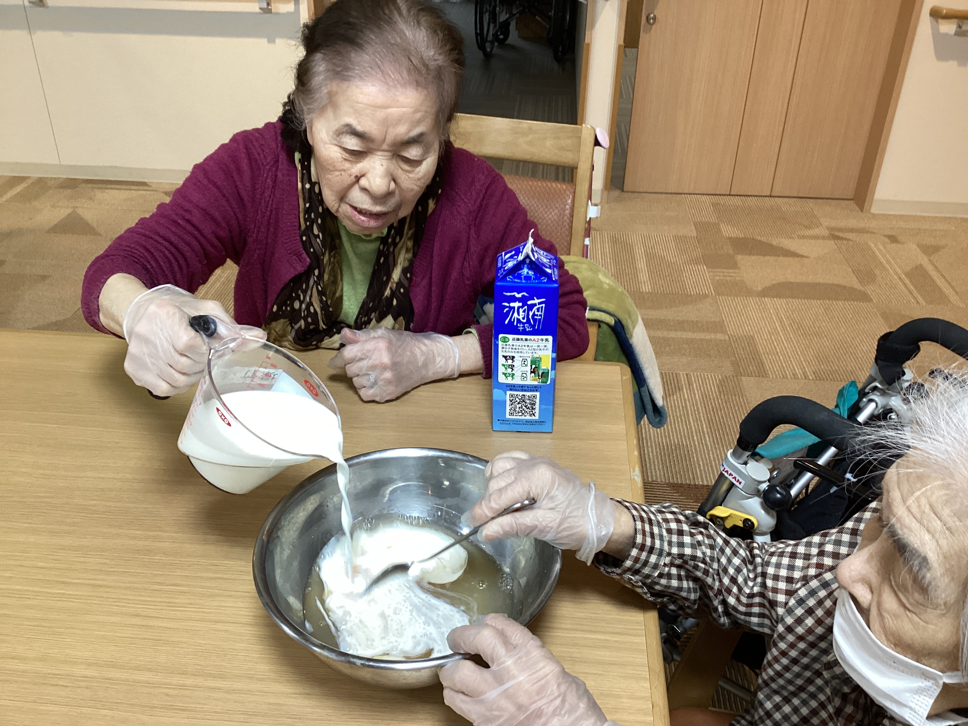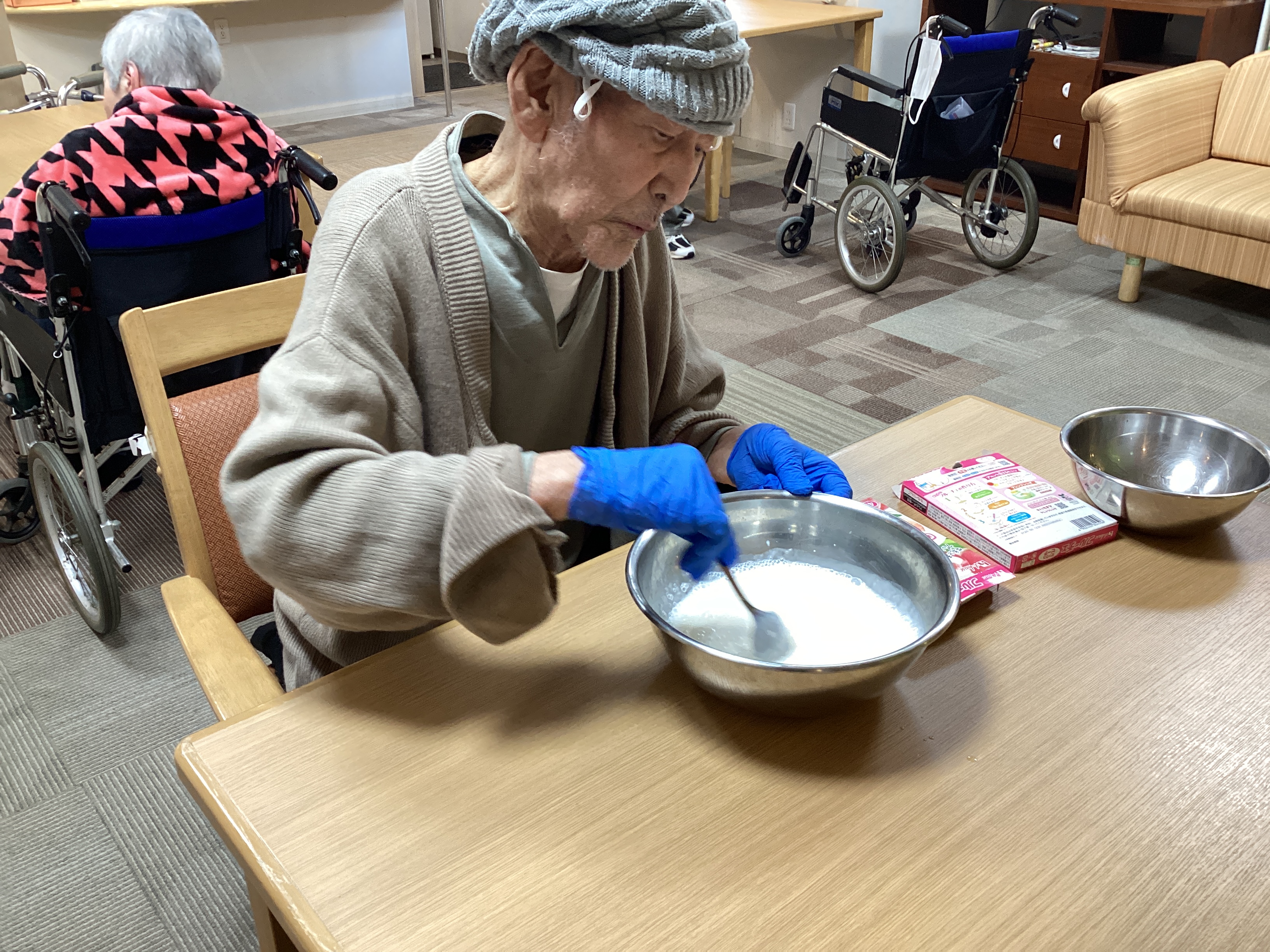 今日は皆さまと一緒にフルーチェを作りました 昔はよく作っていたわと談笑しながら作ったフルーチェは格別でした