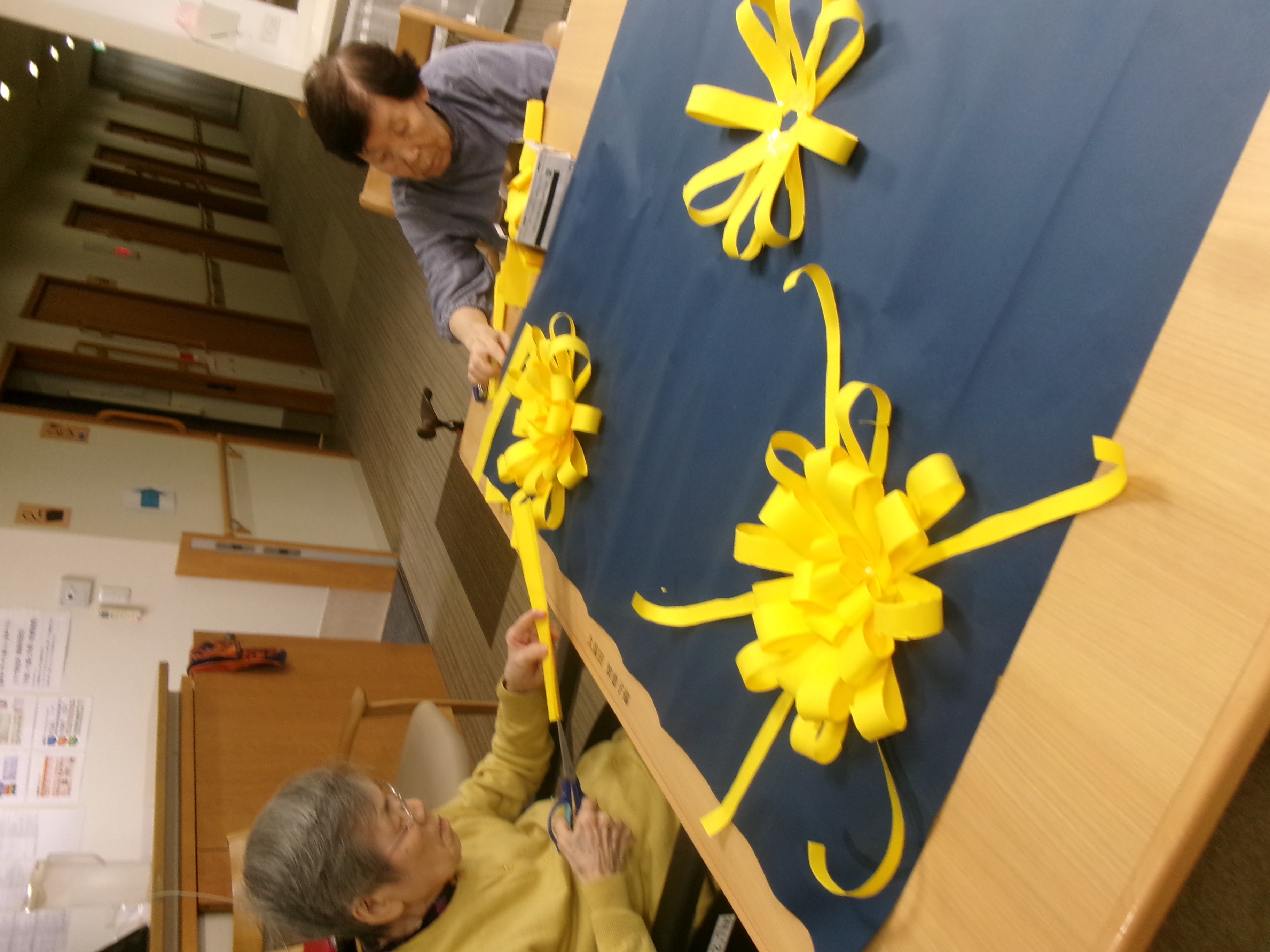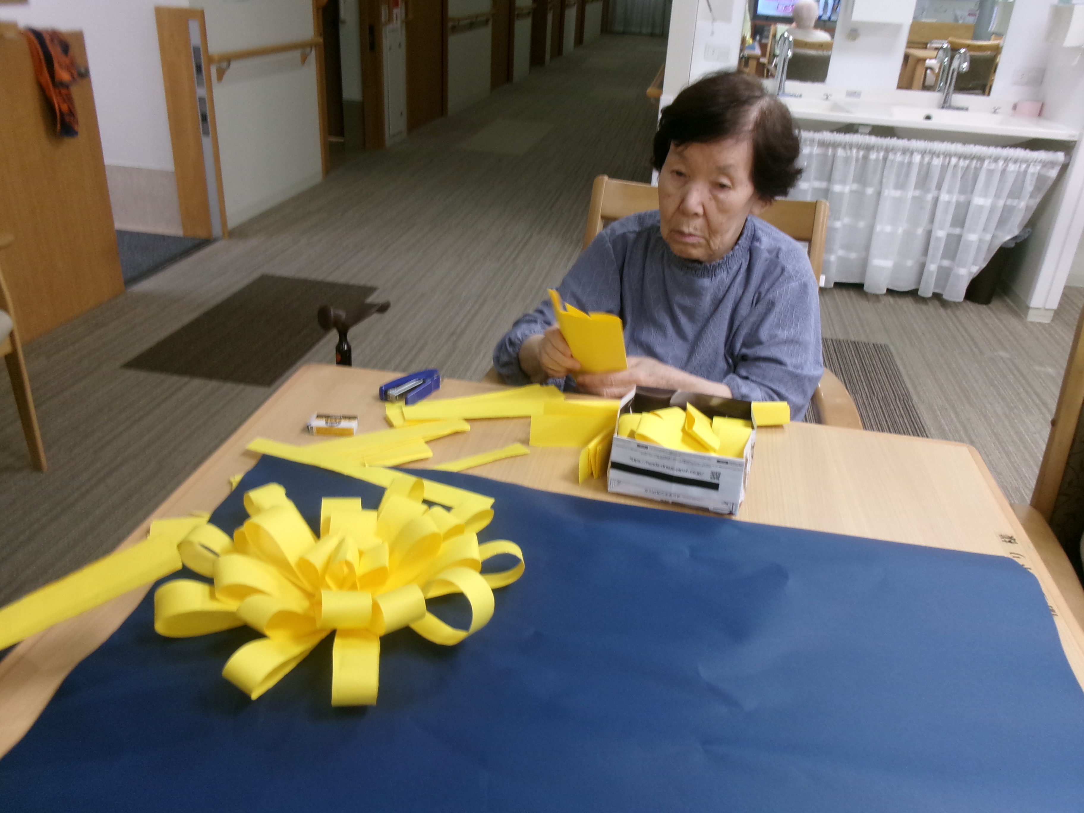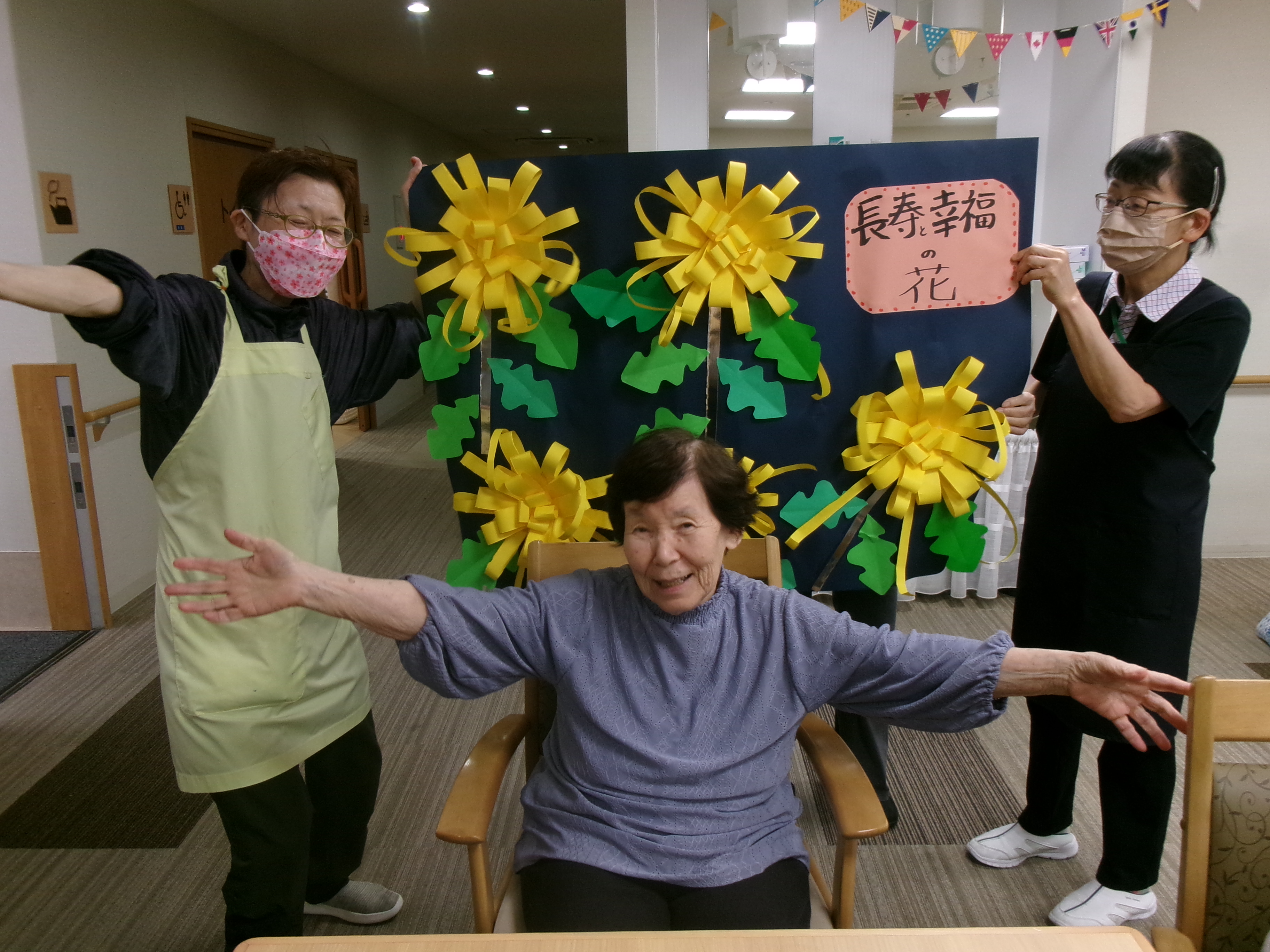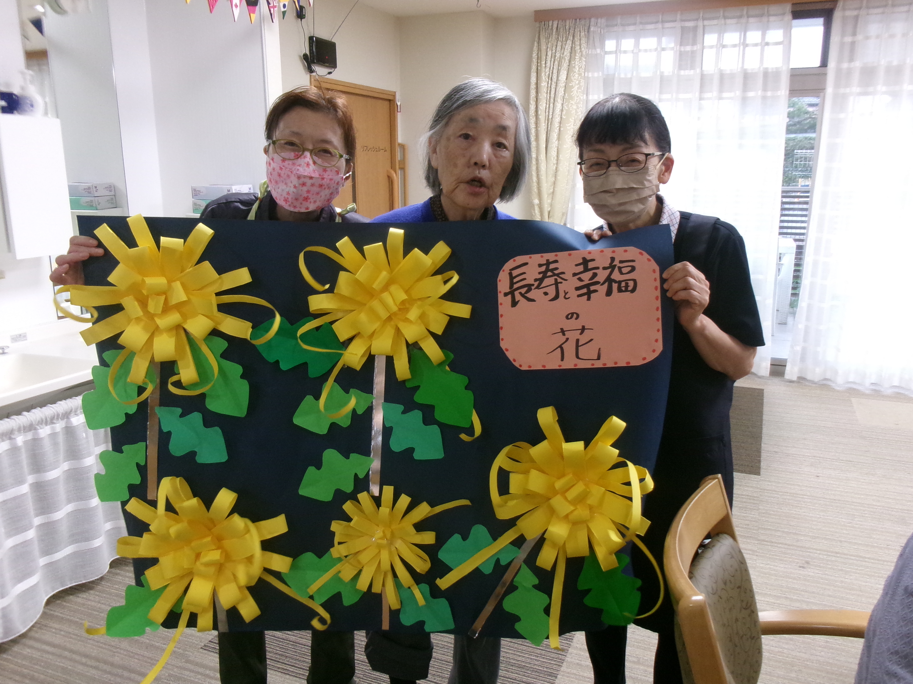 皆様が真剣に作成されとても素敵な菊の花の壁画になりました(o^―^o)菊の花言葉は「長寿と幸福」とのことです。素敵ですね!!
