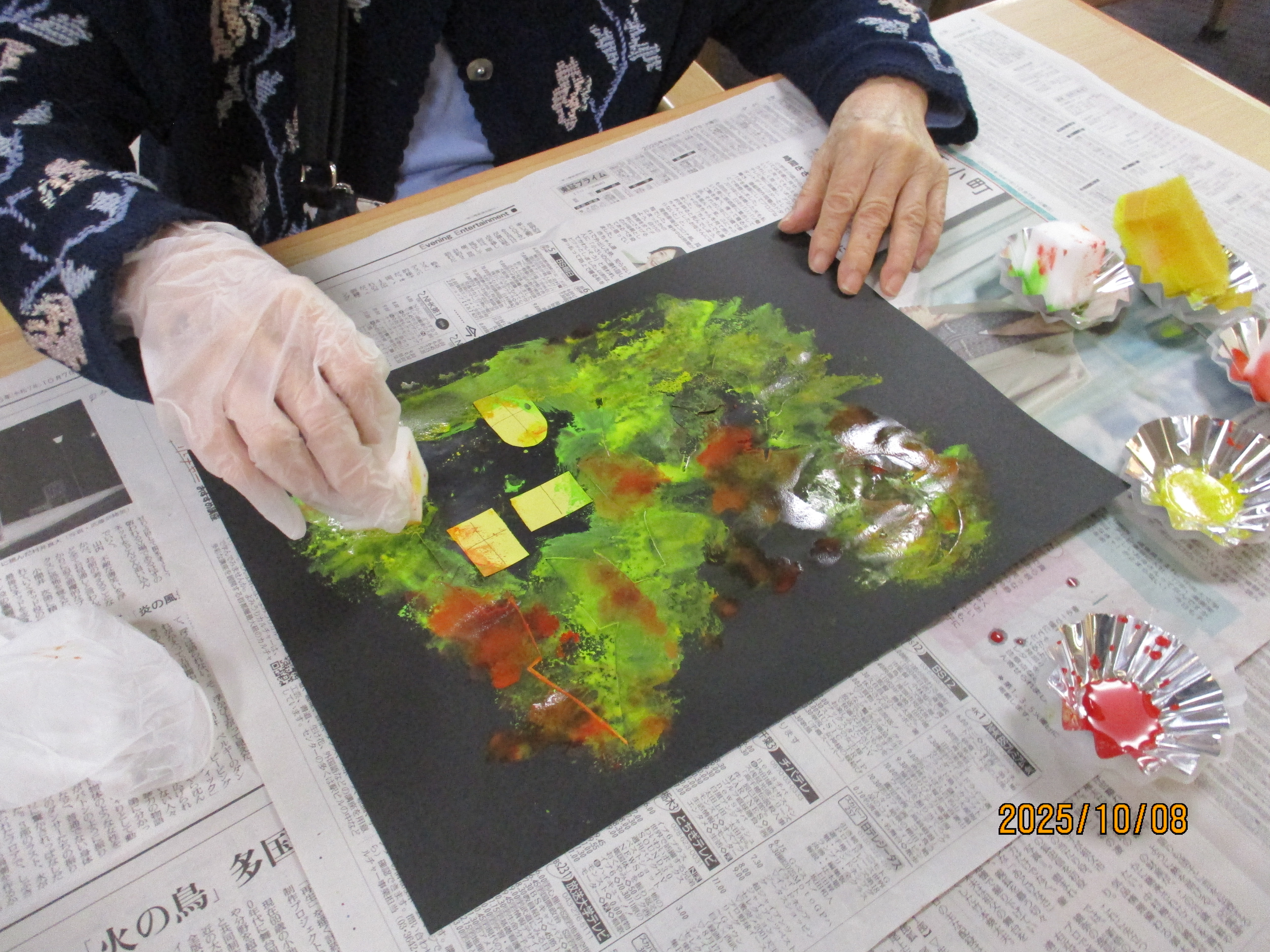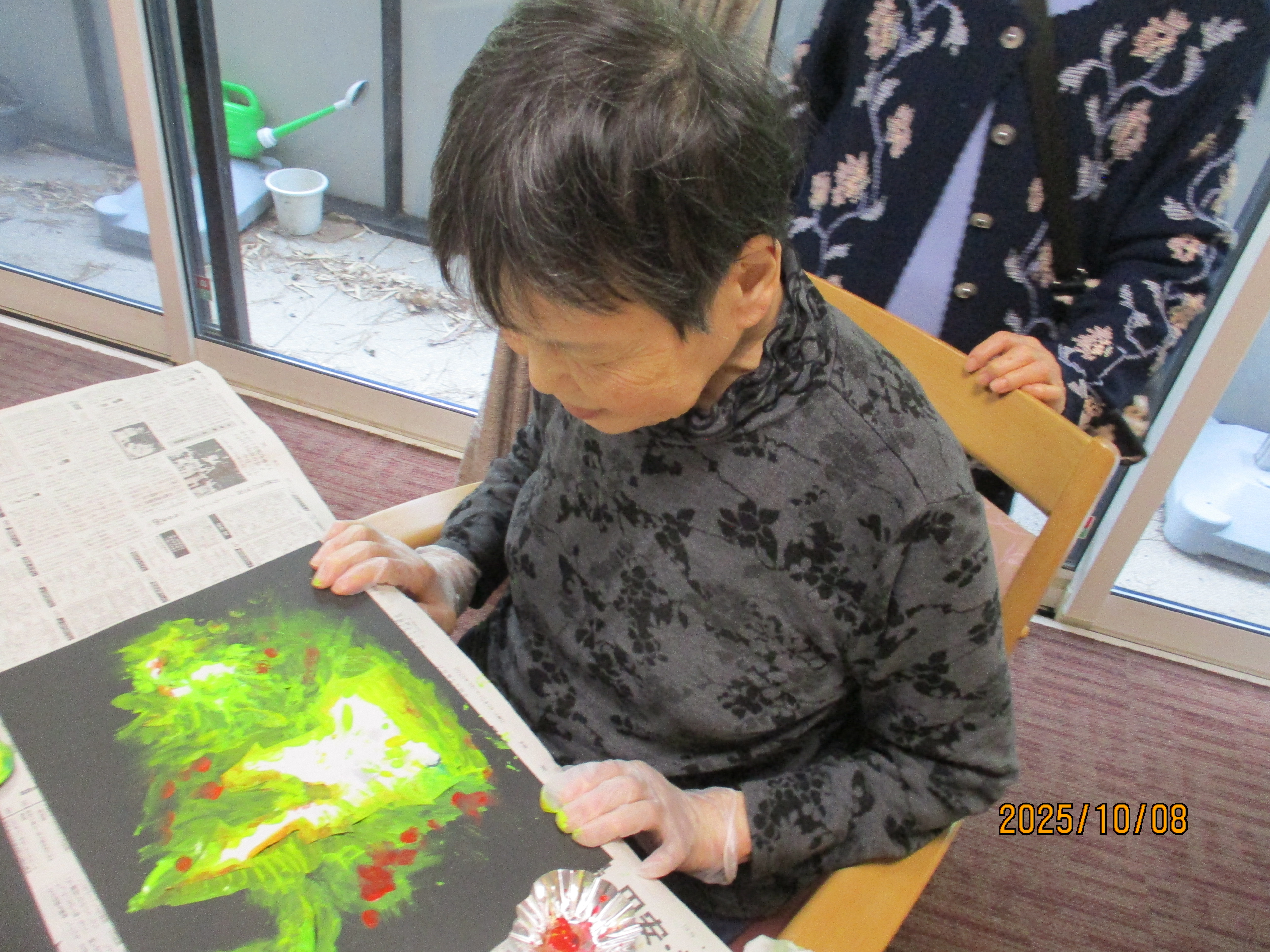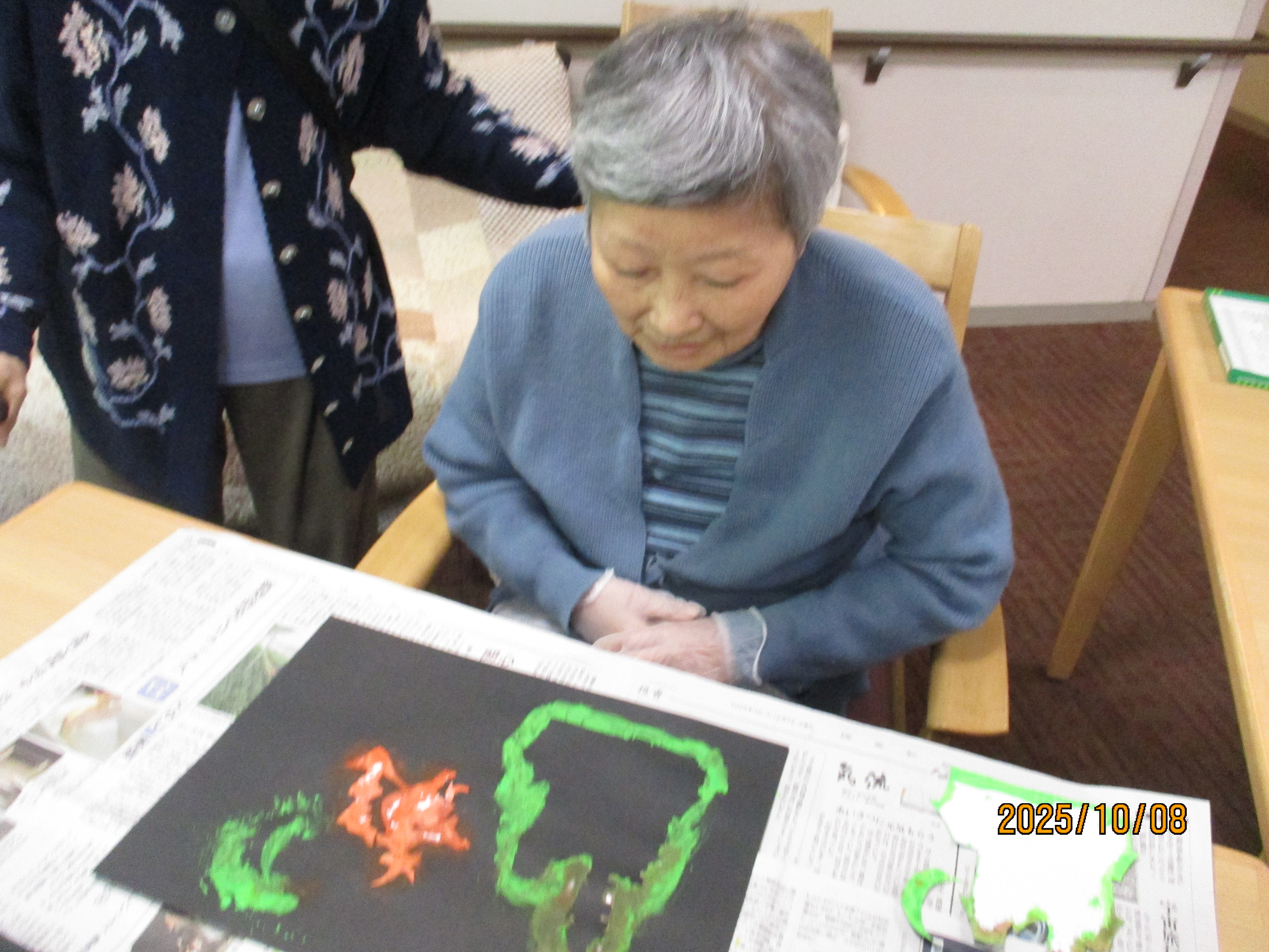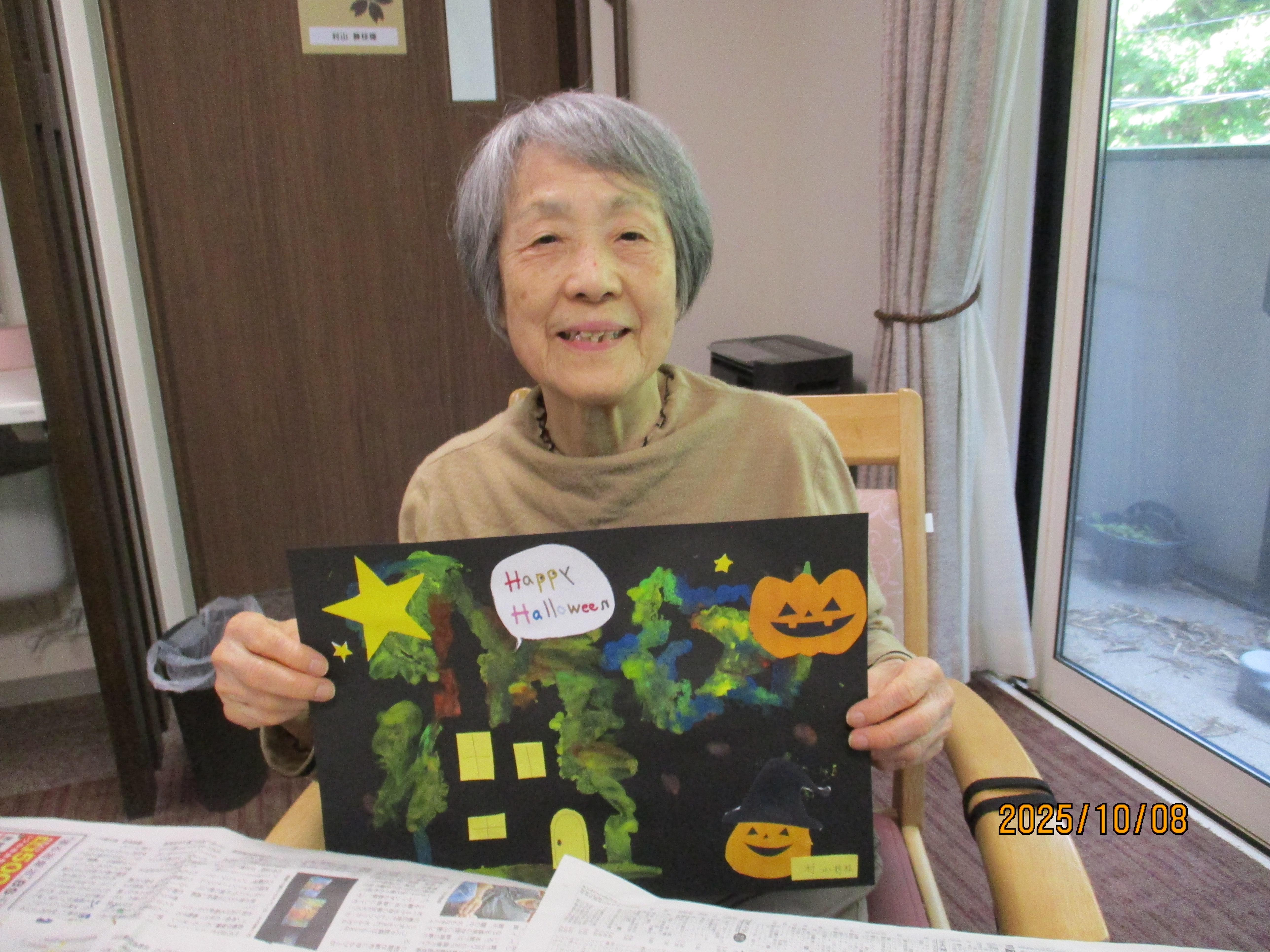 黒の画用紙に家や魔女の型を置いて絵の具を塗ります。型を置けない方はあらかじめ職員がクレヨンで絵を書きその上から絵の具を塗ると弾いて絵が浮かびます。その後にかぼちゃのお化けやハッピーハロウィンの切り抜きを貼りました。みんな楽しそう☺