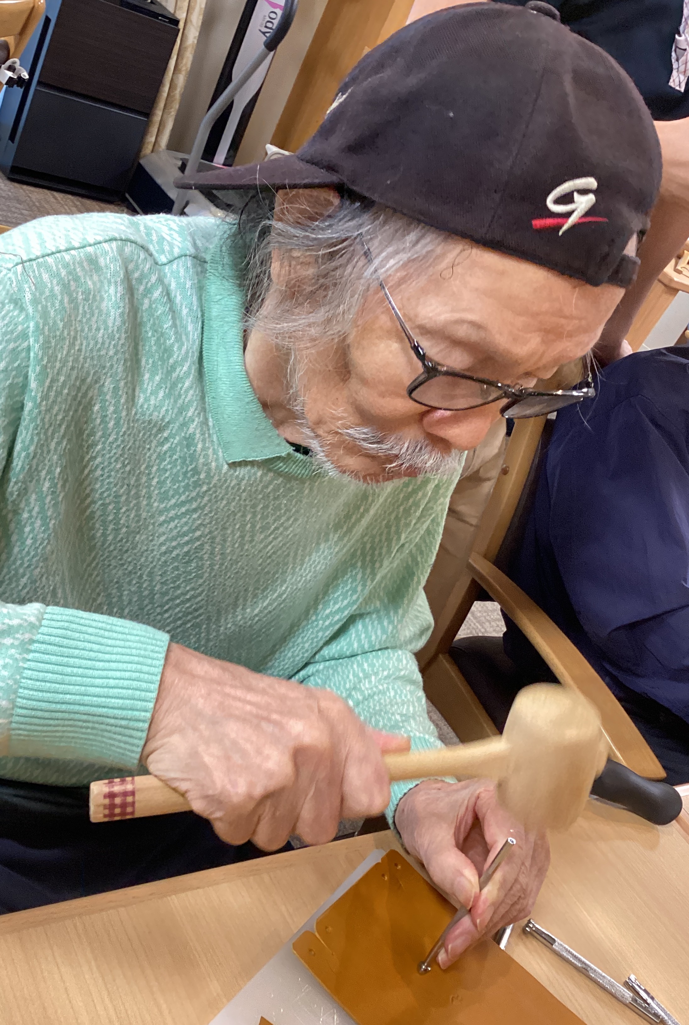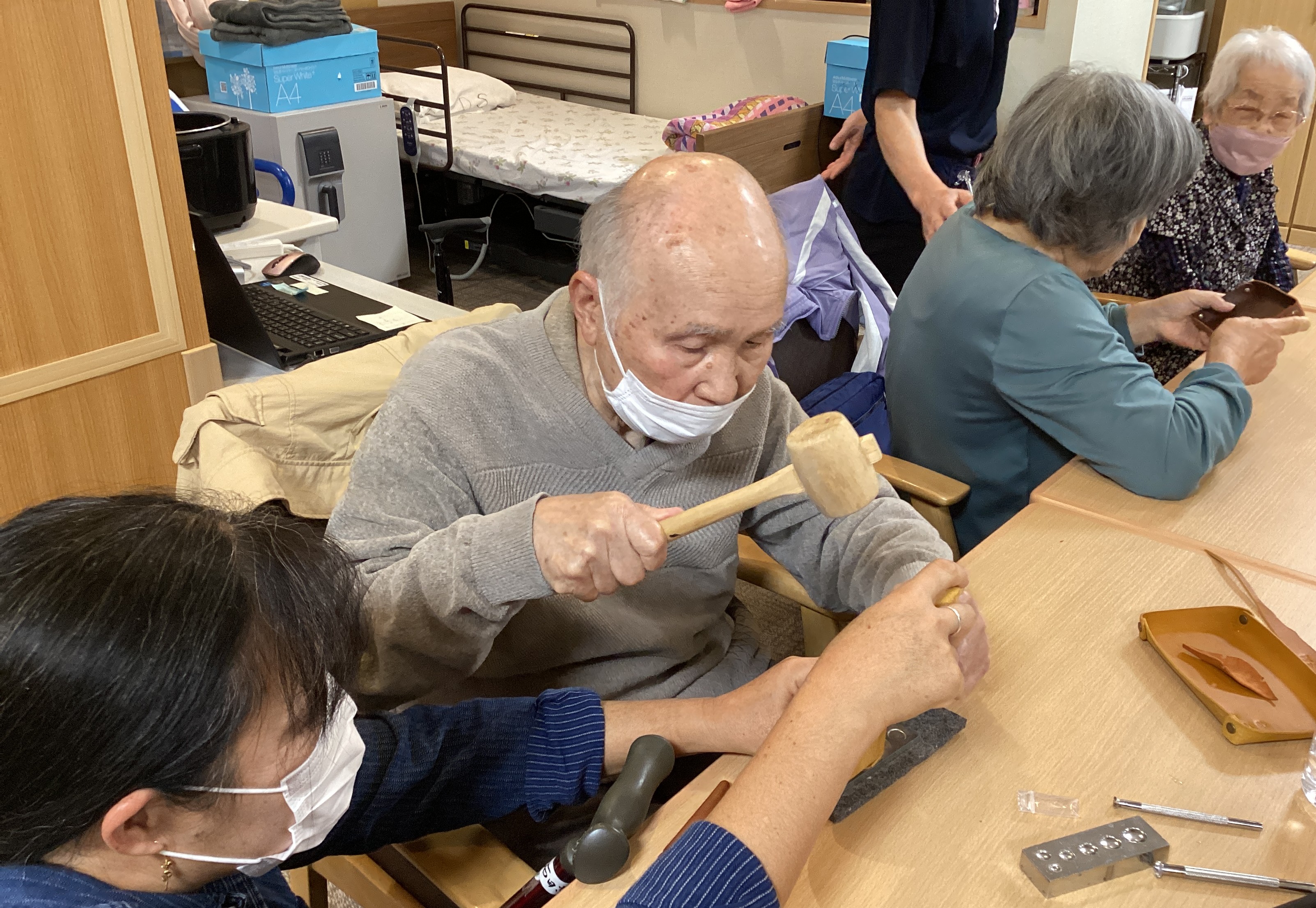 今回は初めての工作レクで職人さんが来てくださり、トンカチを使ってお好きな刻印を選んで思い思いに作成しました! 世界に一つのオリジナルの革細工作りを楽しみました! 時間が経てば経つほど味のあるデザインに変わっていくといいですね☺