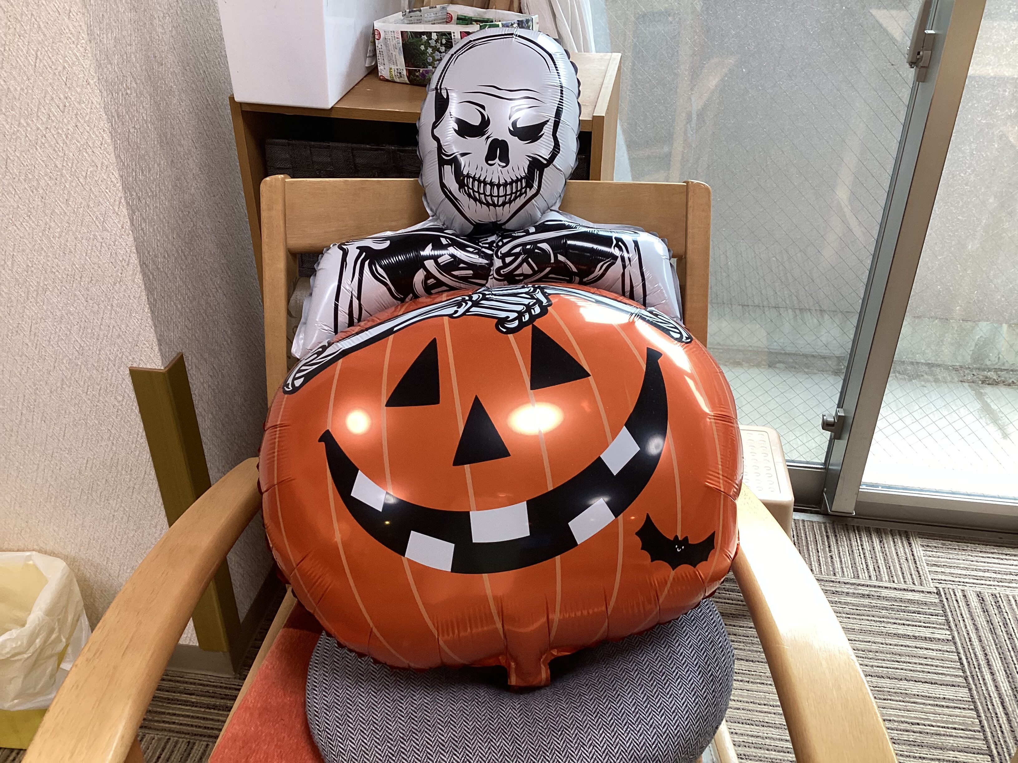 ハッピーハロウィン! 今年もこの季節がやってきましたね~ 今年はかぼちゃの風船もいっぱい飾り、バケツにたくさん入ったお菓子ももらいました! 仮装もしちゃうかも……?