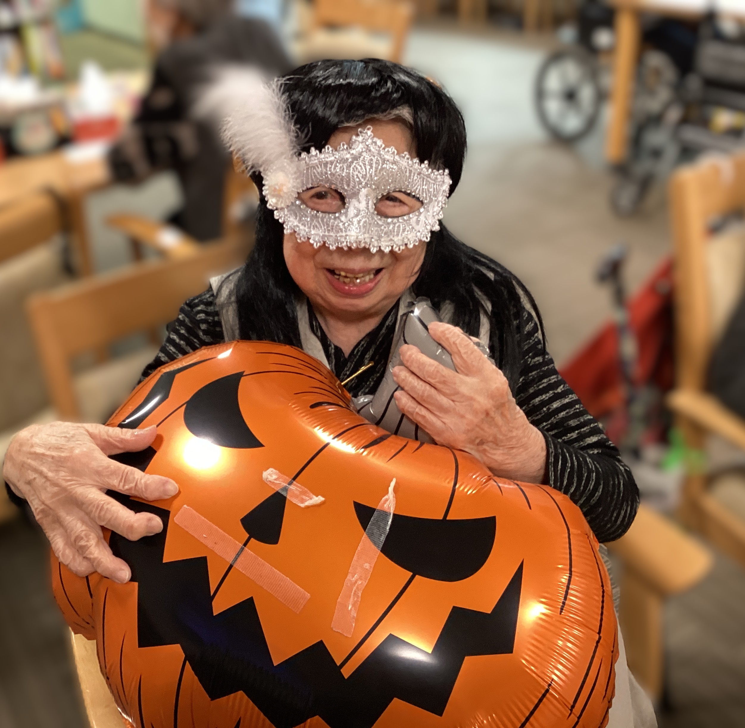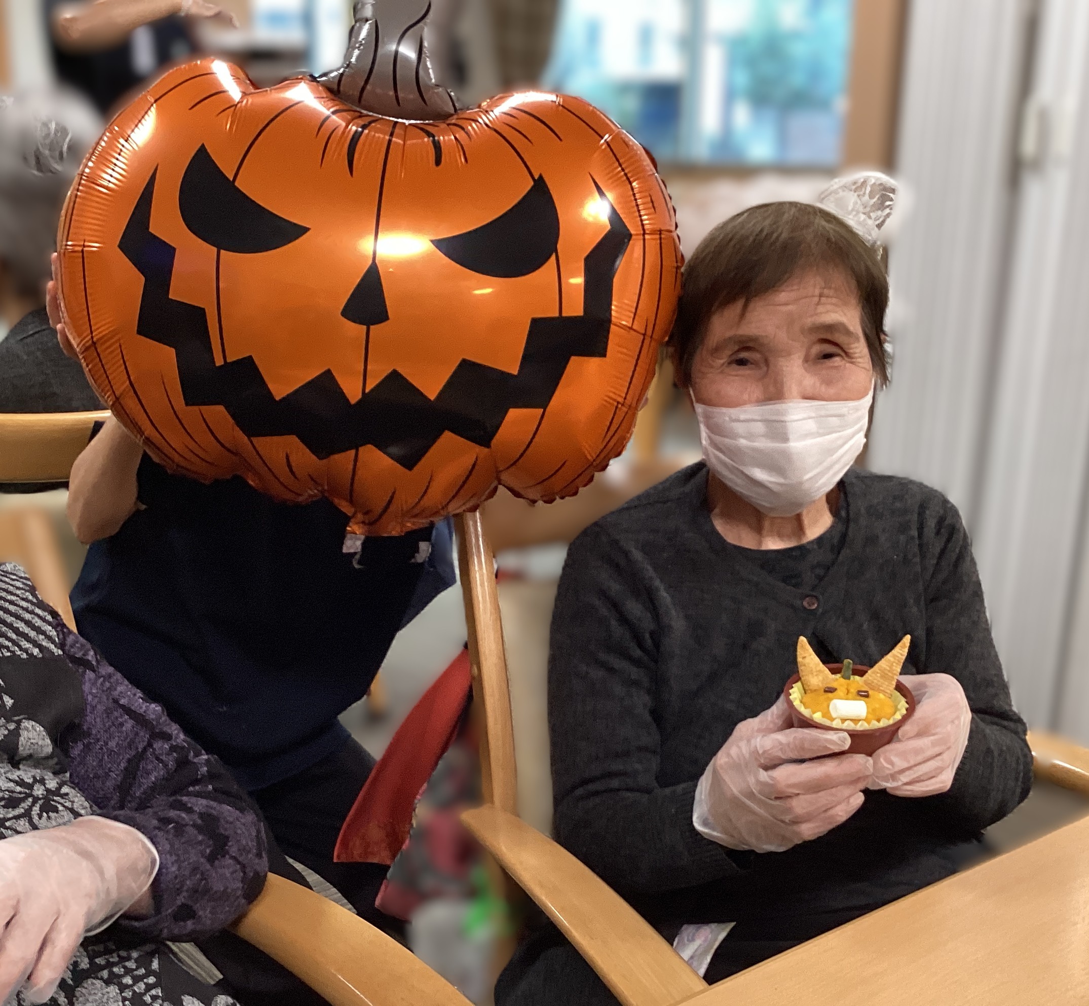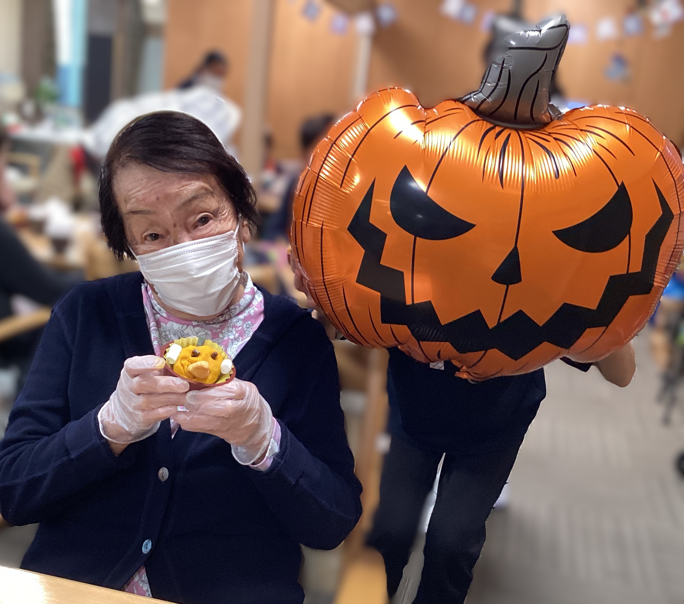 ハロウィンのおやつレクリエーションでかぼちゃの茶巾絞りを皆で作りました。とんがりコーンの帽子やチョコレートで目を作り可愛いかぼちゃお化けが出来上がりました。