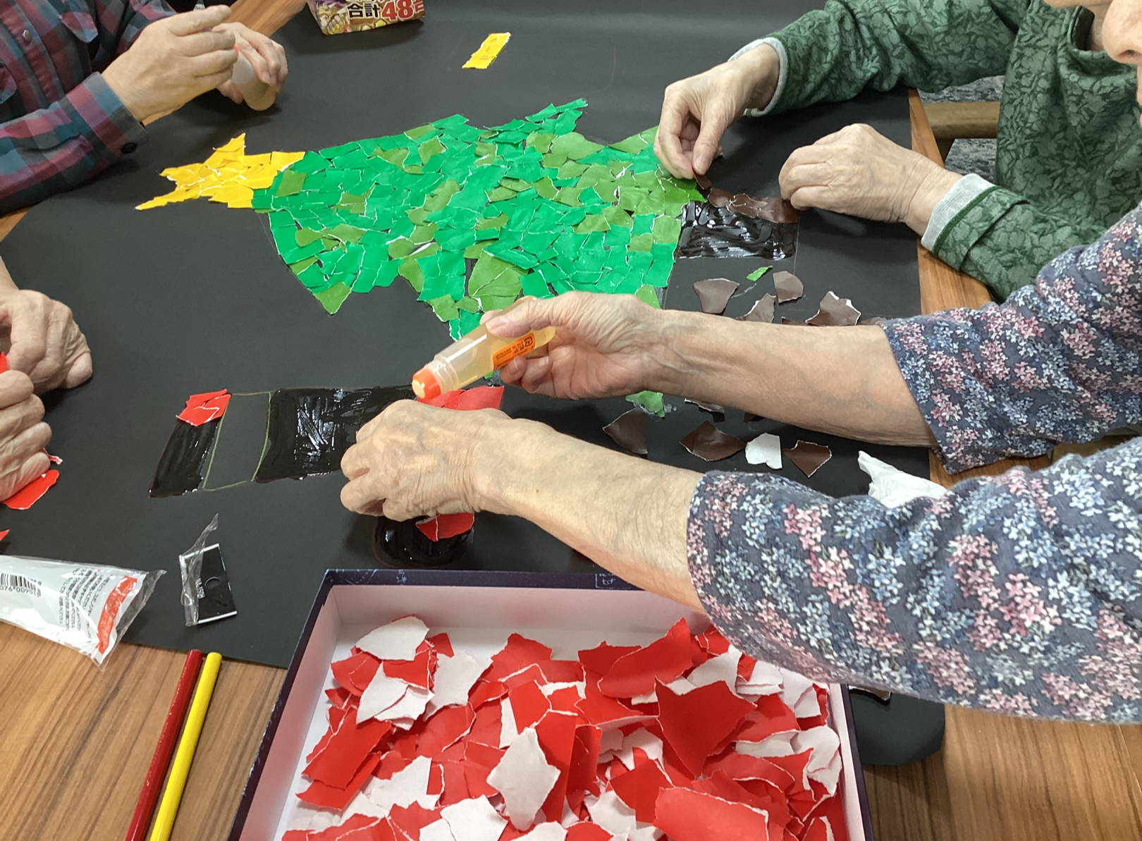 今月は冬に向けてちぎり絵を作成しています。 ひたすら、折り紙をちぎり・・・ちぎり・・・ 張り付けていきます(⌒∇⌒)利用者様もスタッフも楽しみながら作成しました。 完成はまた来月・・・