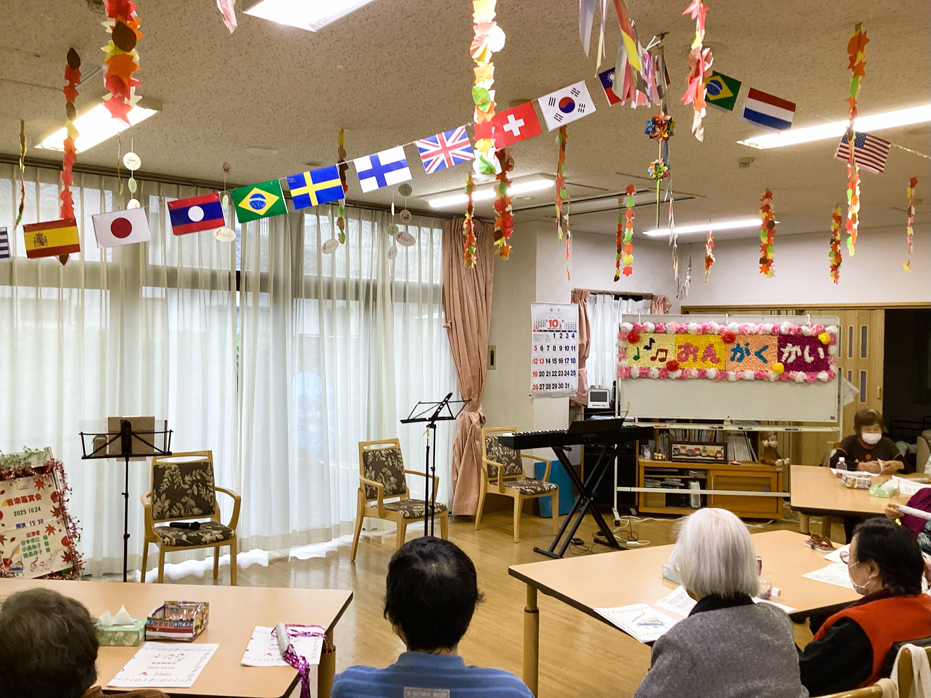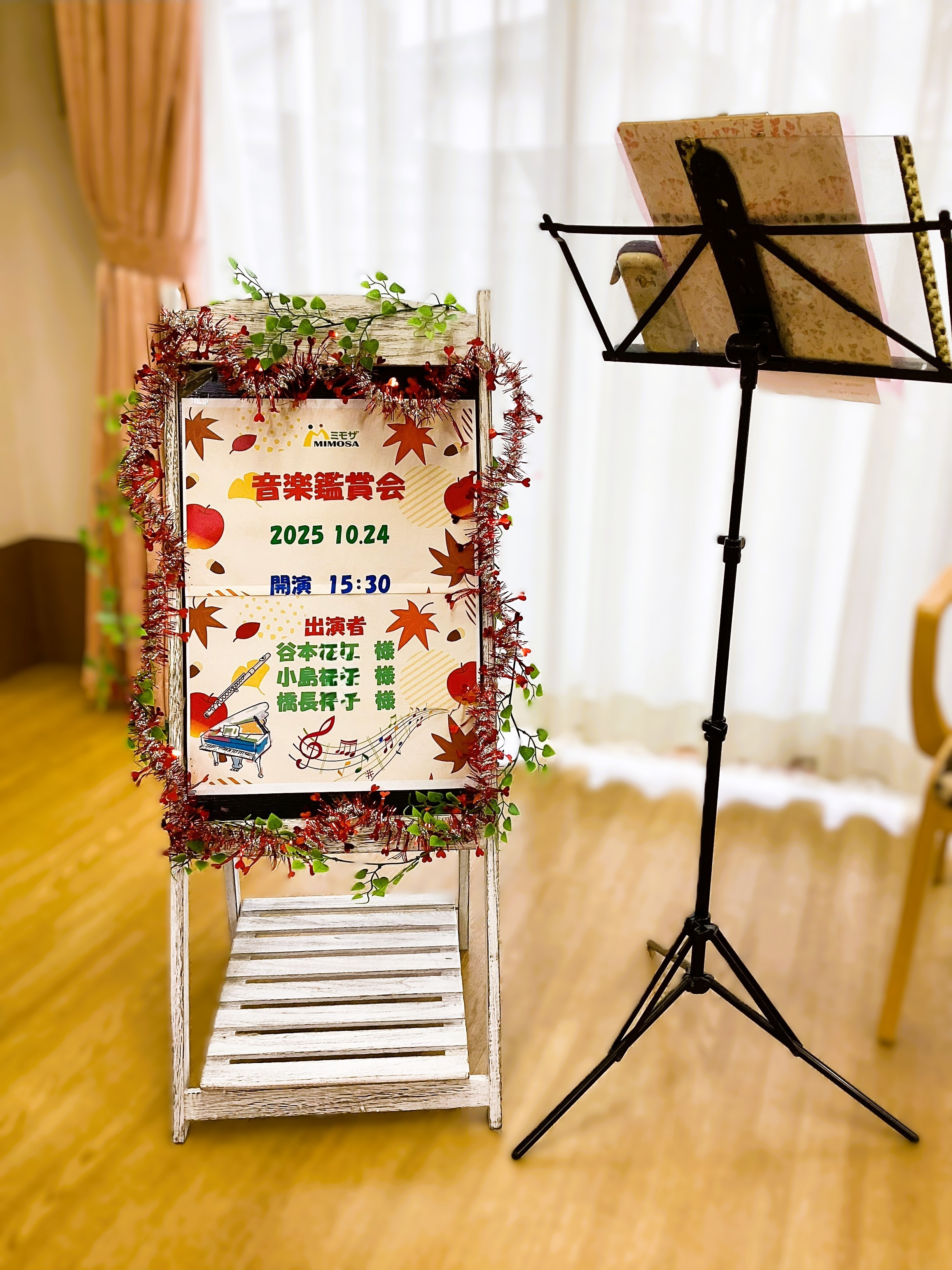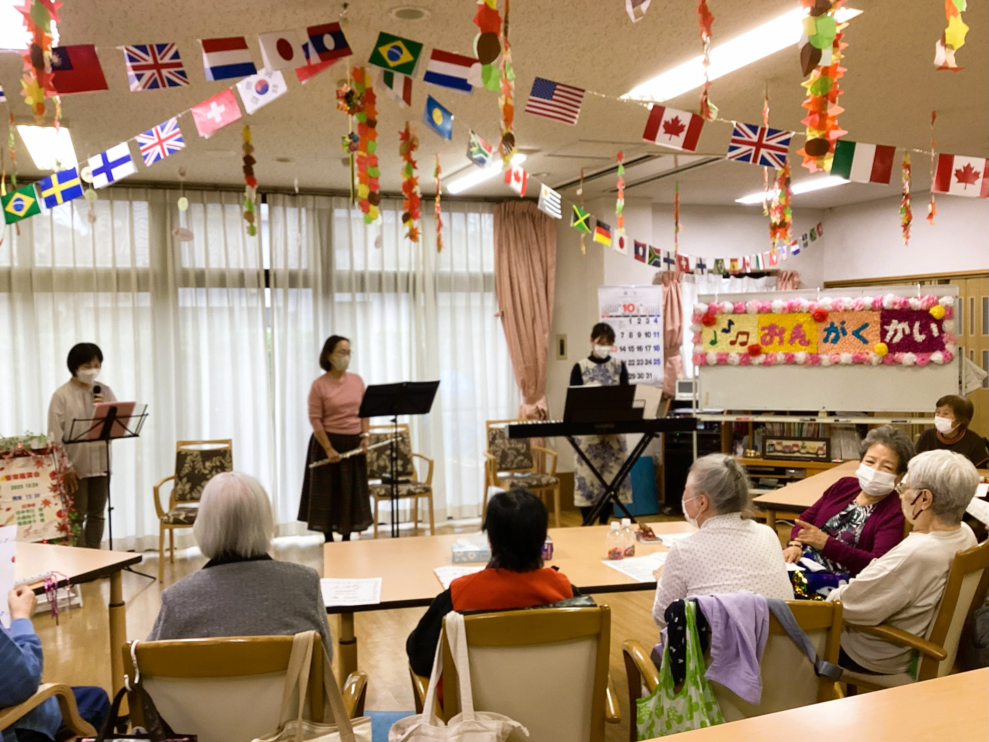外部からフルートとピアノの演奏してくださる方をお招きして、音楽鑑賞会を開催しました😊秋の曲や歌謡曲など9曲を演奏してくださいました😊