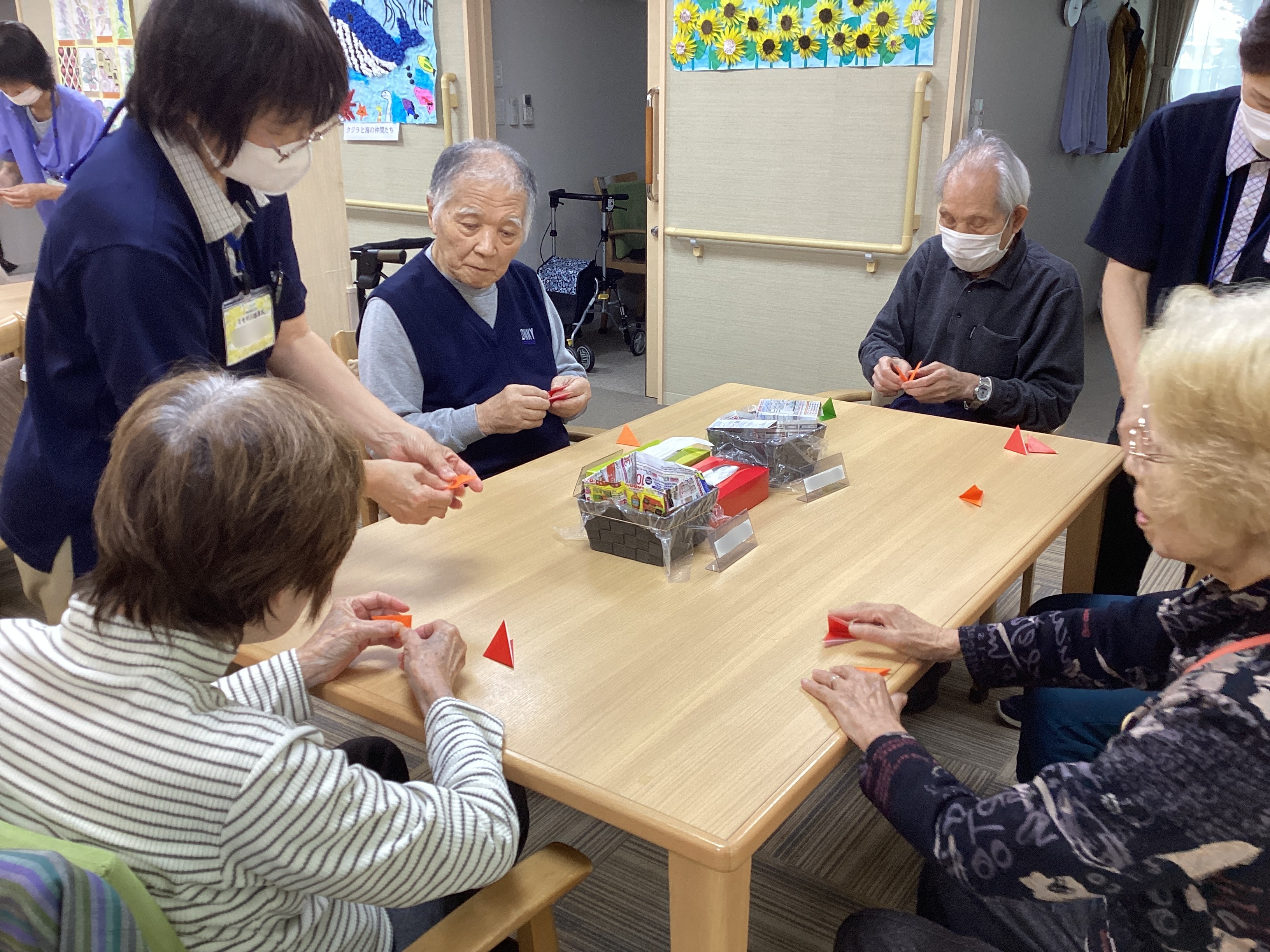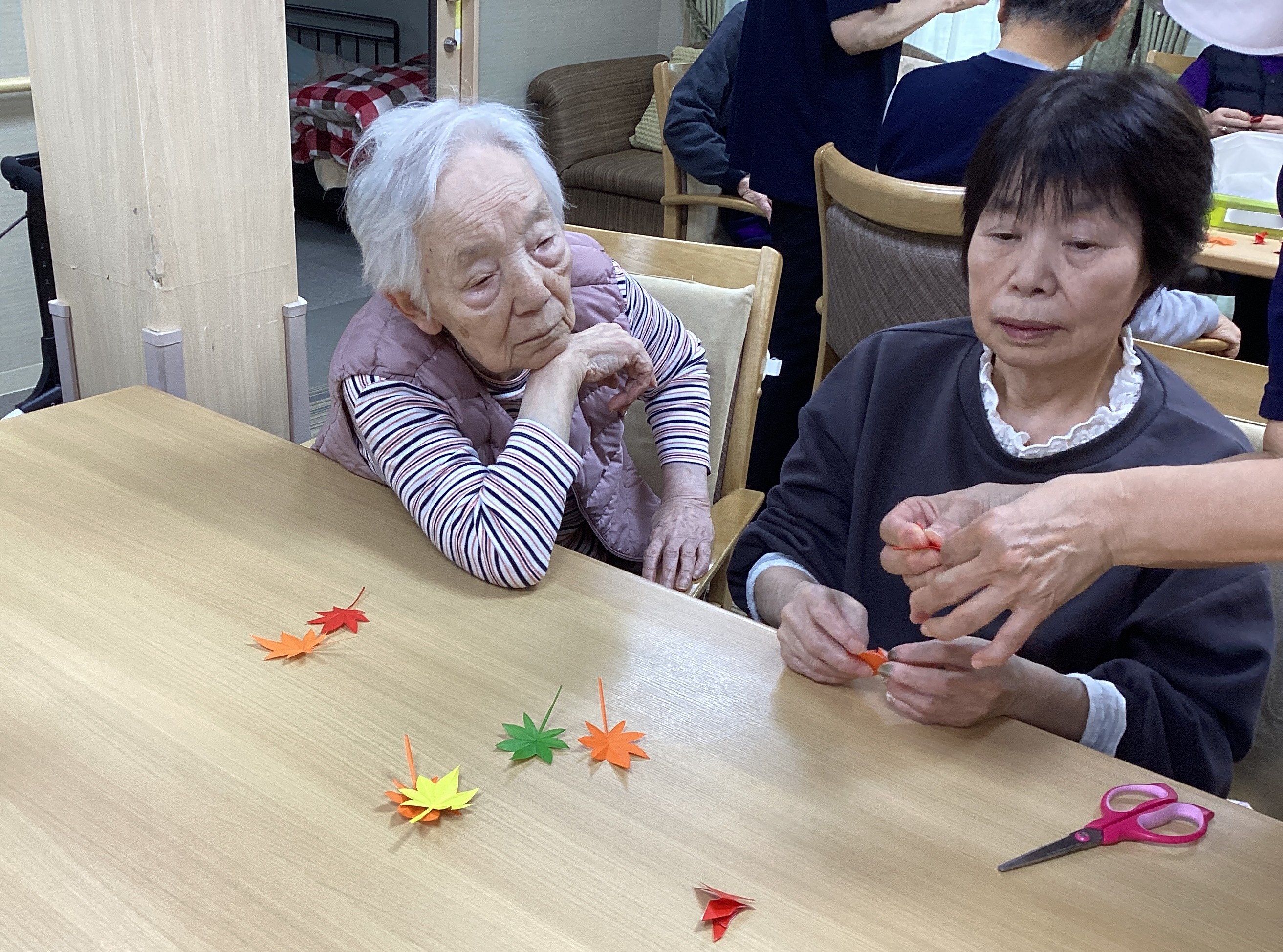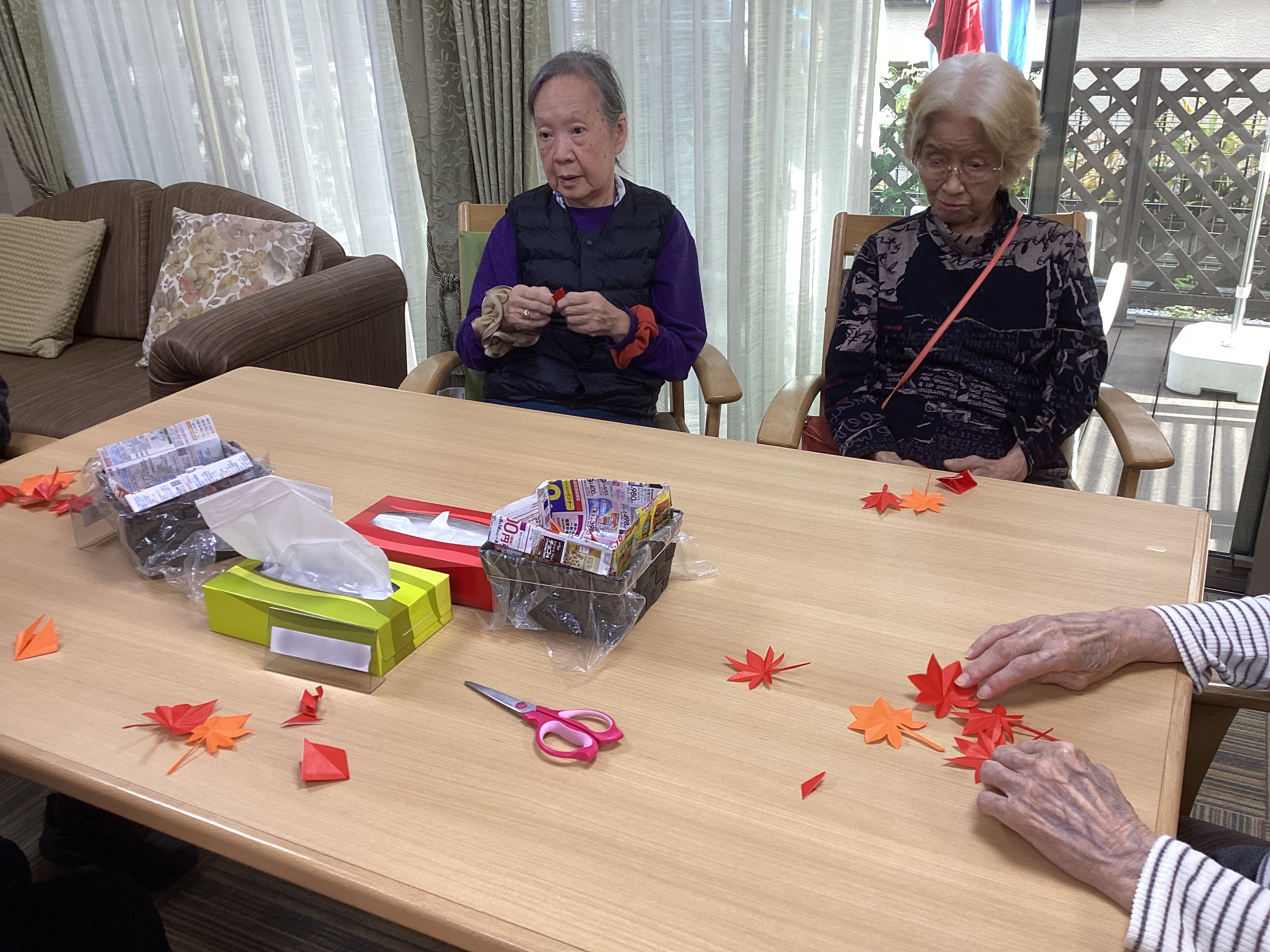 今日は玄関に飾る紅葉を作成しました✂️赤やオレンジの折り紙を使い、職員の手を借りながら折ったり、ハサミで切ったりと皆さん真剣な表情🤨完成した紅葉を見て「綺麗だね」と笑顔がみえました✨秋らしい作品に季節を感じるひとときとなりました🍁