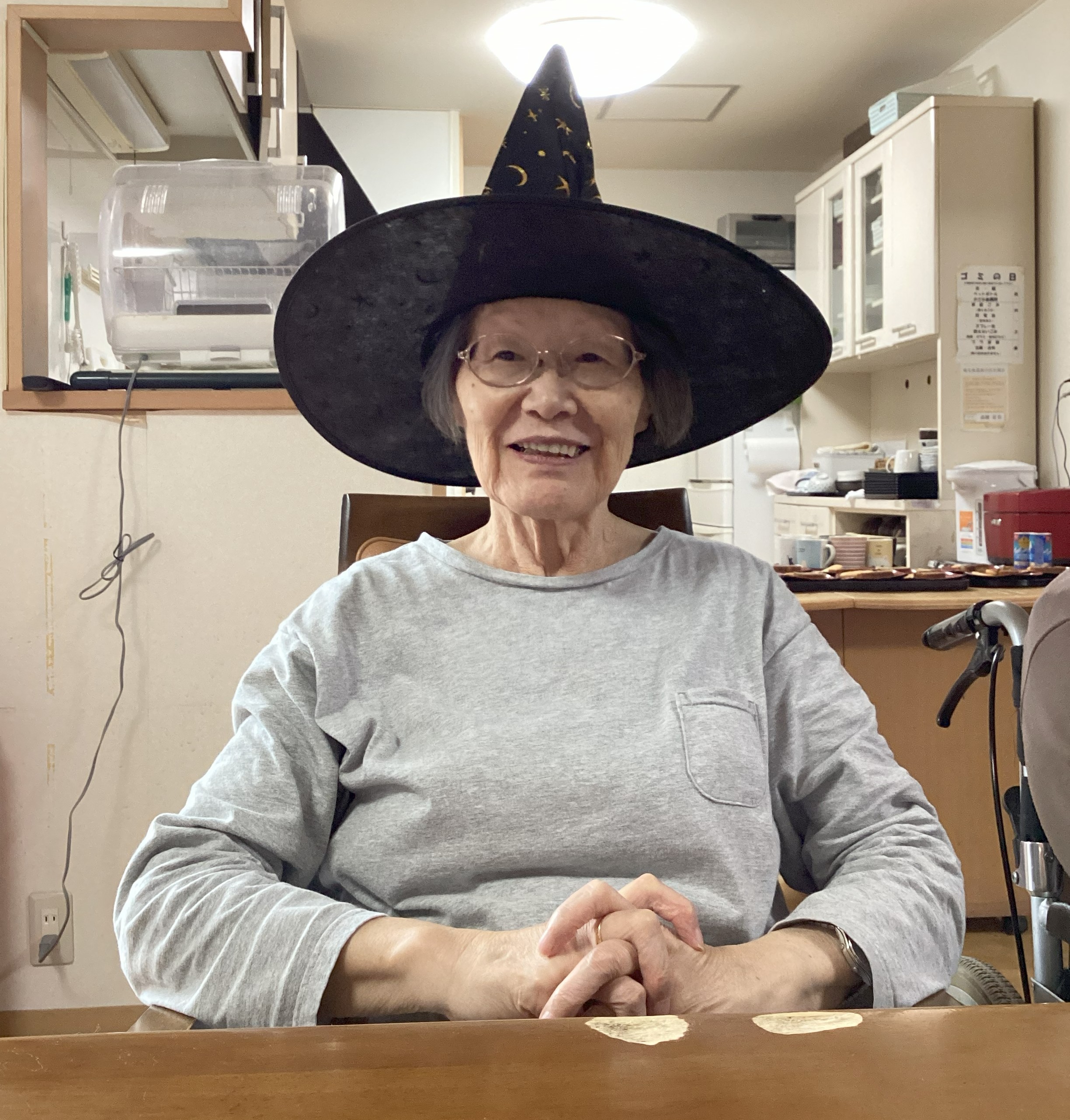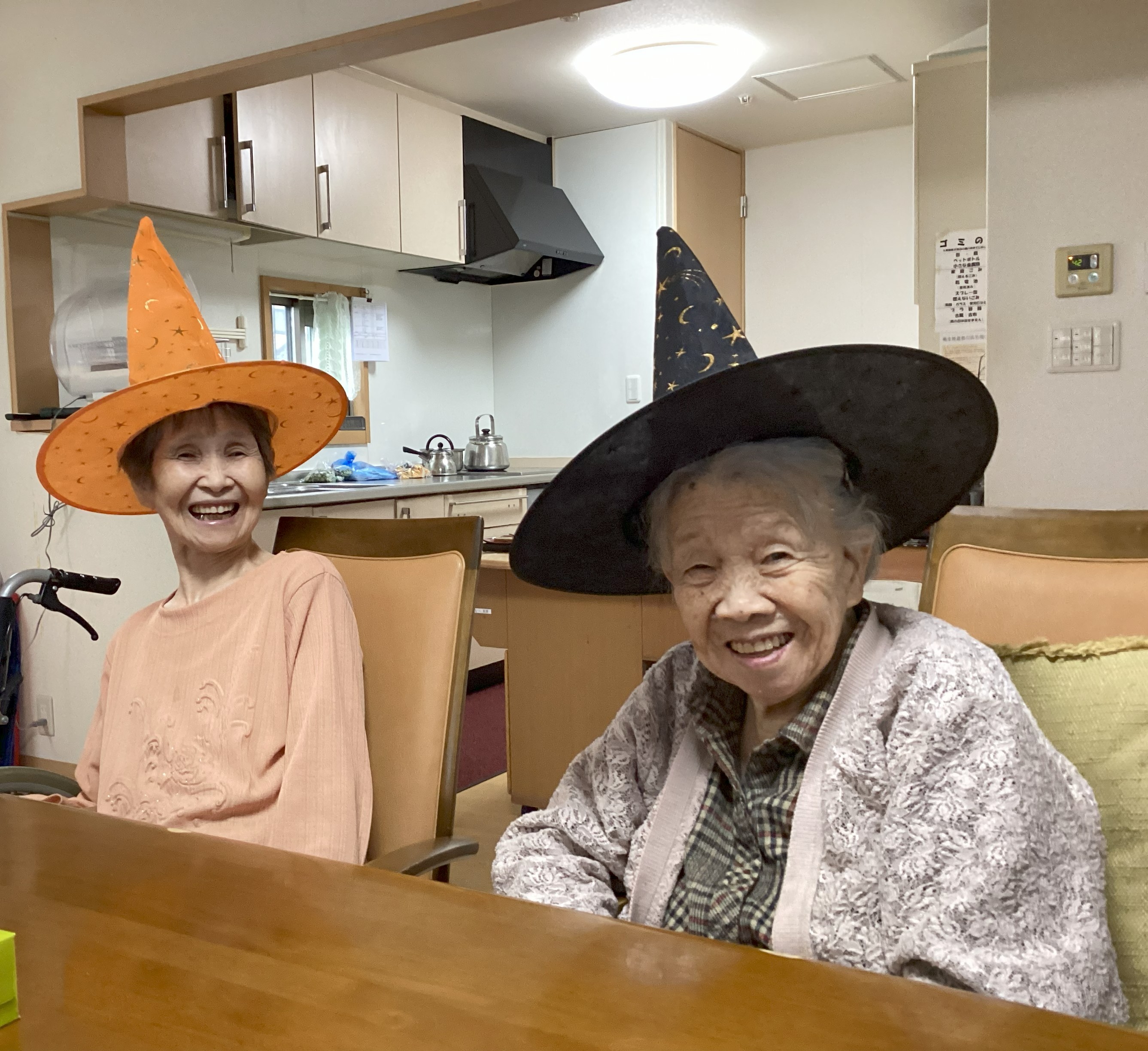 10月末にハロウィンパーティを行い魔女の帽子をかぶって簡単な仮装をしました。 お互いの姿を見ながら似合う似合うと笑顔で話されたり、昼食にカボチャのクリームシチュー、おやつにケーキをいただきました🎃