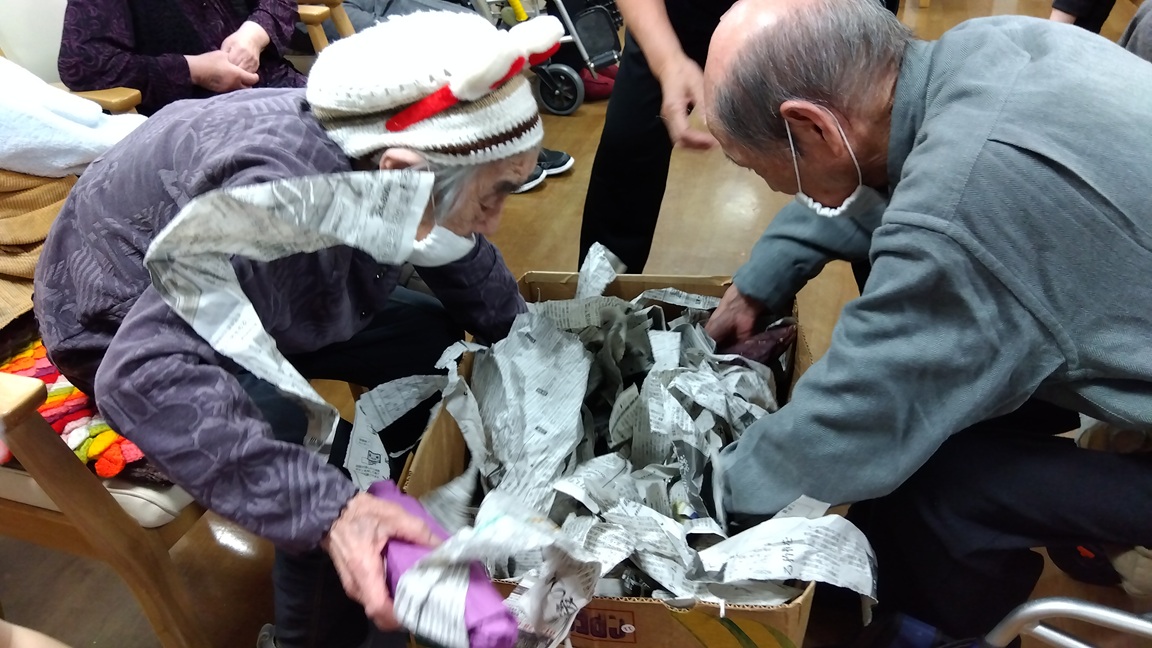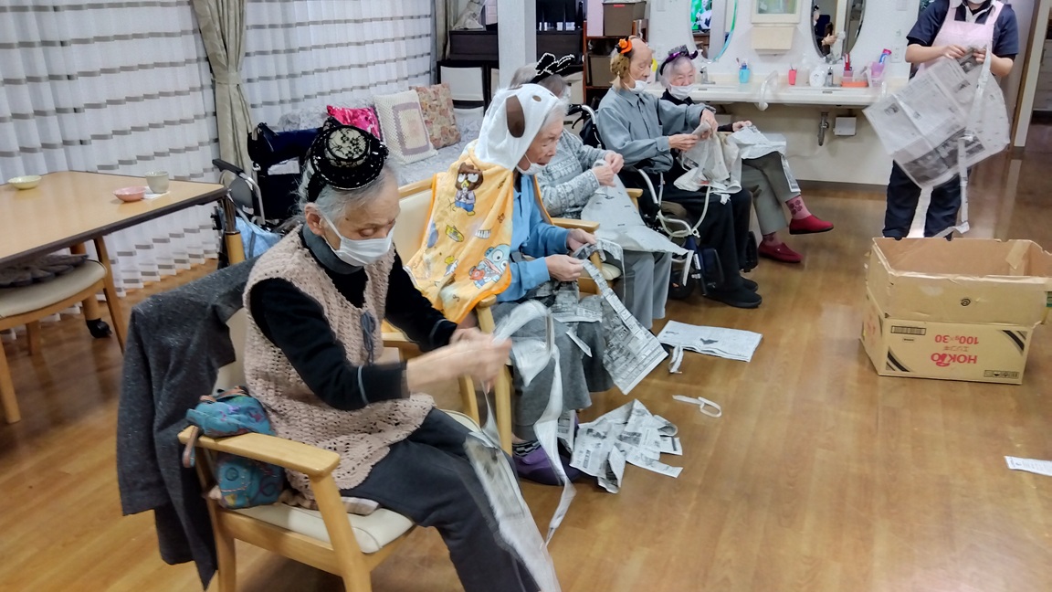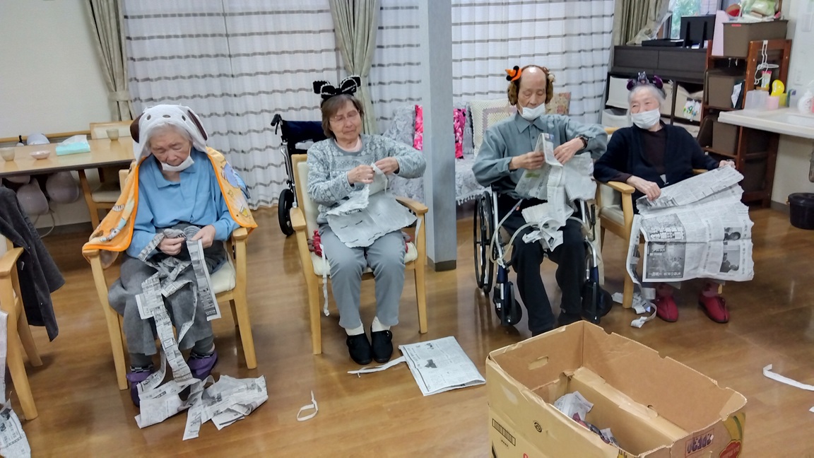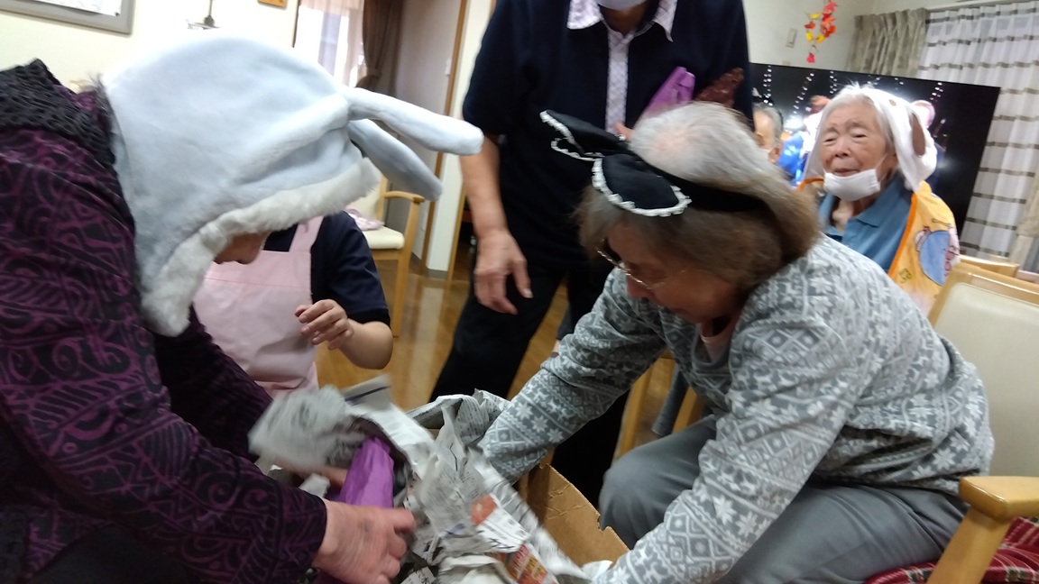 ハロウィーンパーティーで仮装しながら、芋ほりレクをしました。