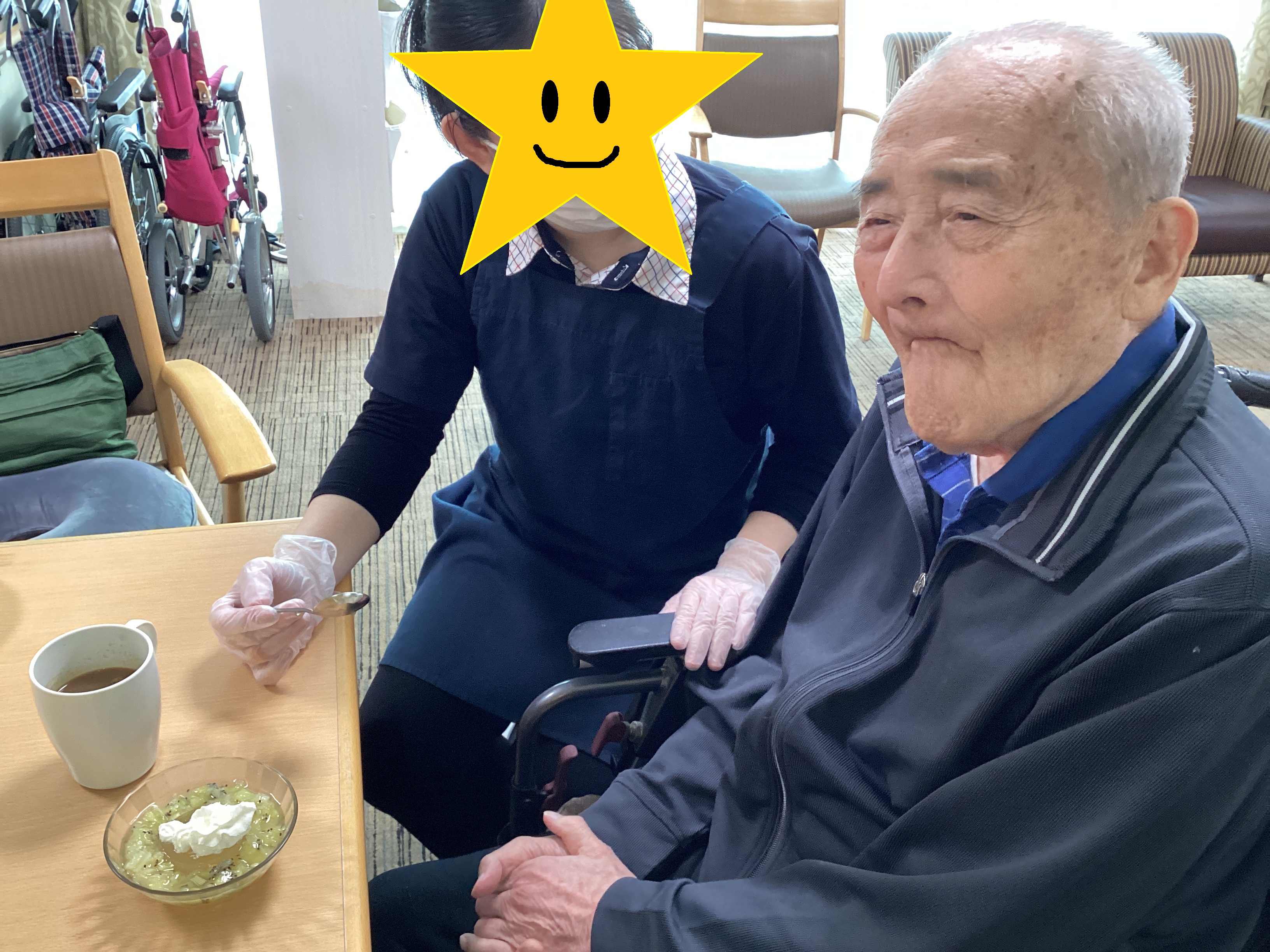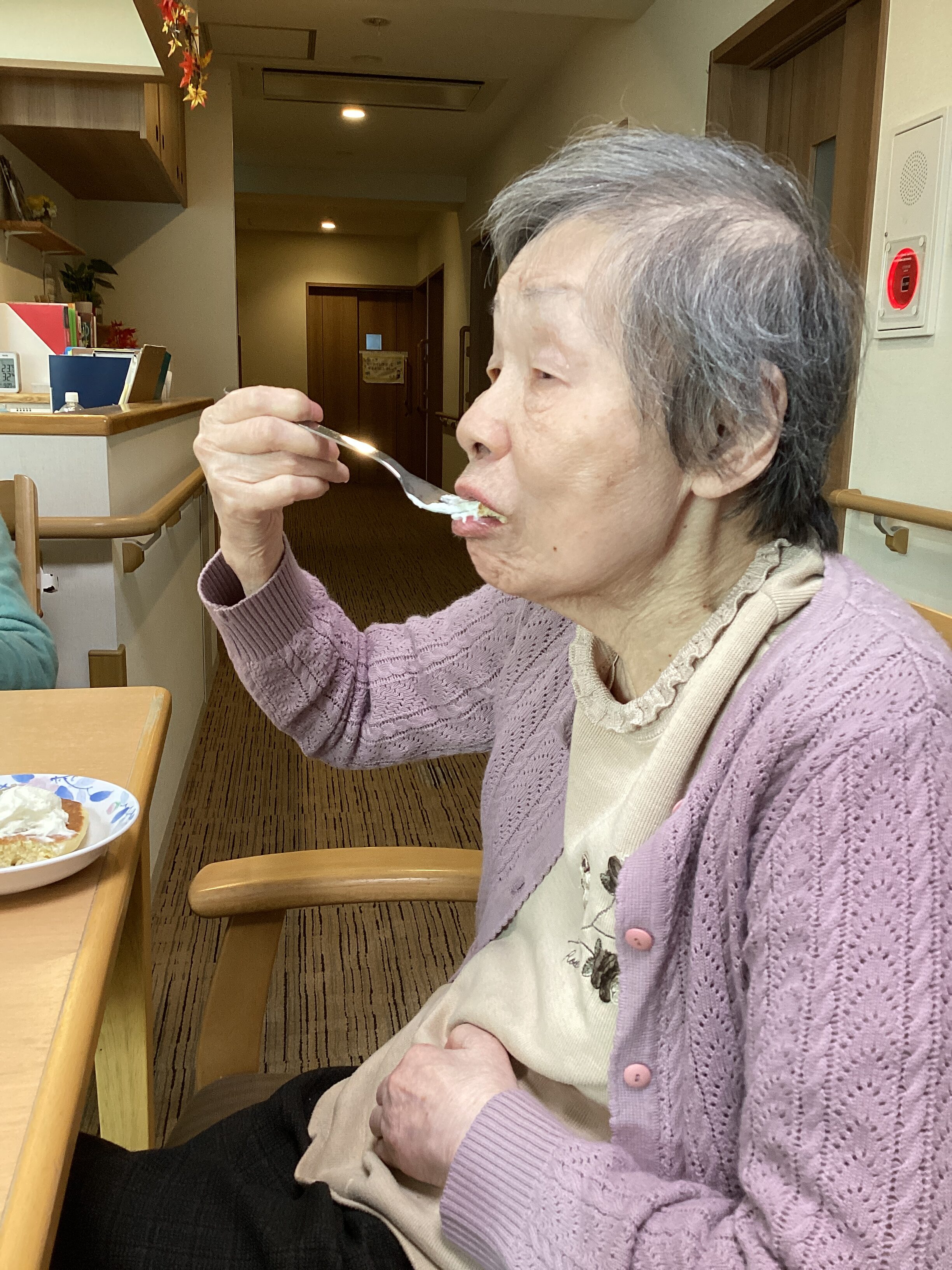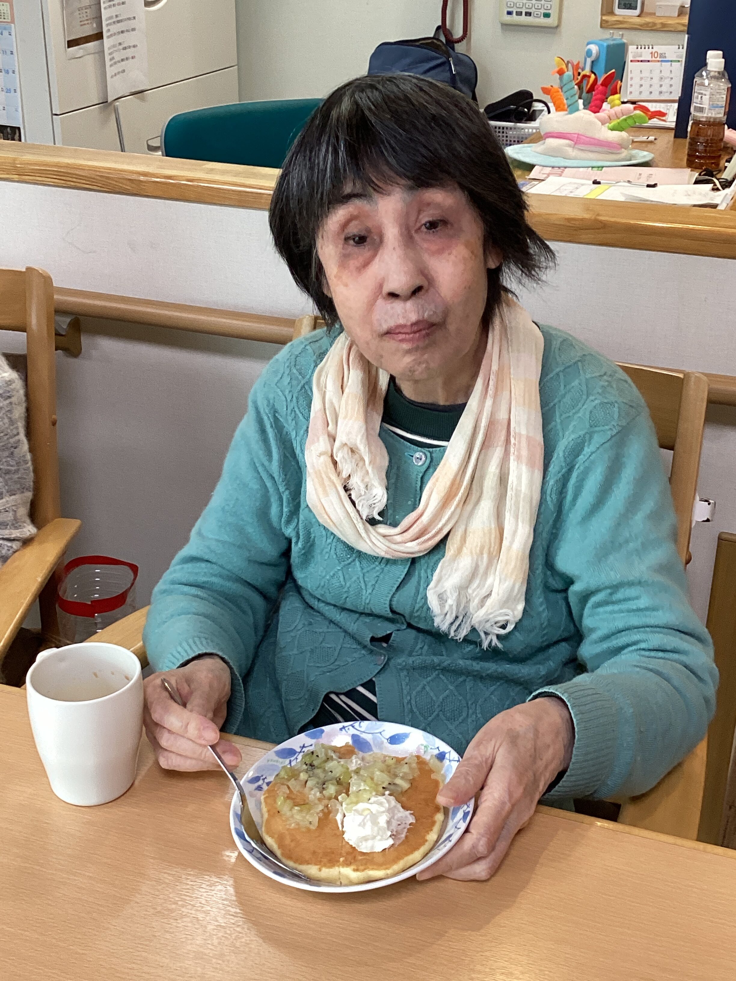 今月誕生日を迎えた御利用者様がおりました! ホットケーキとパーティ帽子で満面笑顔! つられて笑顔になっちゃハッピースマイル♪ これからも末永く宜しくお願い致します