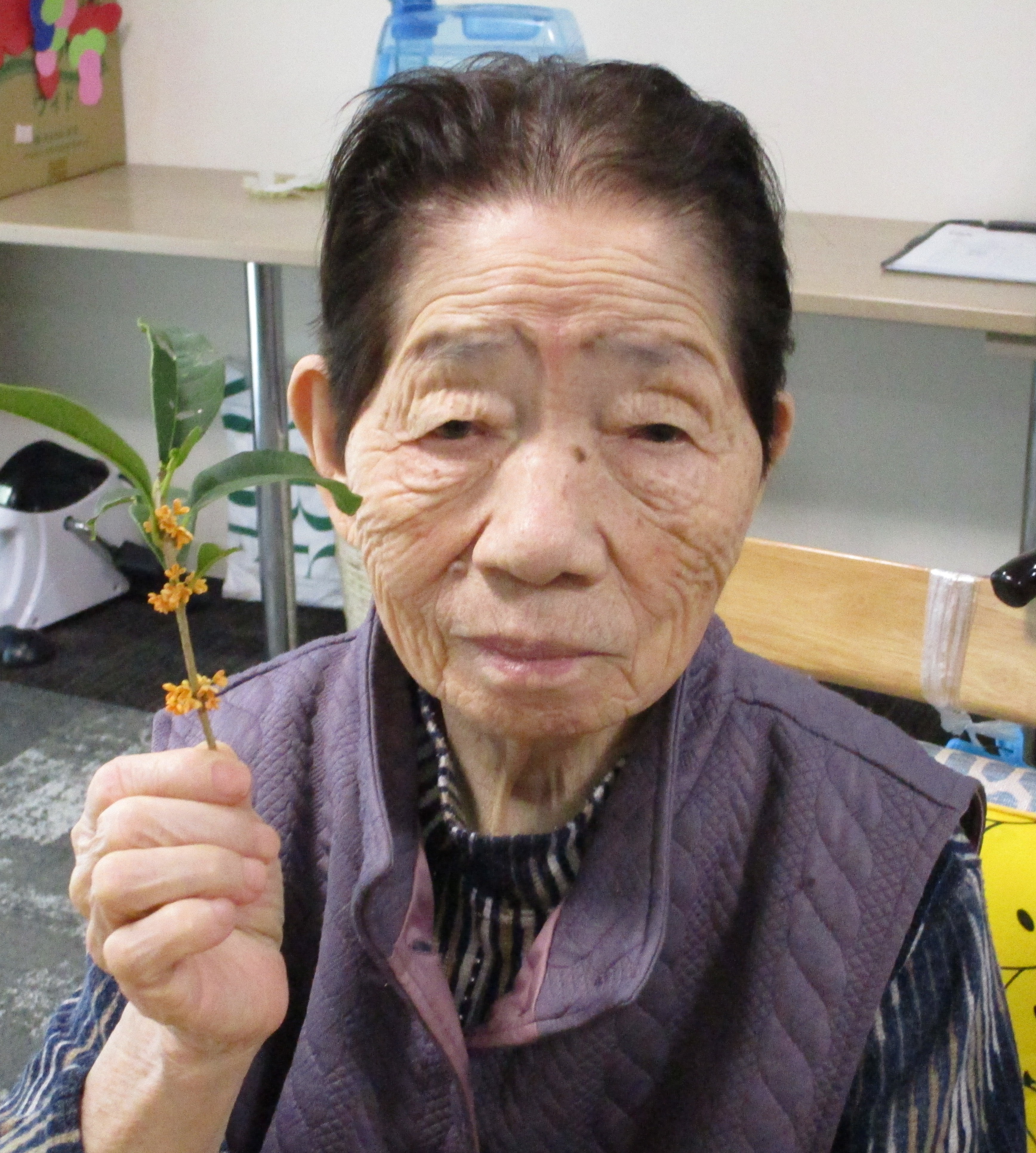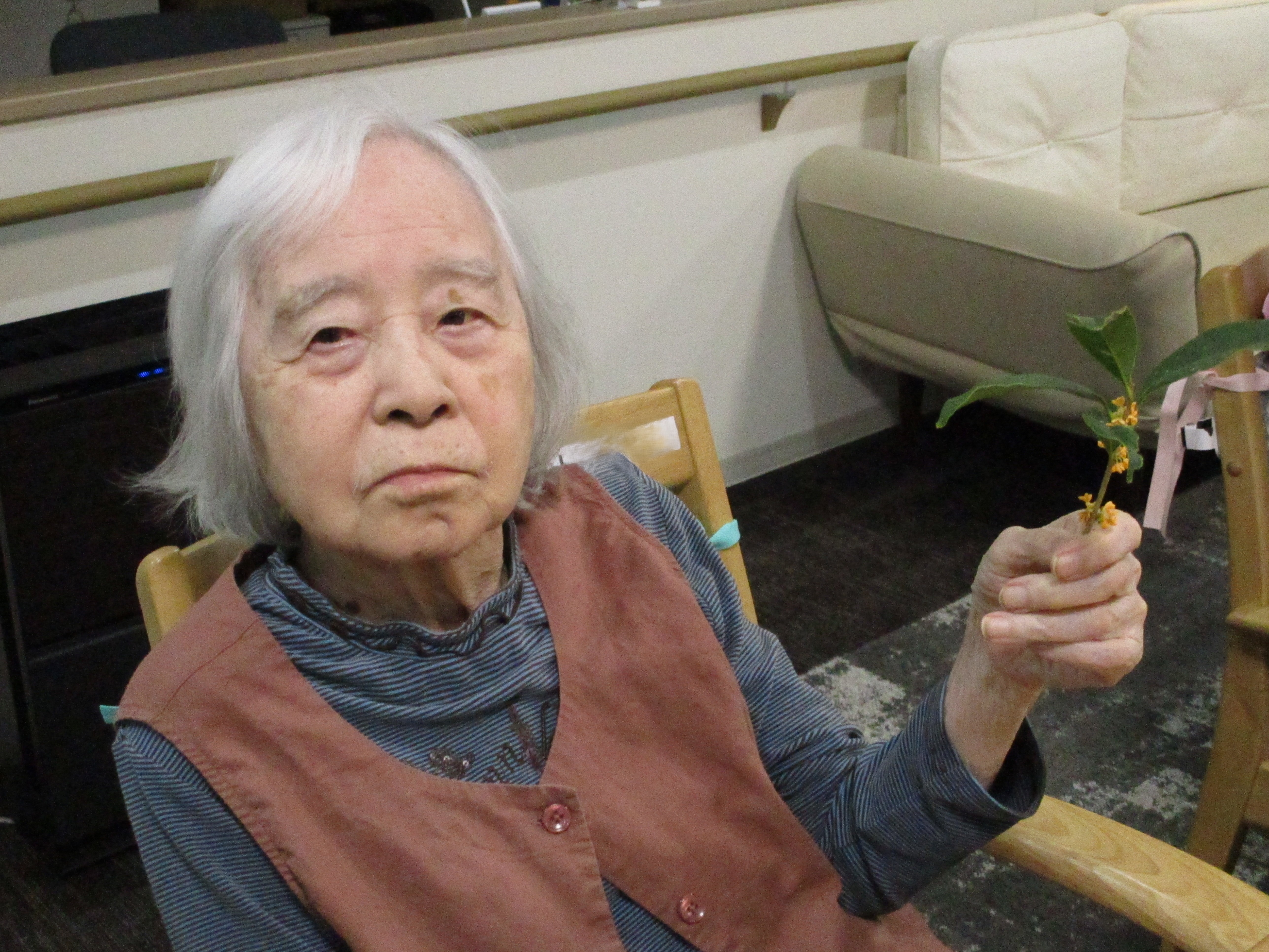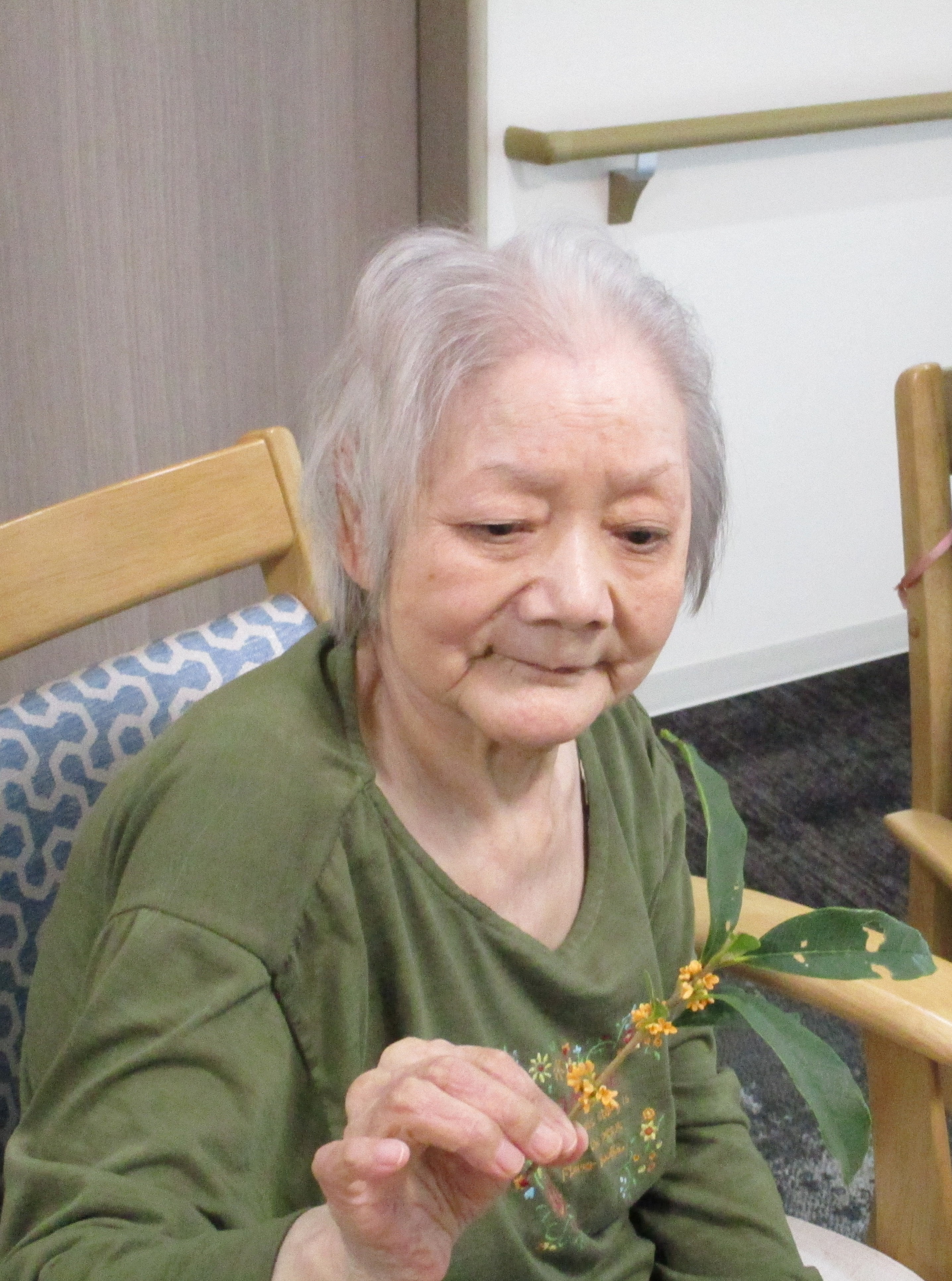 職員が自宅から金木犀の花を持ってきてくれたので、利用者様と一緒に香りを楽しみました。