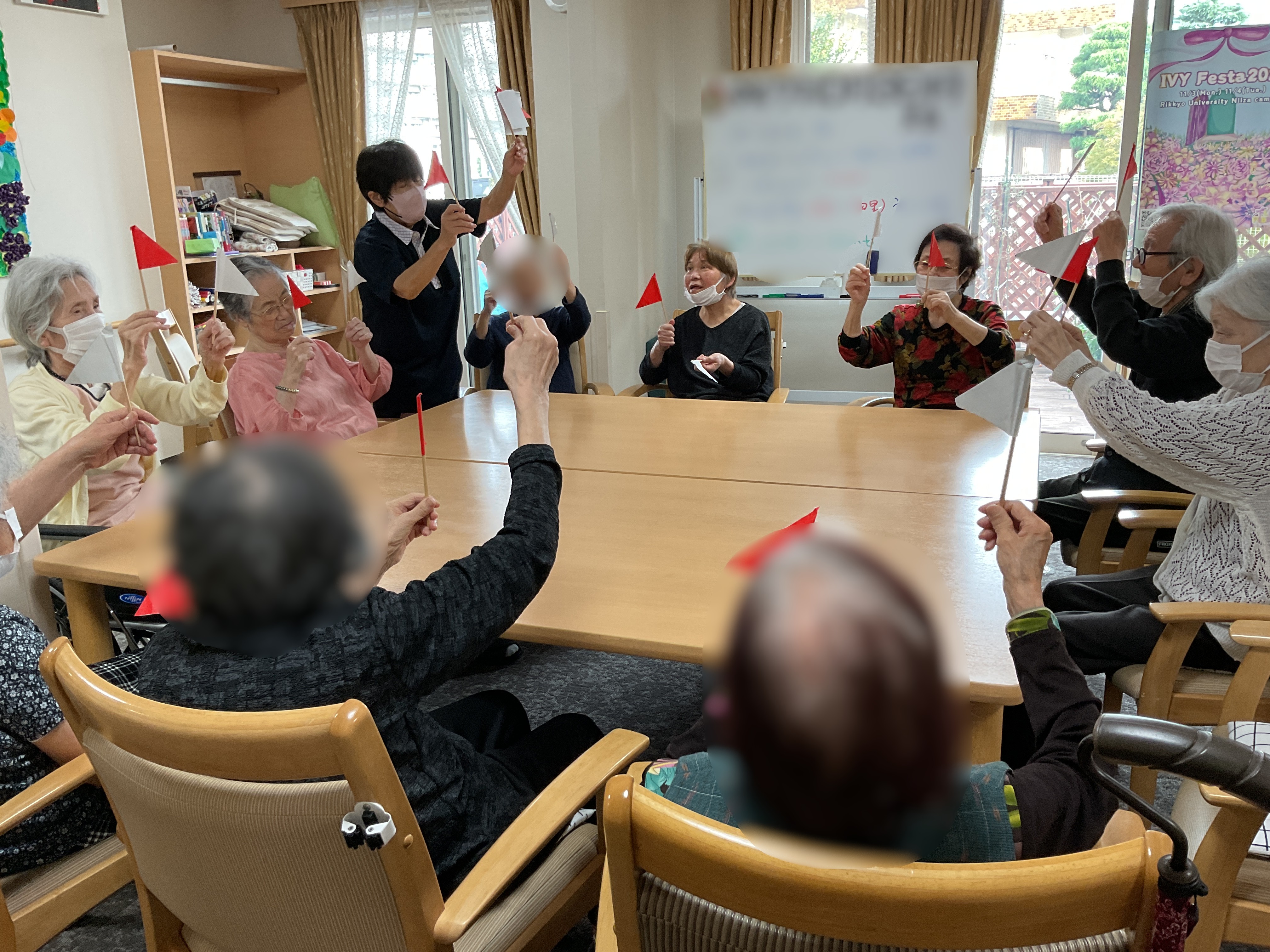 本日のレクリエーションは旗を使った旗上げゲーム。 赤あげて白上げて、赤下げないでしろ下げて。 混乱して間違えても笑って楽しく運動することができました。