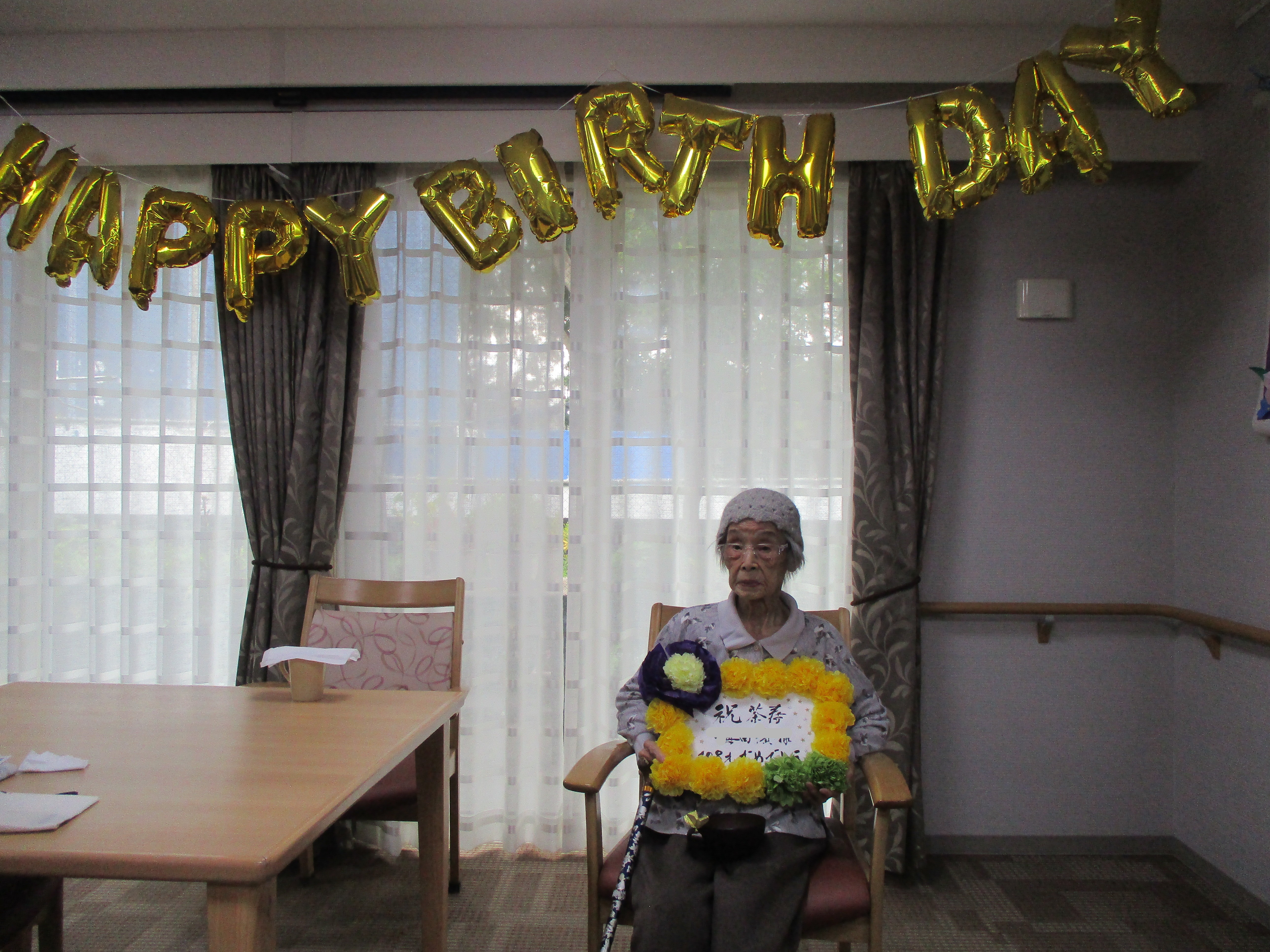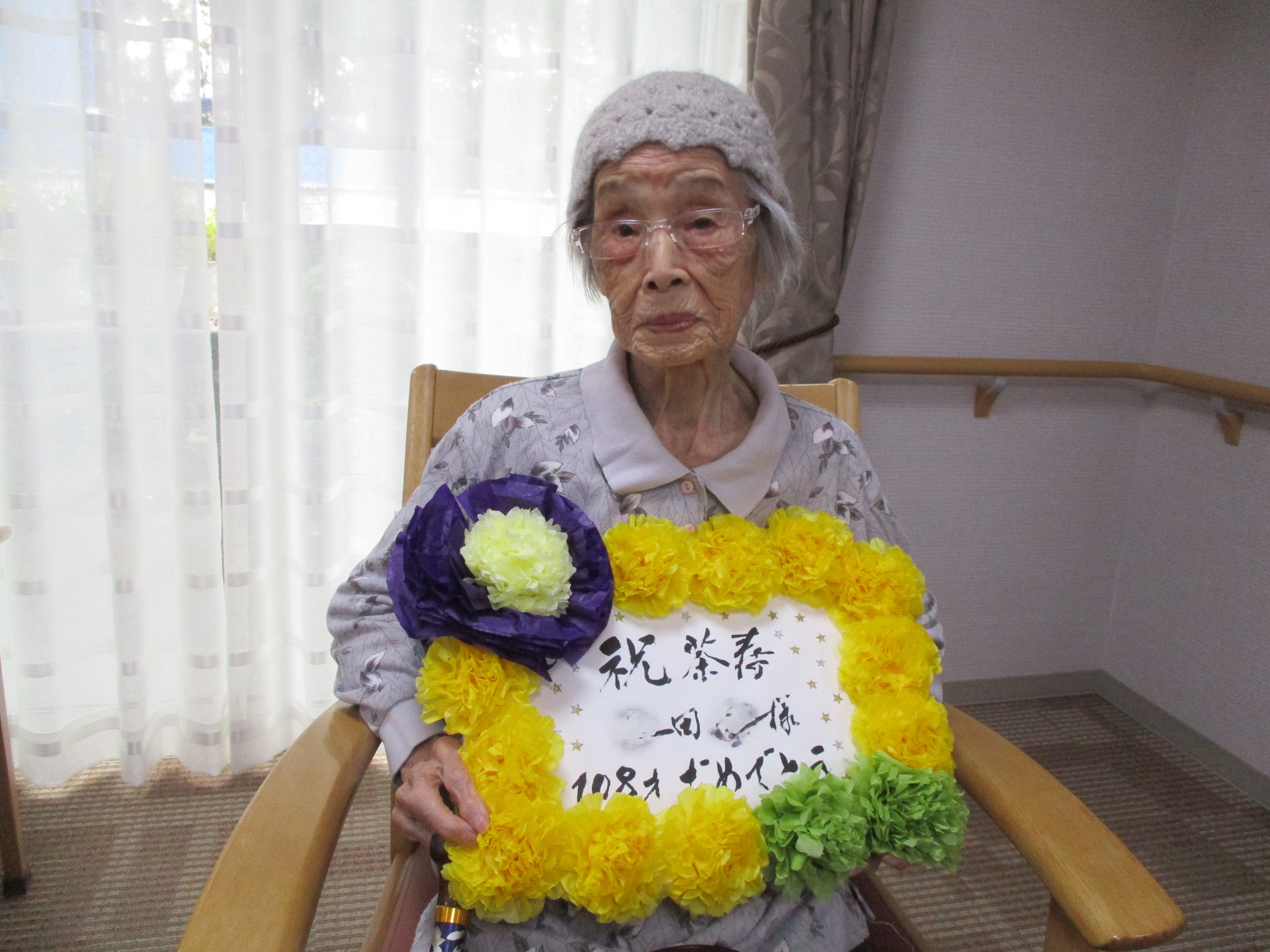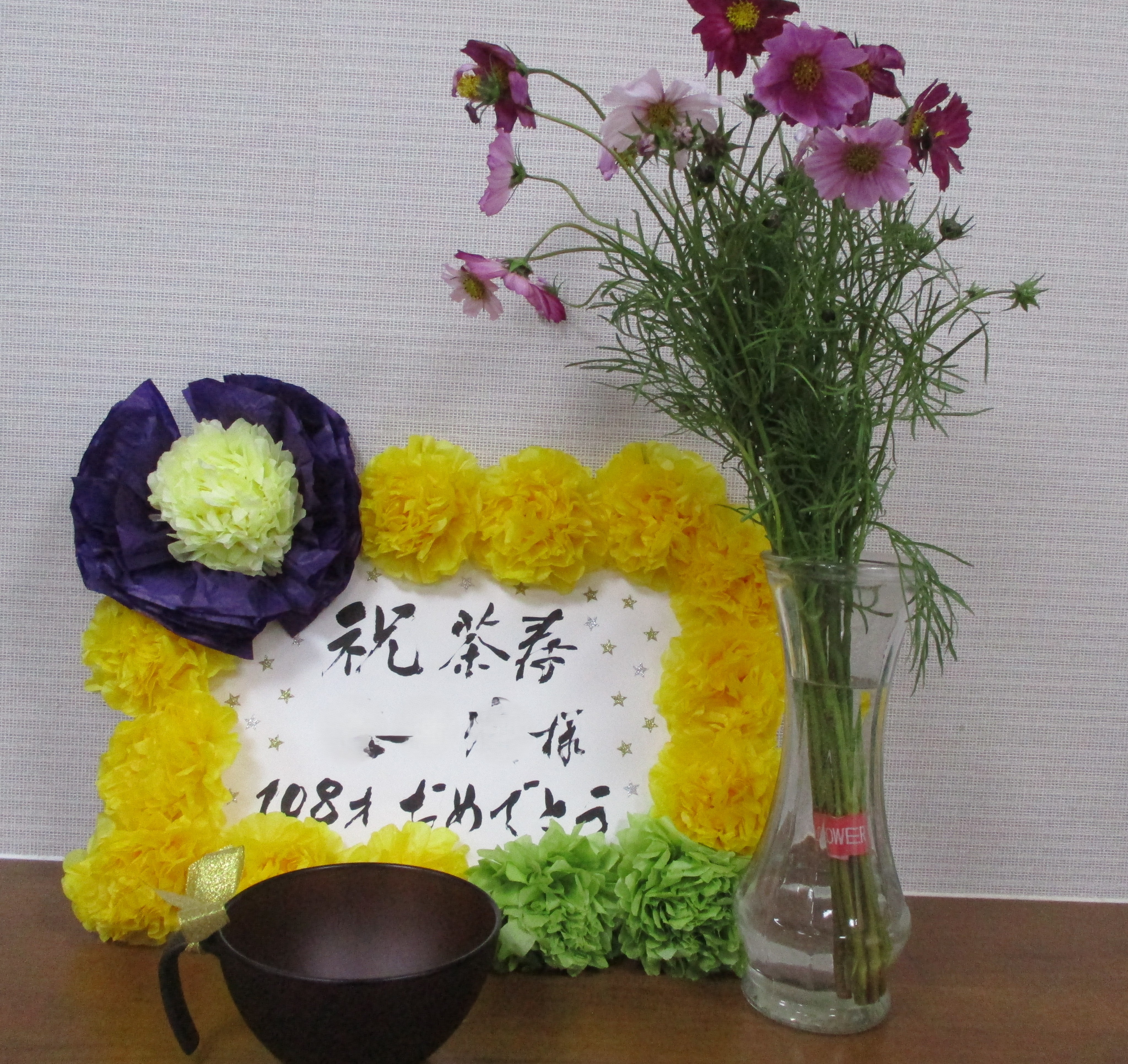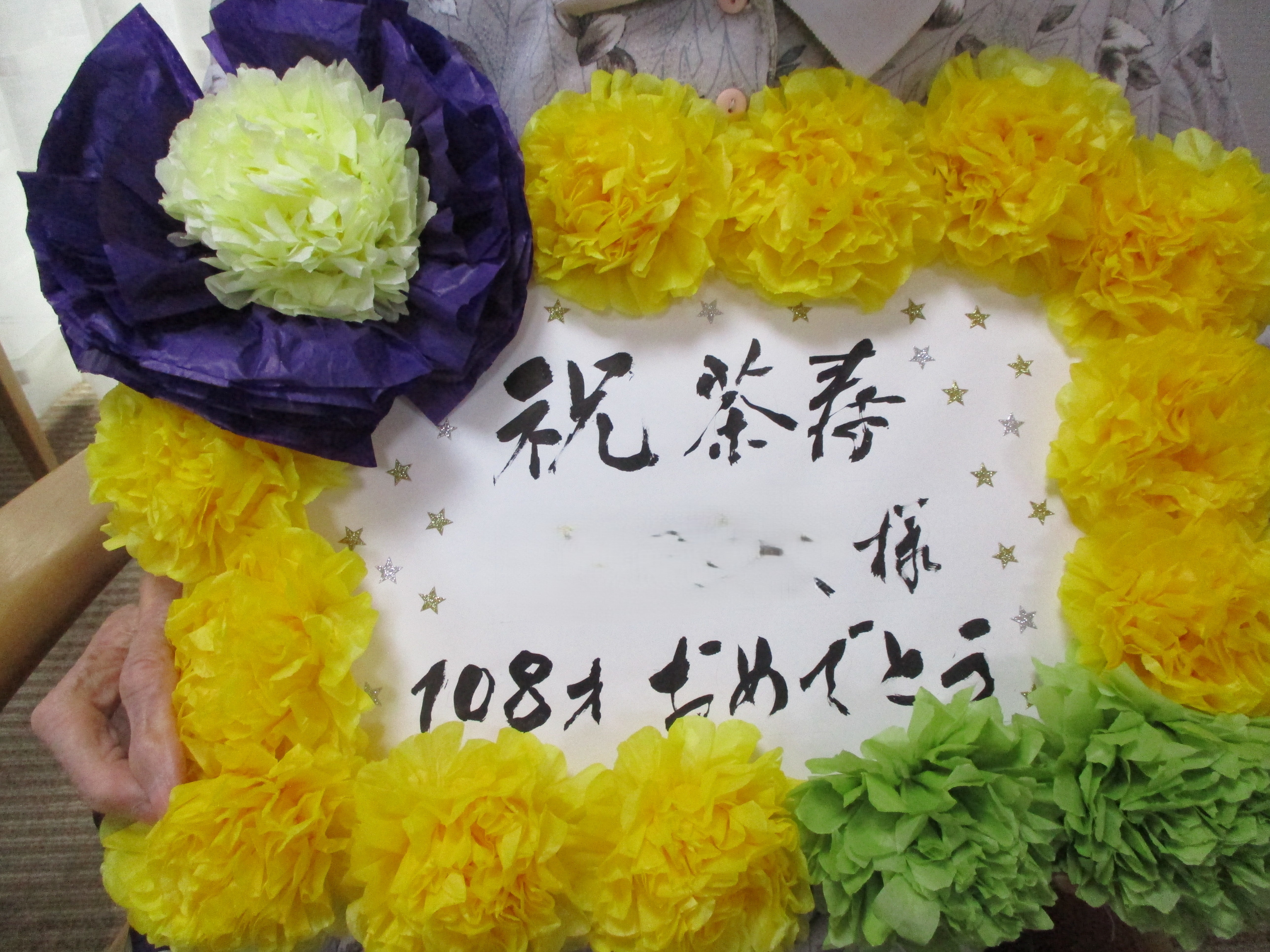 108歳を迎えられました!108歳はなんて言うんだろう~?調べたら「茶寿」と言うそうです。彼女の元気の秘訣は、良く食べて、良く寝る事です! まだまだ、杖を突き歩きます!トイレも自分である程度は出来ます!元気でいて下さいね~(⋈◍>◡<◍)。✧♡