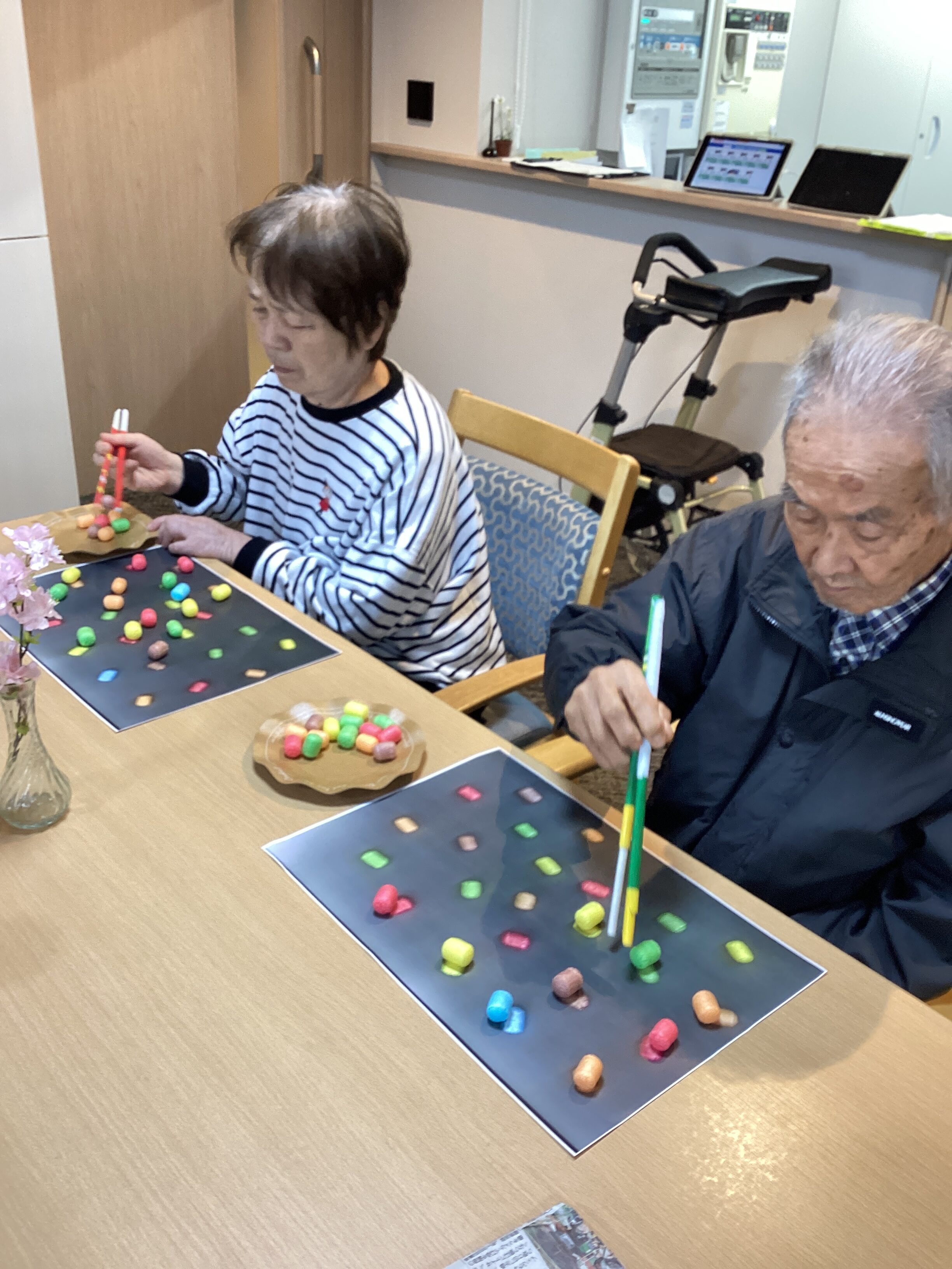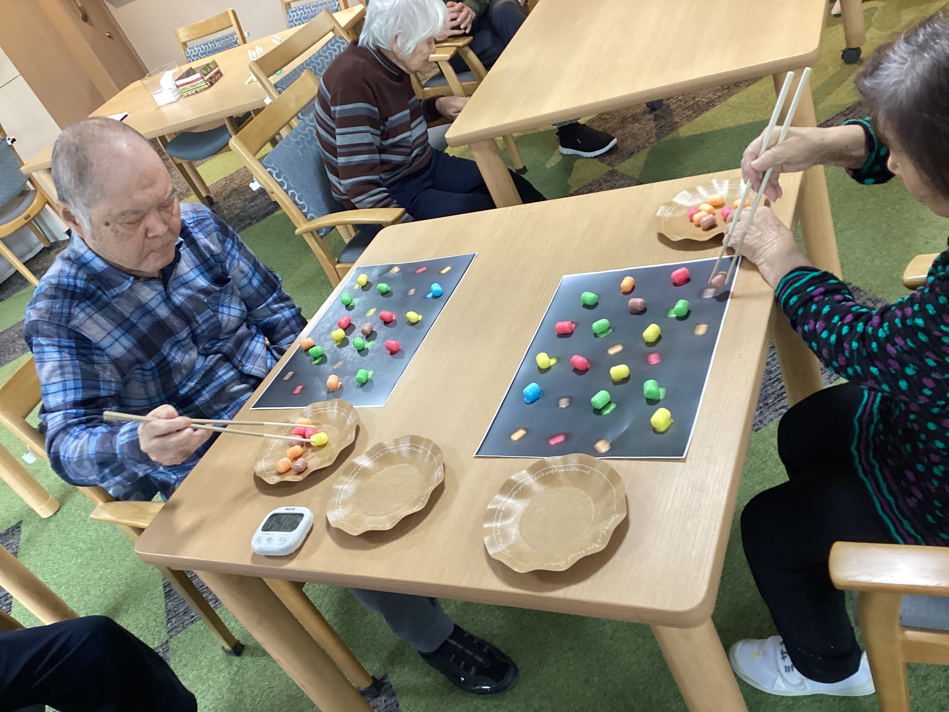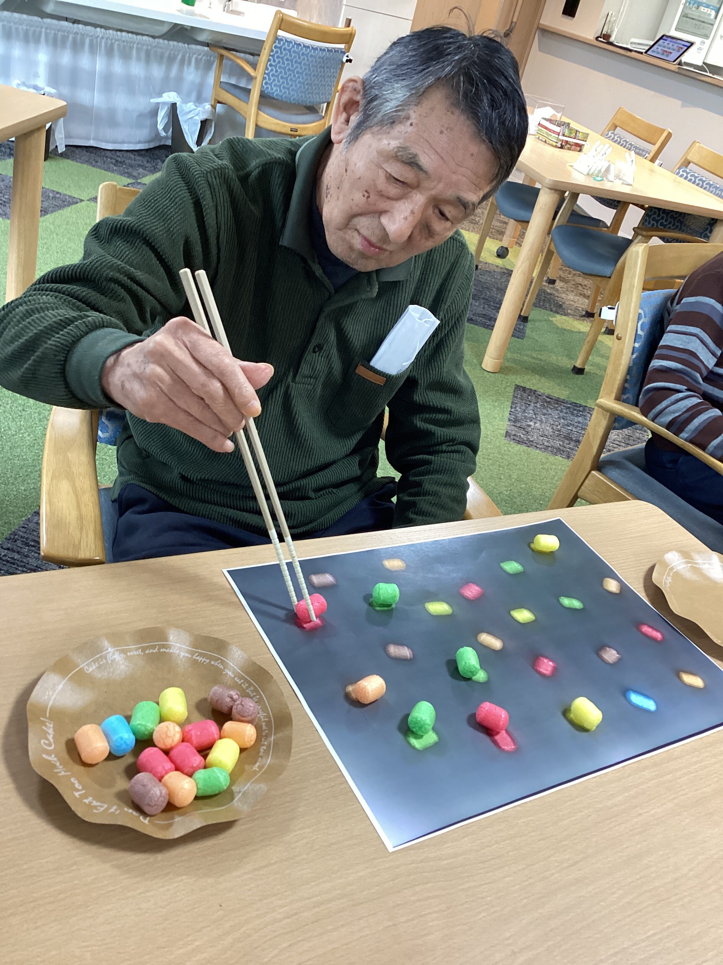 お箸を使って丸いスポンジボールを乗せる脳トレゲームをしました🍀