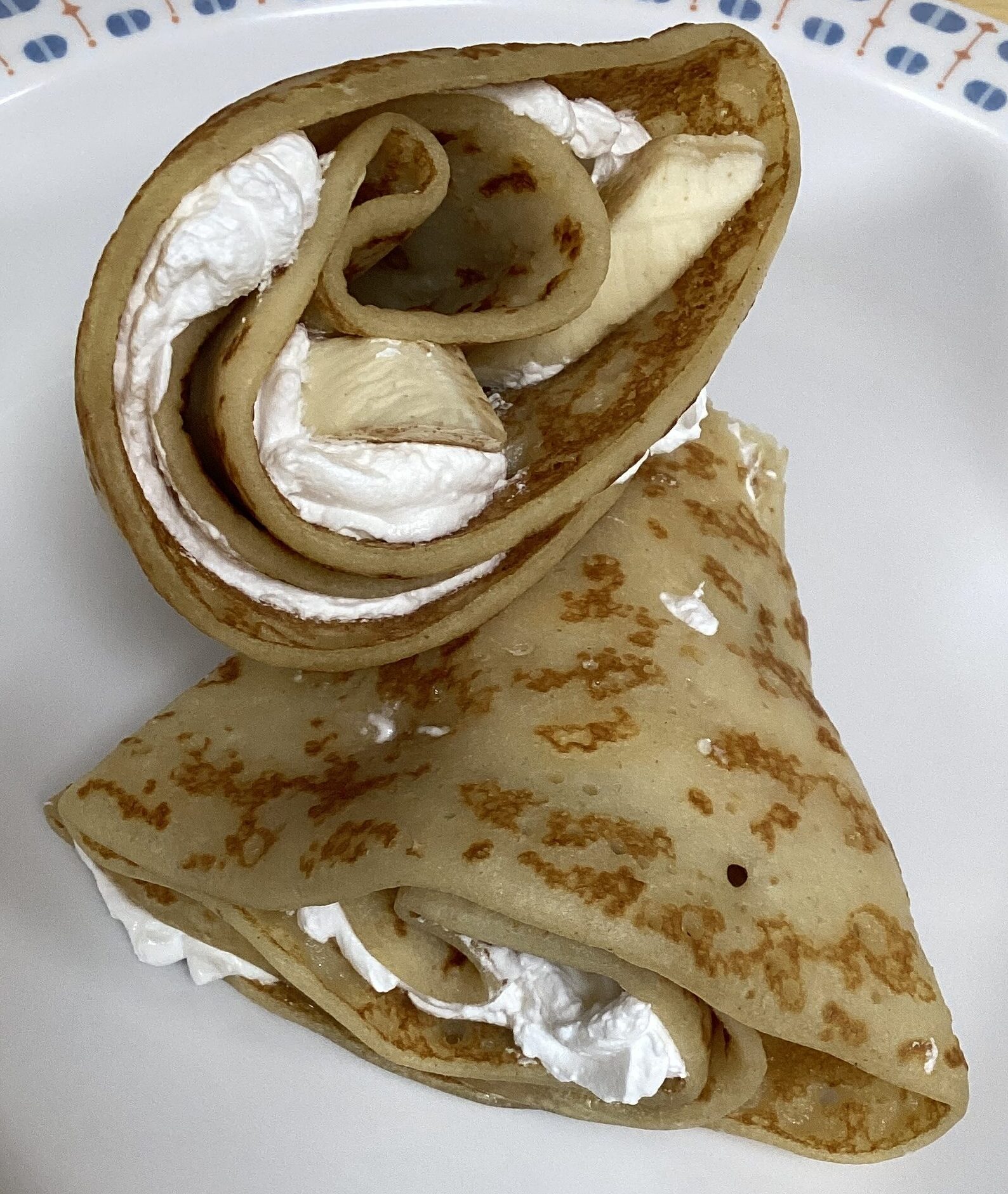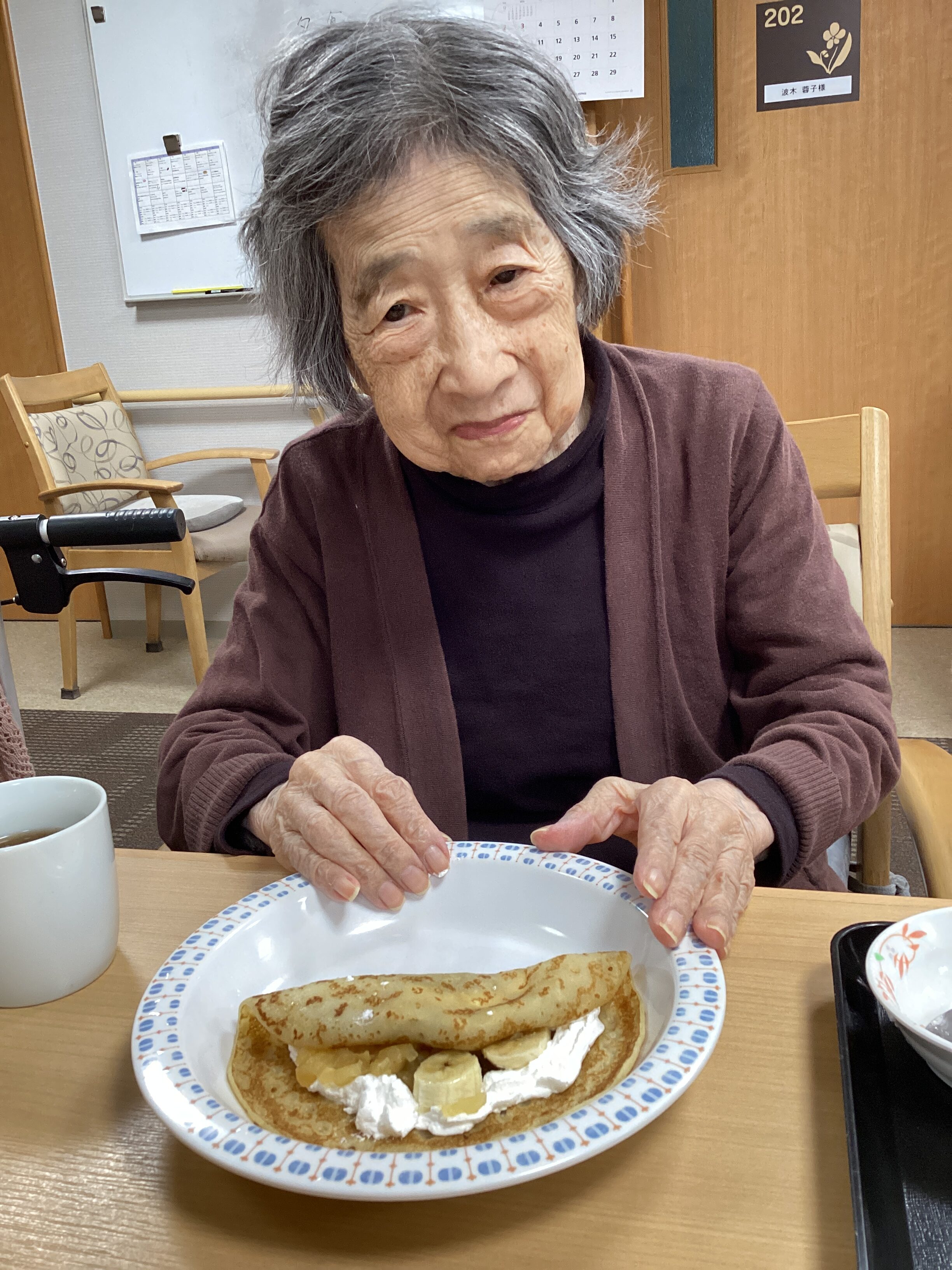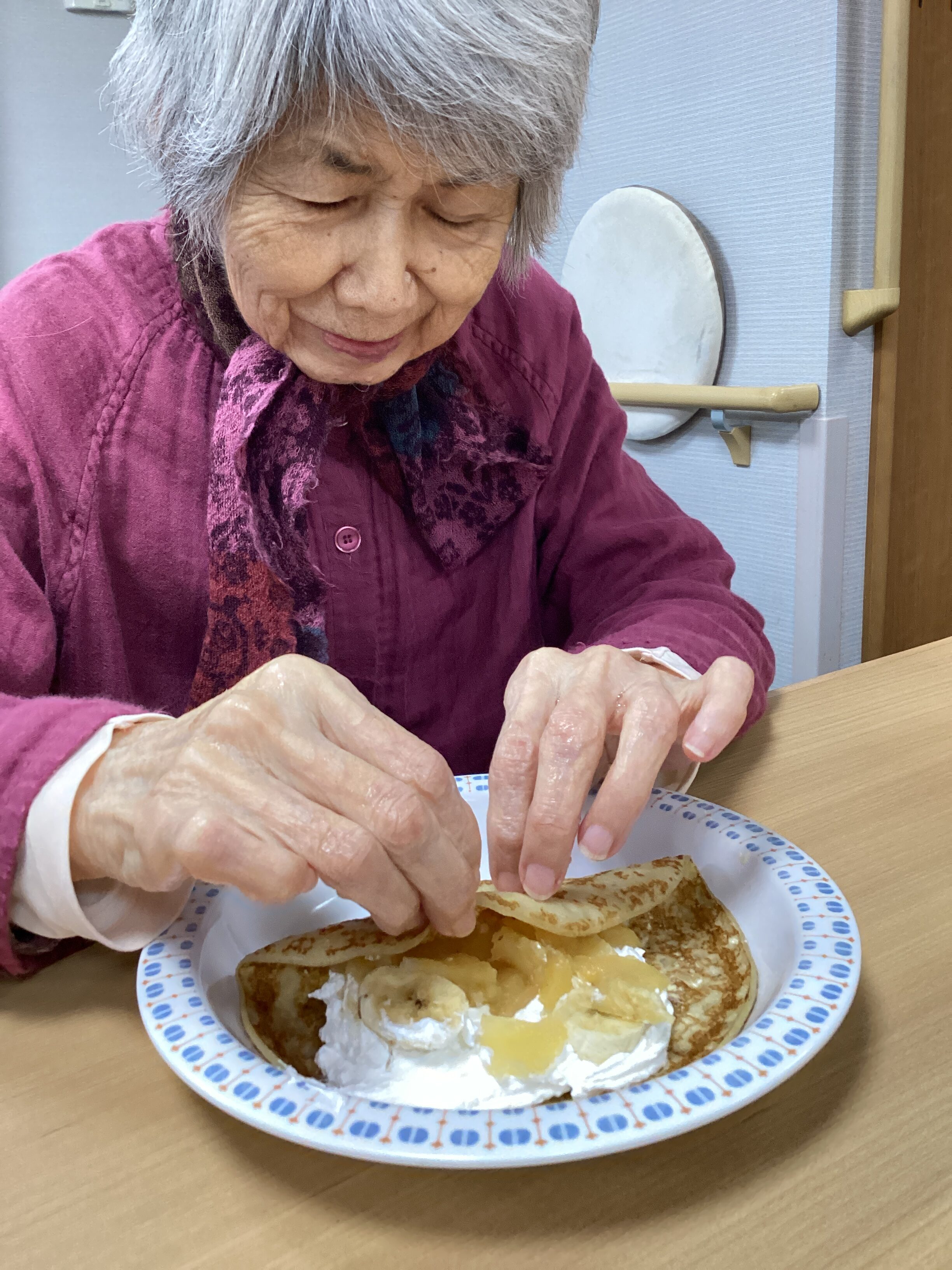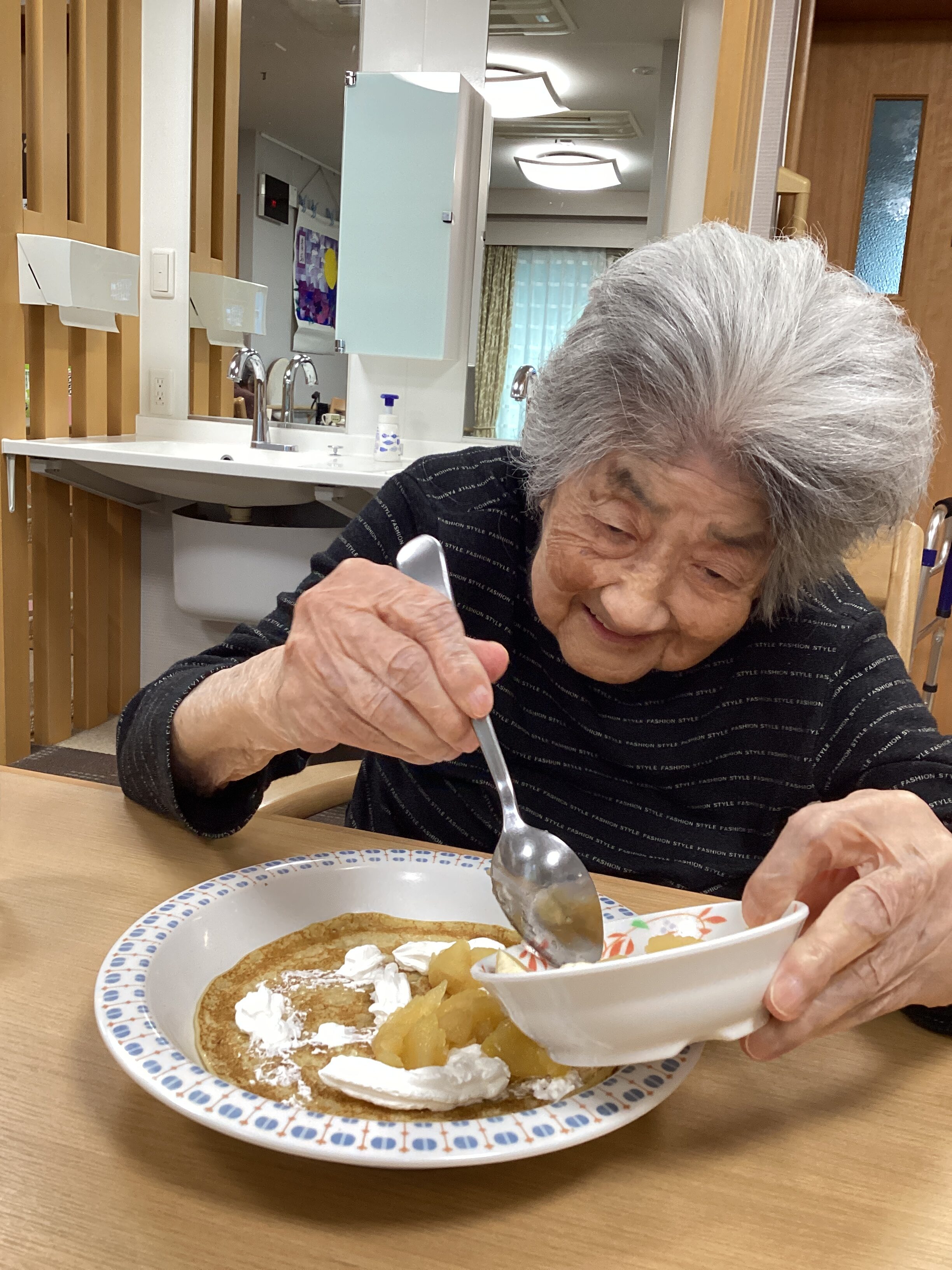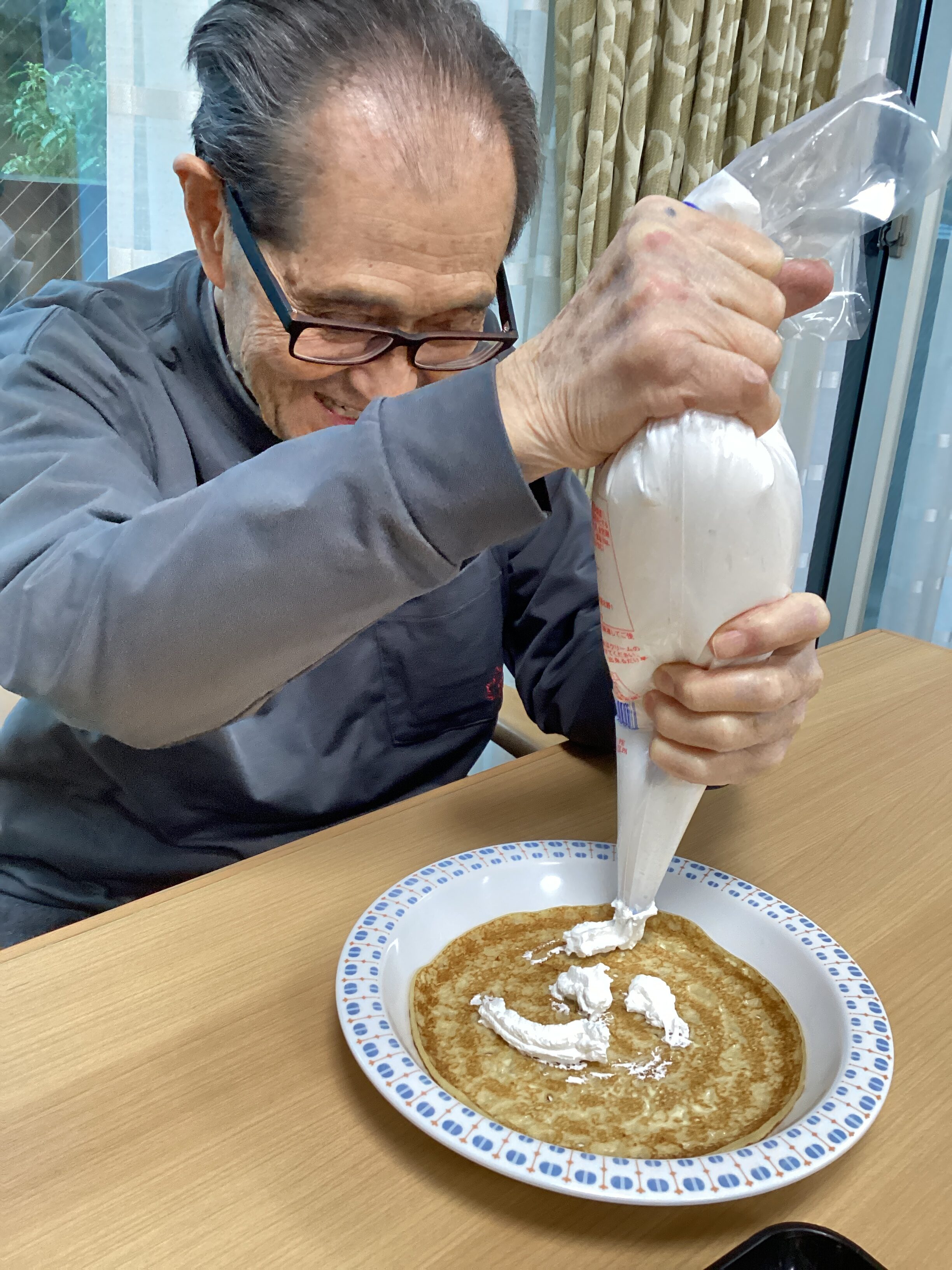生クリームを絞って~、バナナをトッピングする人、りんごのコンポートを入れる人、お好みでどうぞ~(^_-)-☆自分で作ると美味しさ2倍だね!