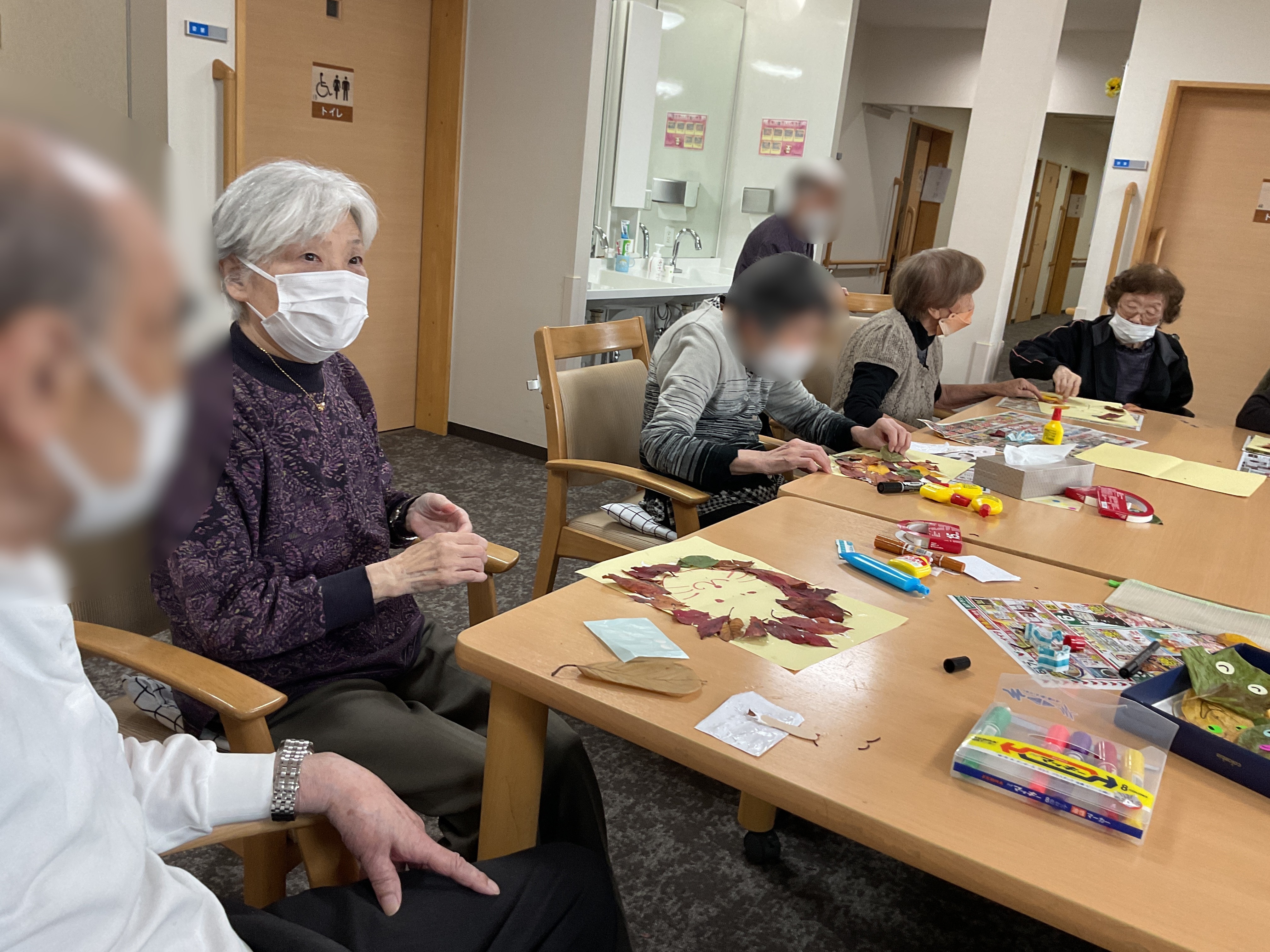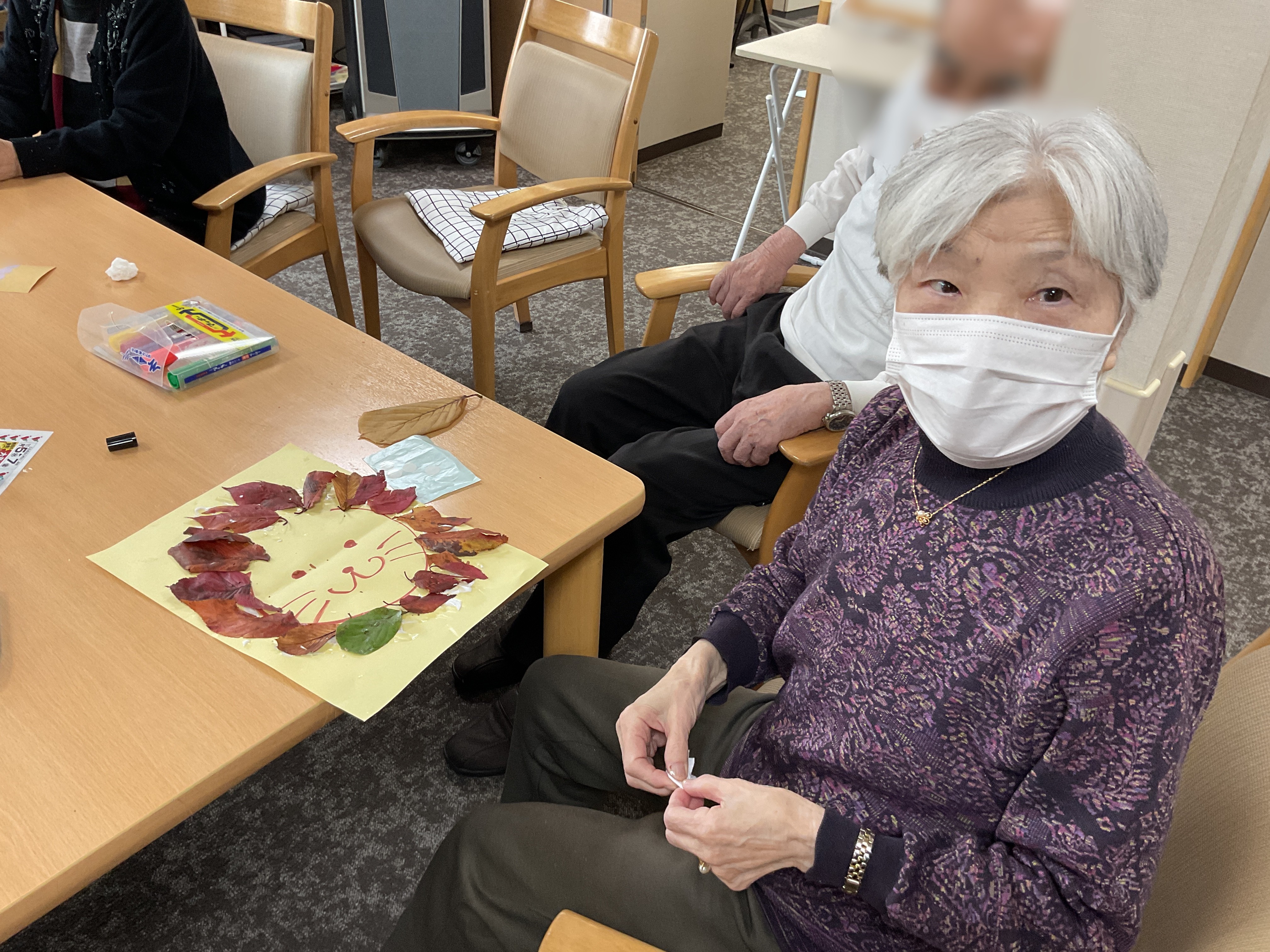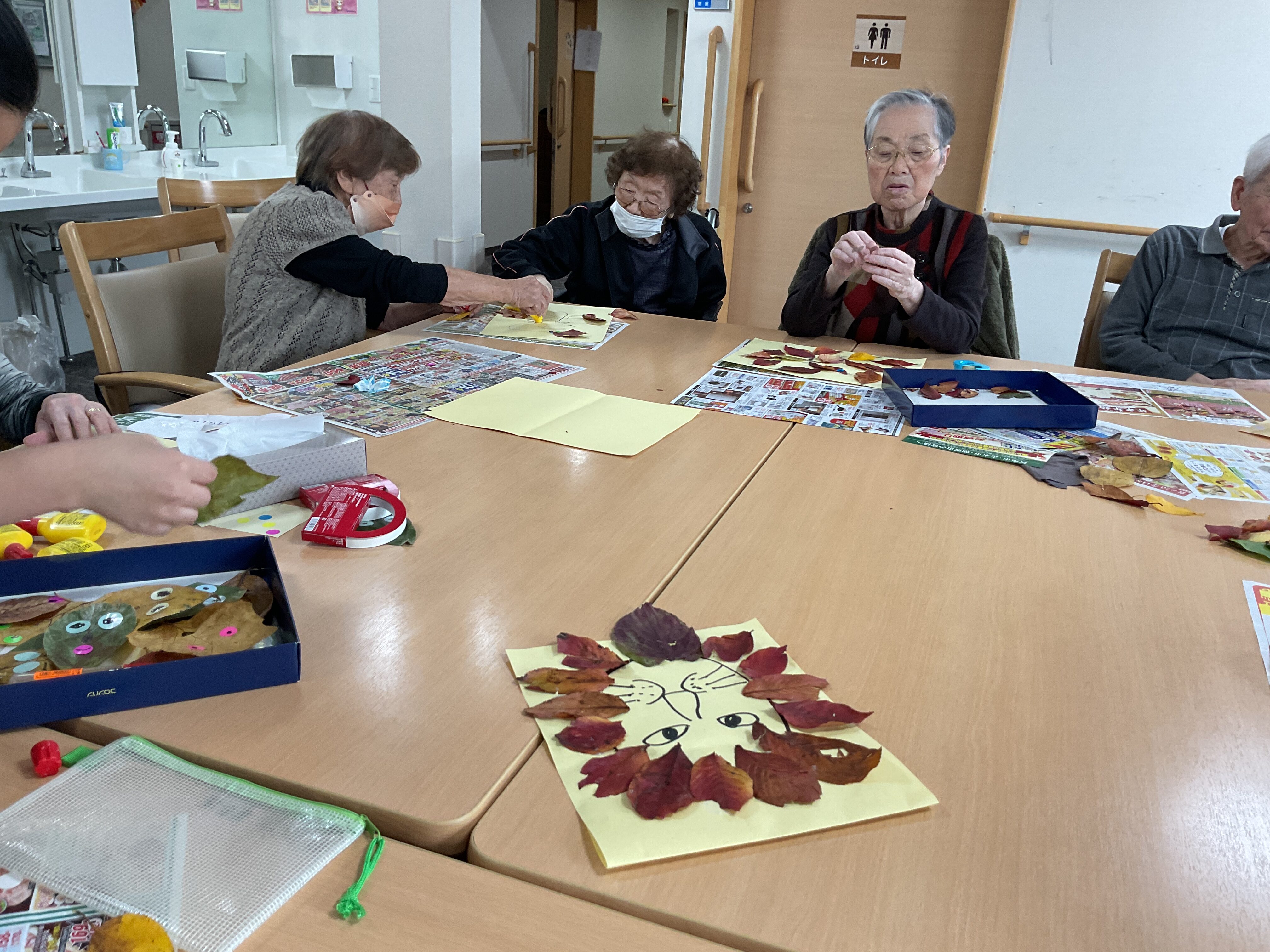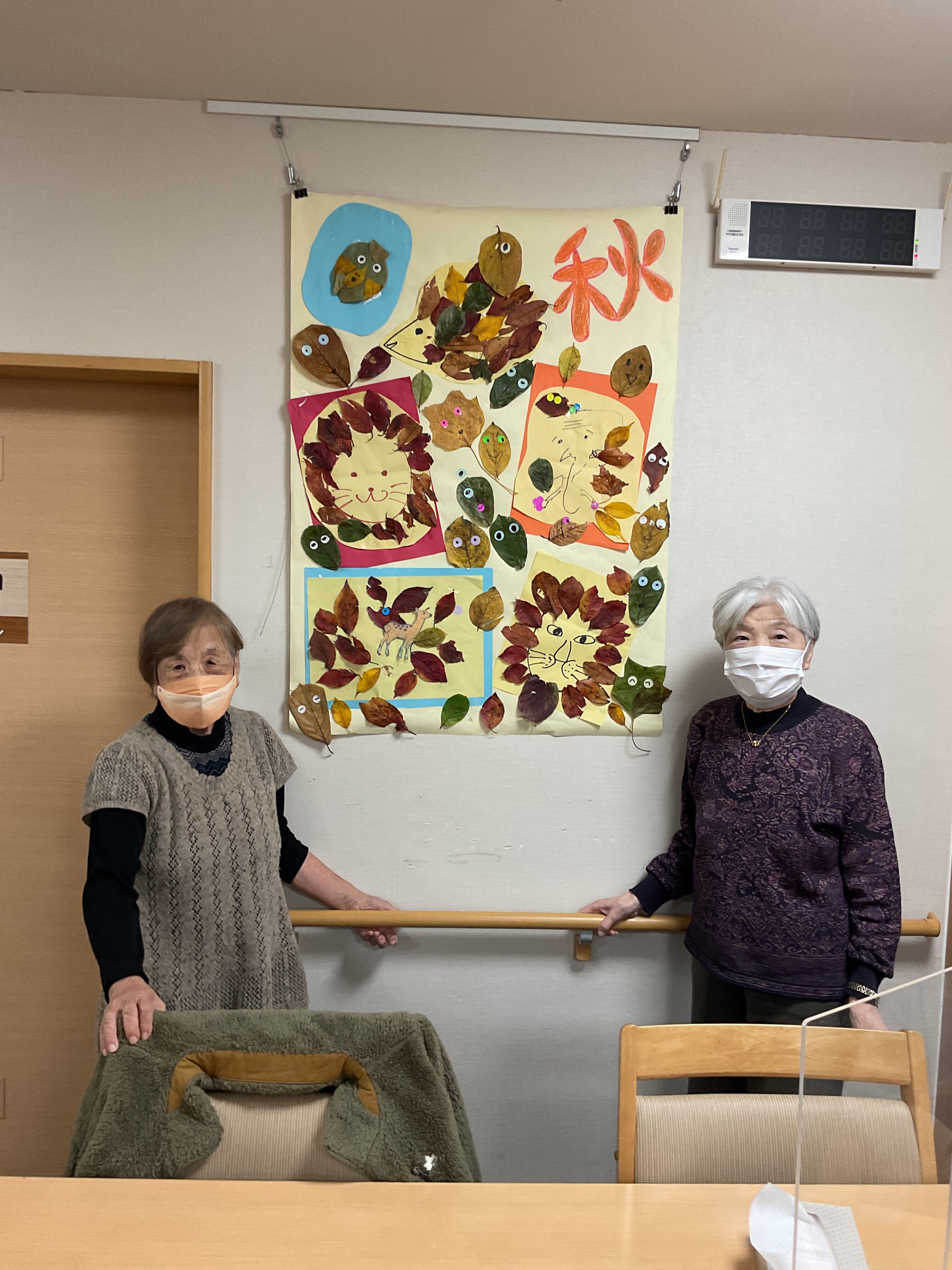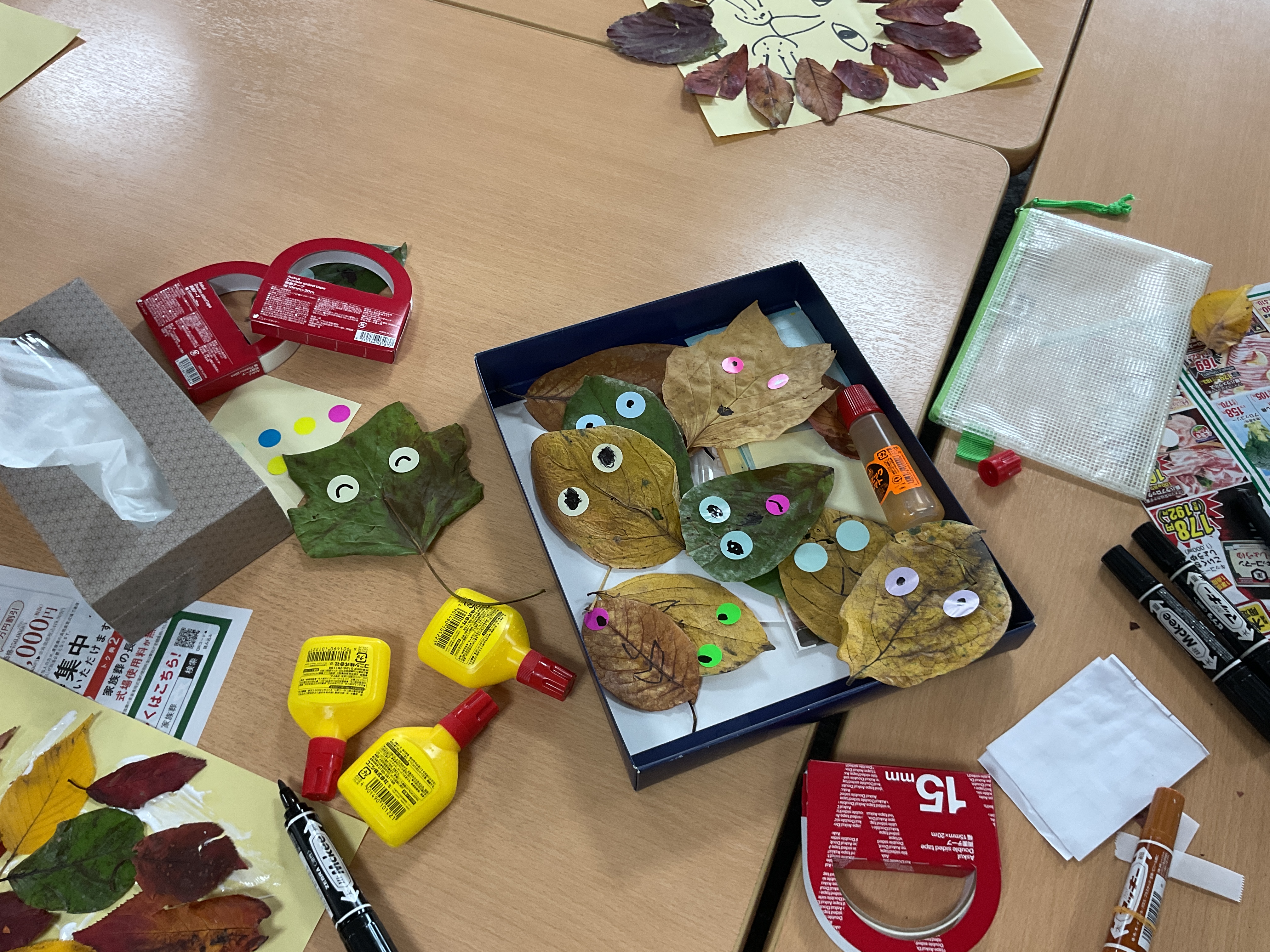 秋の落ち葉を使った工作をしました。 洗いアイロンをかけた落ち葉を画用紙に張り、ライオンやハリネズミを作ったり。 落ち葉に目をつけたりして楽しみました。 いろんな表情が出来ましたね!
