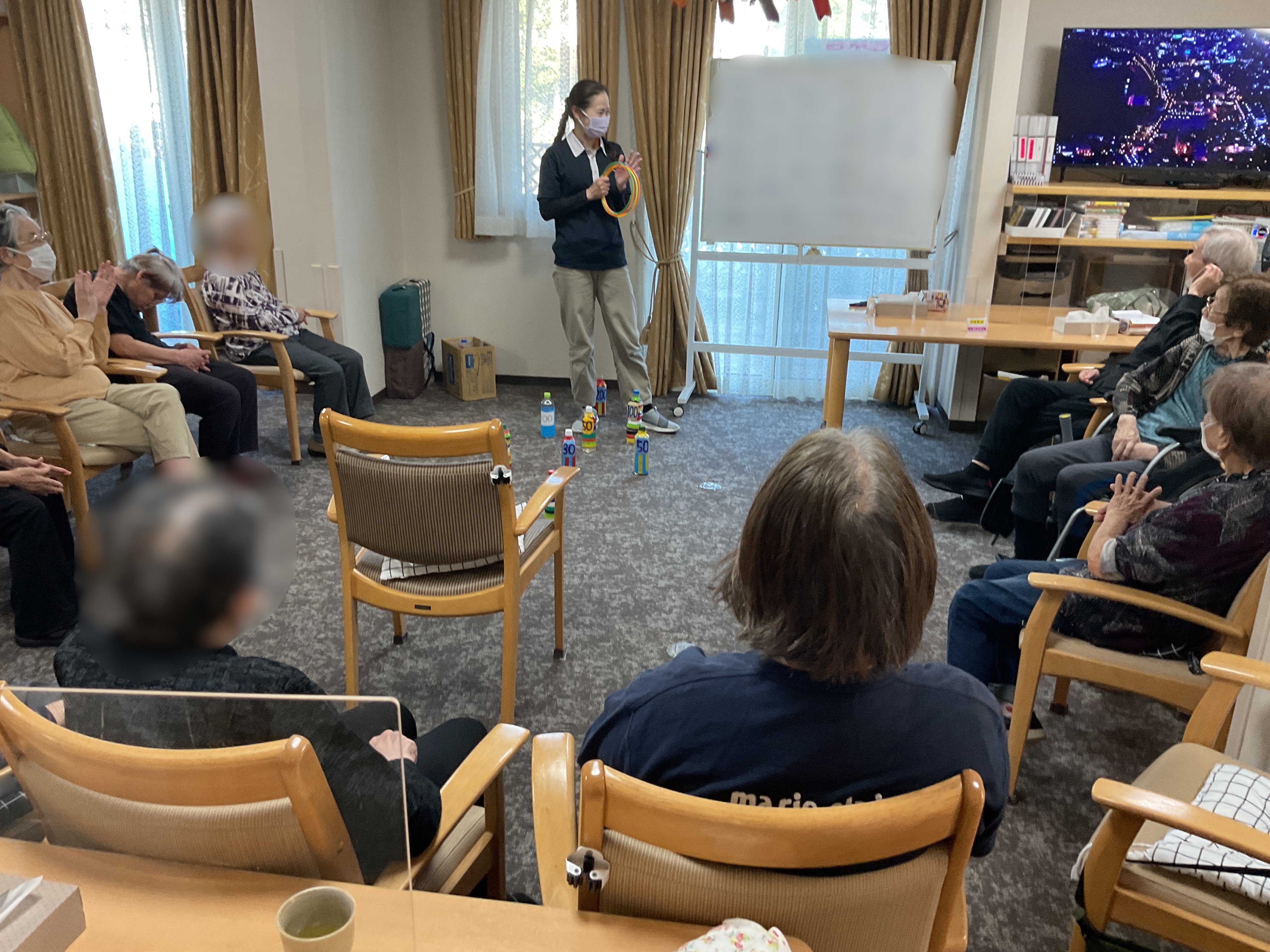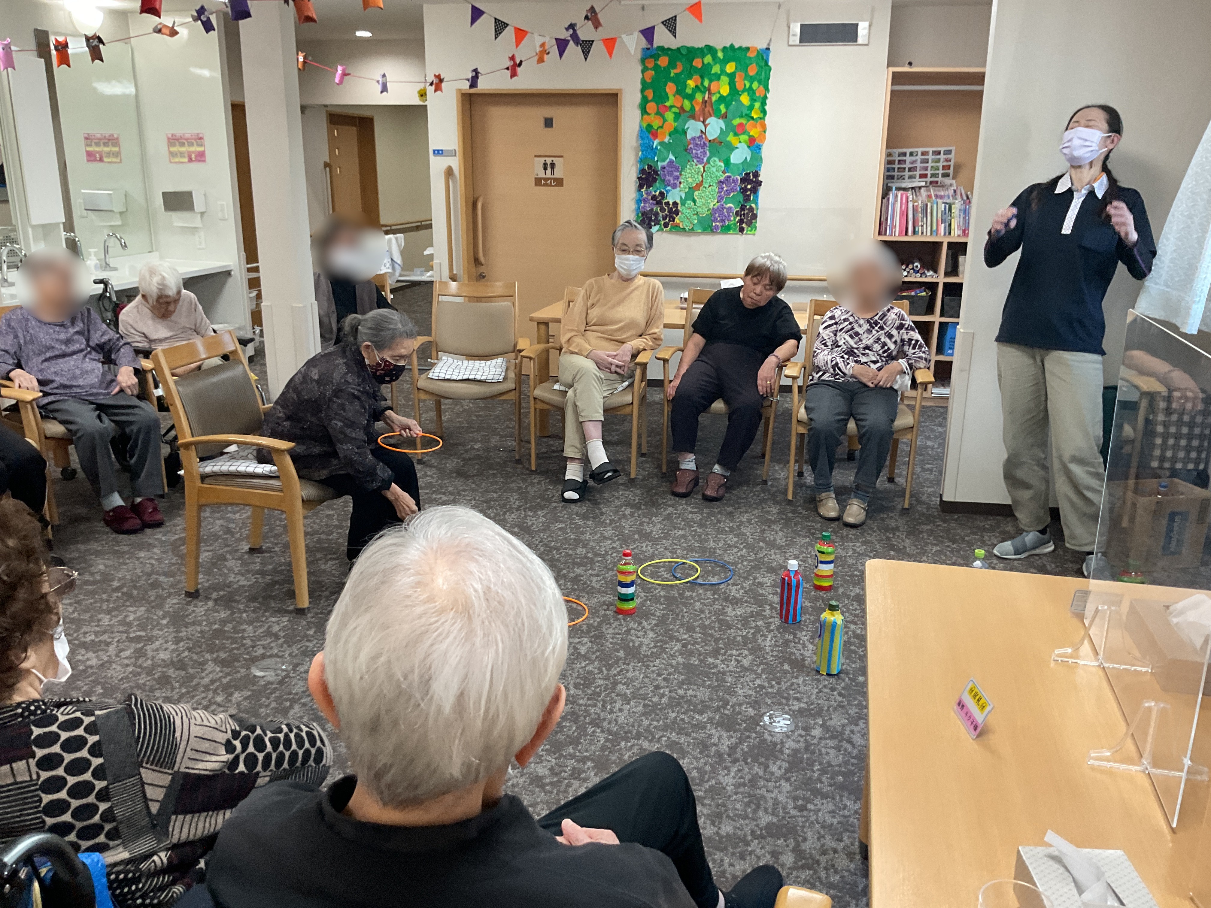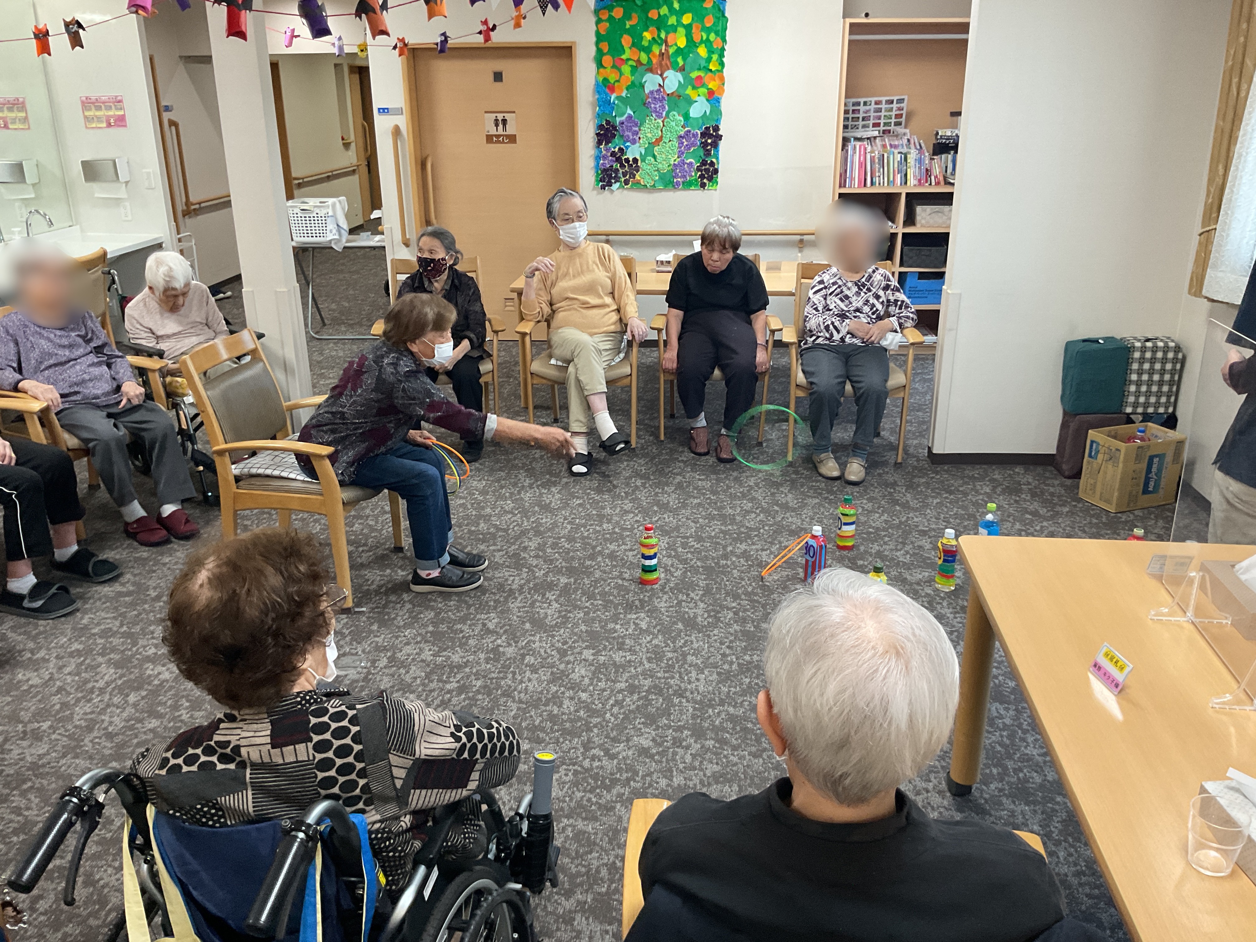 今日のレクは輪投げをしました。 ペットボトルに水を入れることにより、輪が当たっても倒れずに遊ぶことができます。 熱中しすぎて椅子から腰を上げちゃダメですよ?