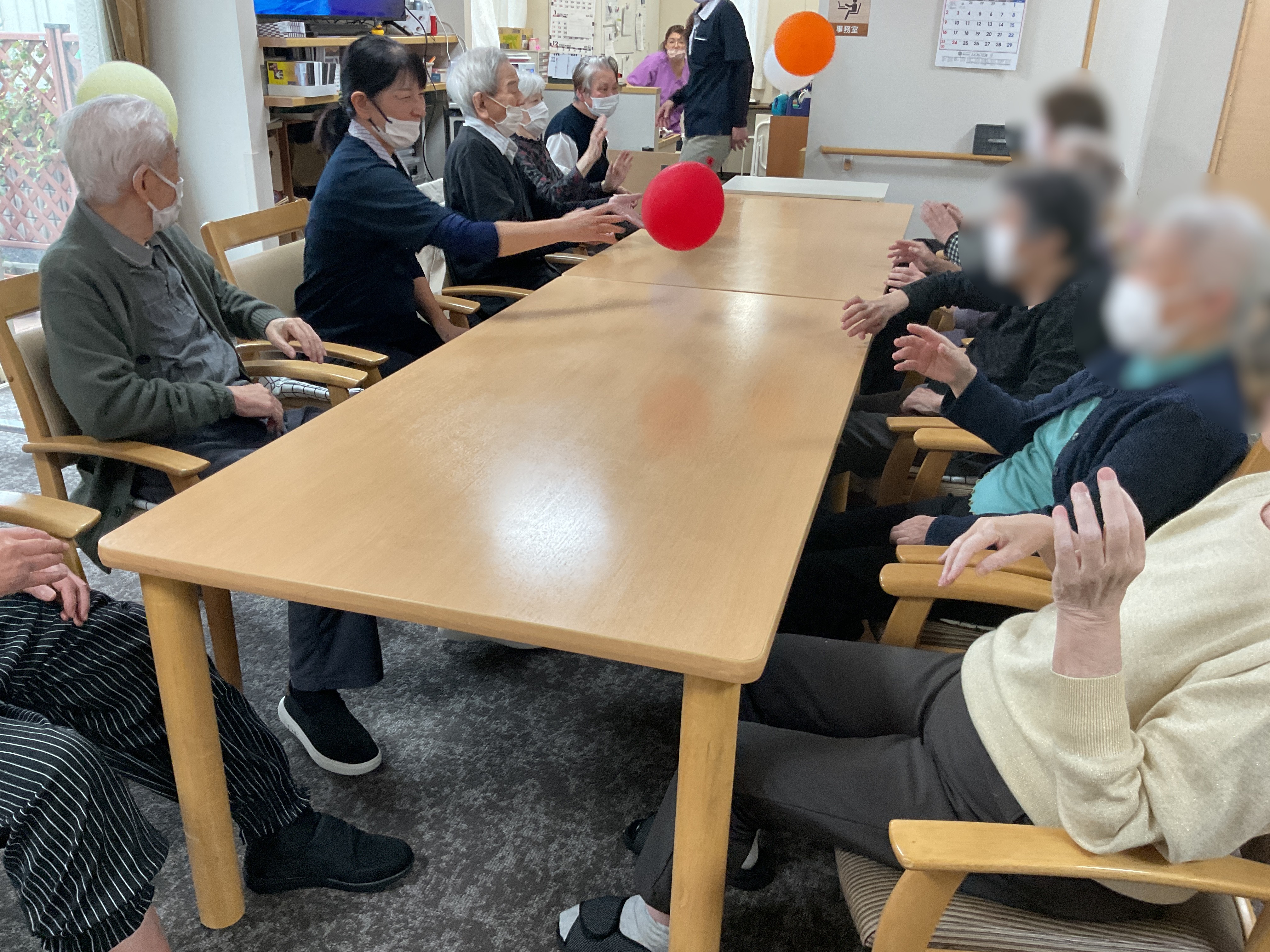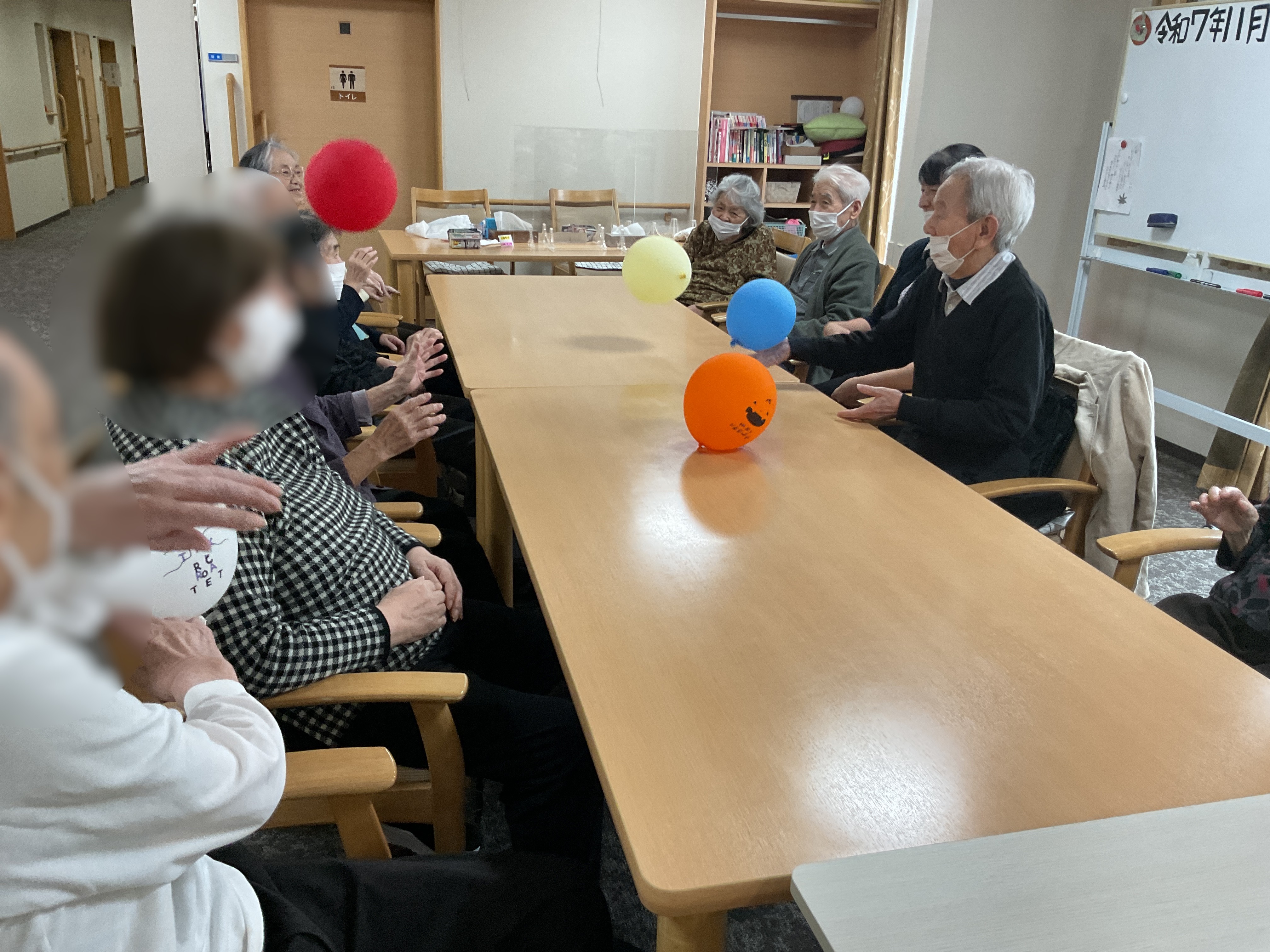 今日のレクレーションは風船を使った運動をしました。 ハロウィンイベントで利用した風船も混ぜてみました。 机に向かい合って風船をポンポン、思わぬ方向に飛んでって思わず笑ってしまいます。