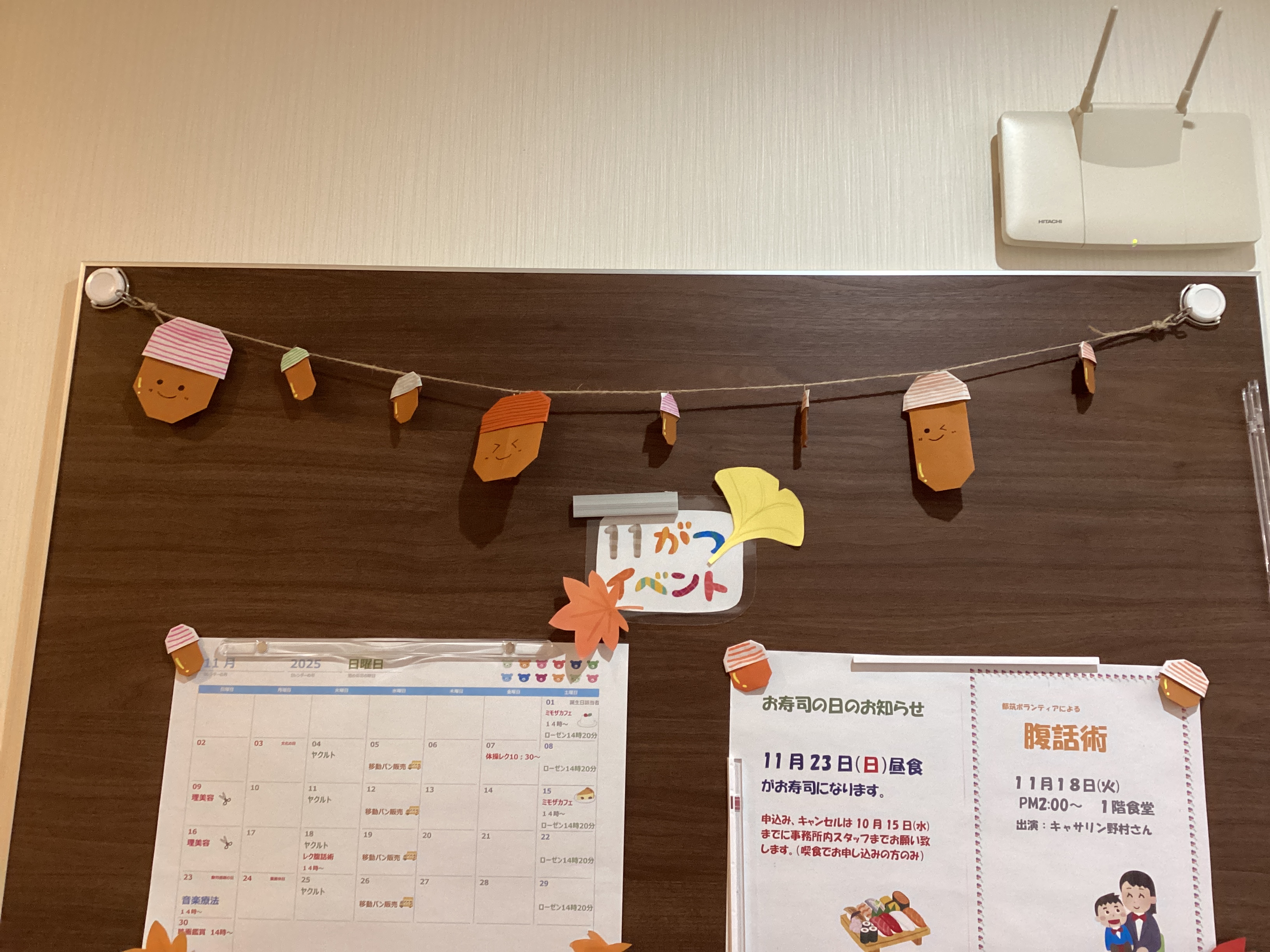 長く続いた暑さも終わり、肌寒い季節となりました。外の紅葉に負けぬよう、掲示板も秋の装いに!