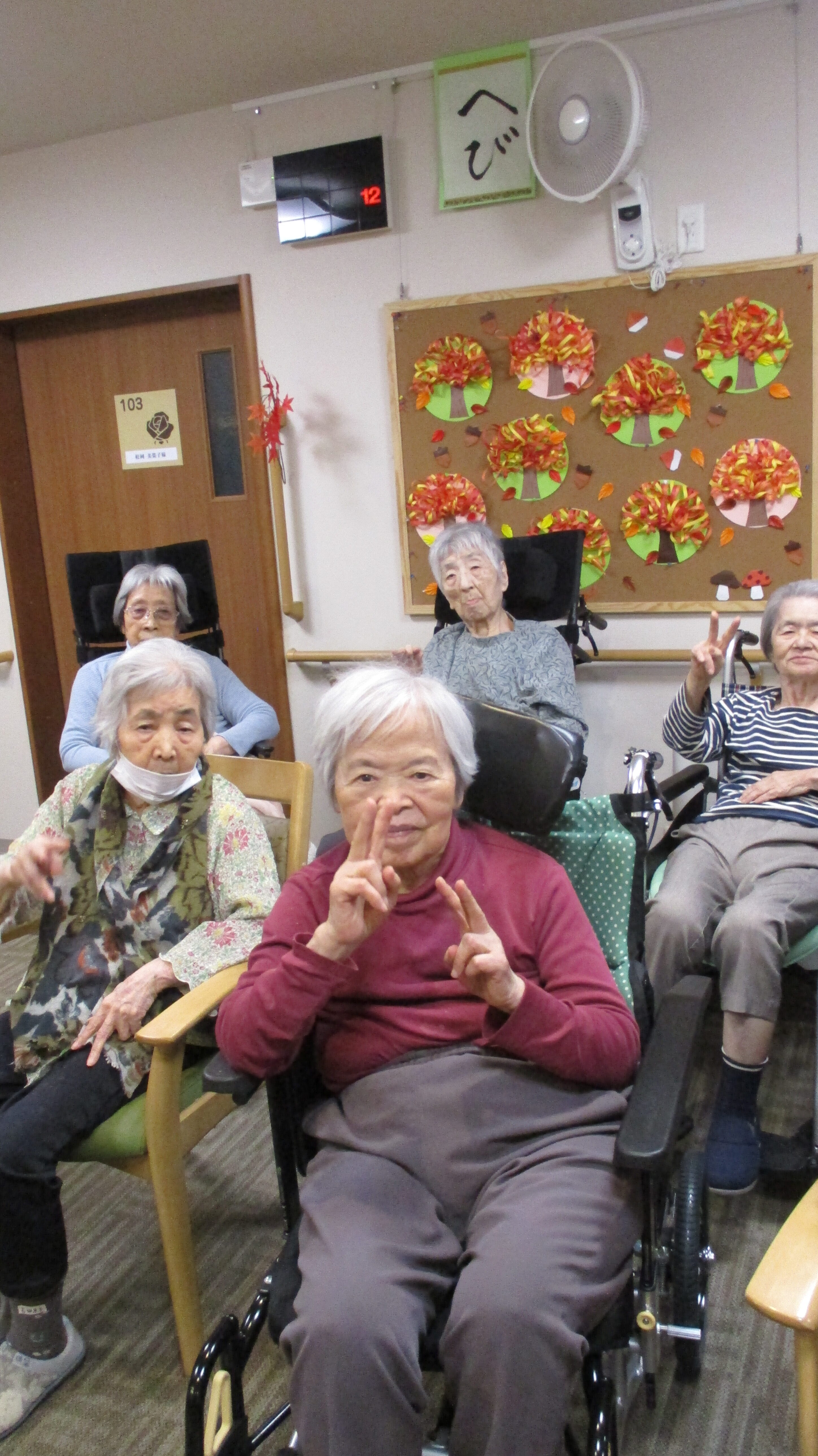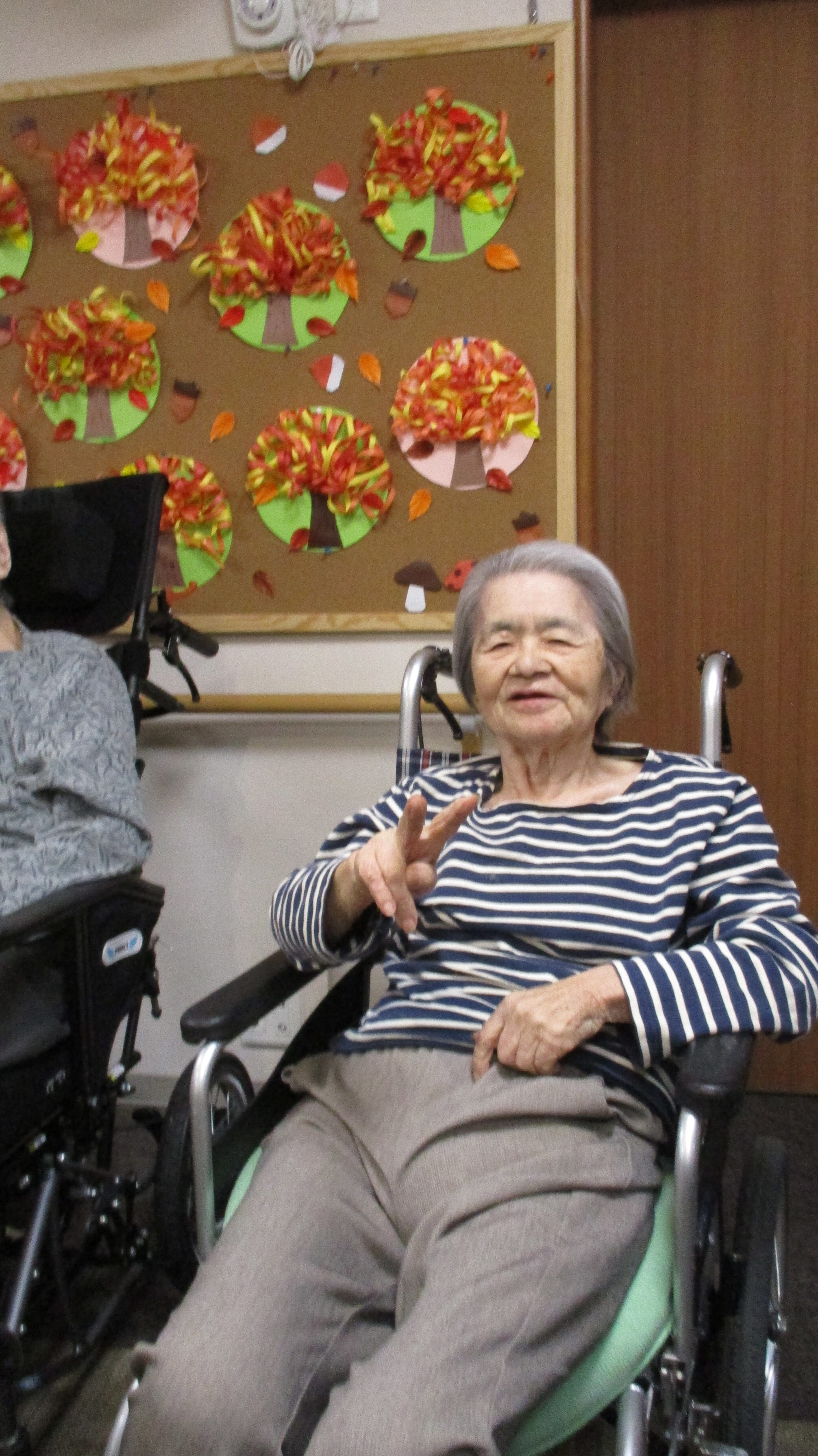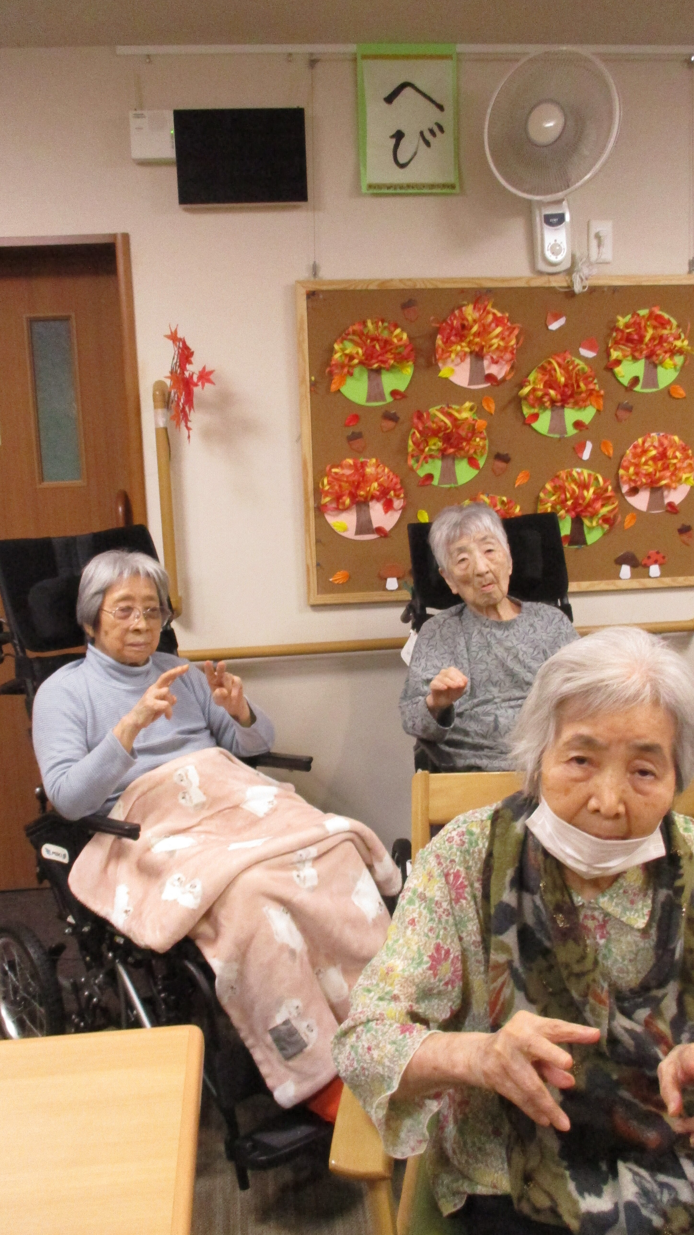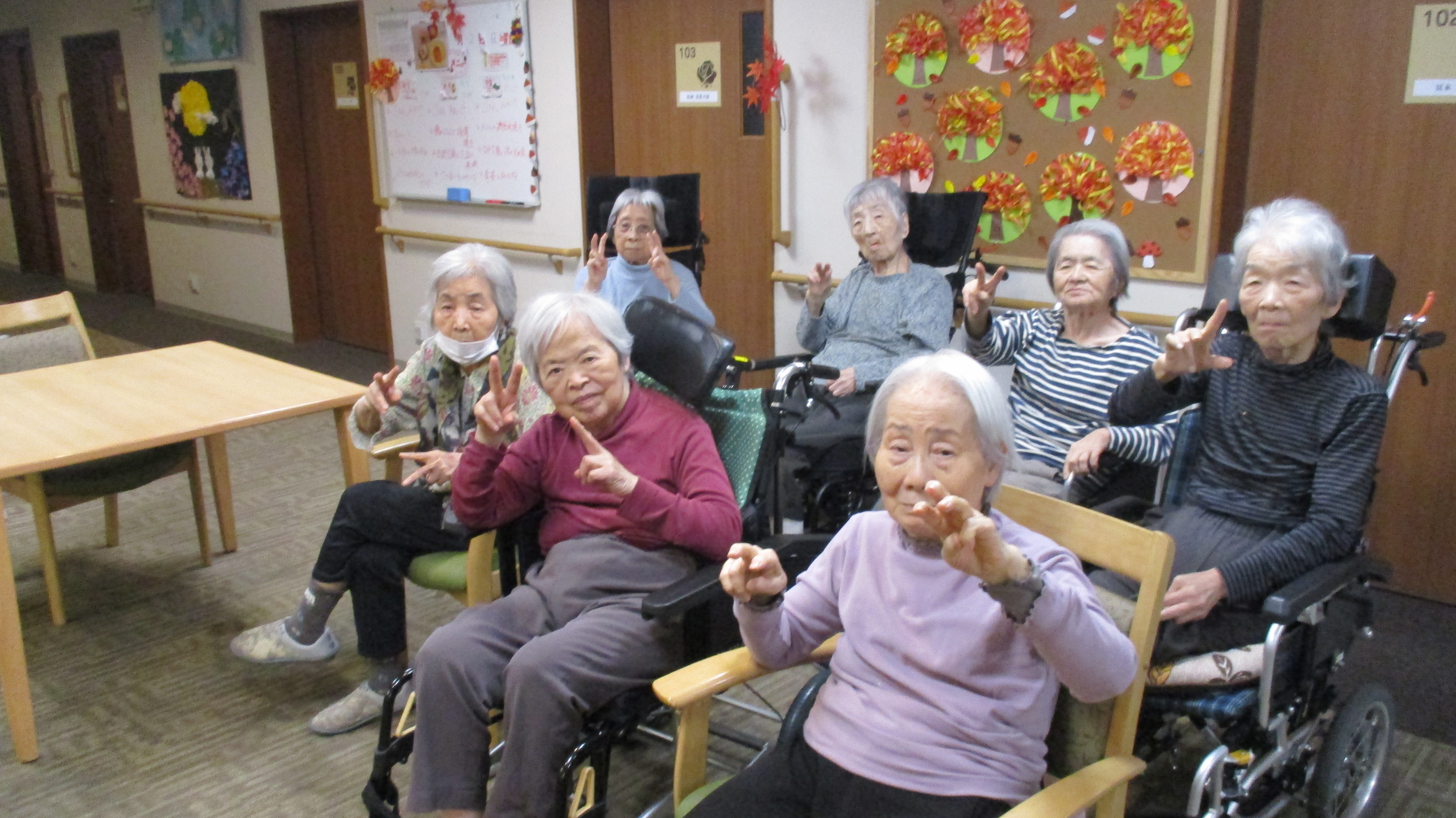 今月の壁画づくりはお一人づつ紅葉の木を職員とともに作成しました。紅葉は赤オレンジ黄色のリボンを鉛筆でくるくると巻いて円曲線を作り、ノリで付けました。いろんな表情の木々が出来ました。