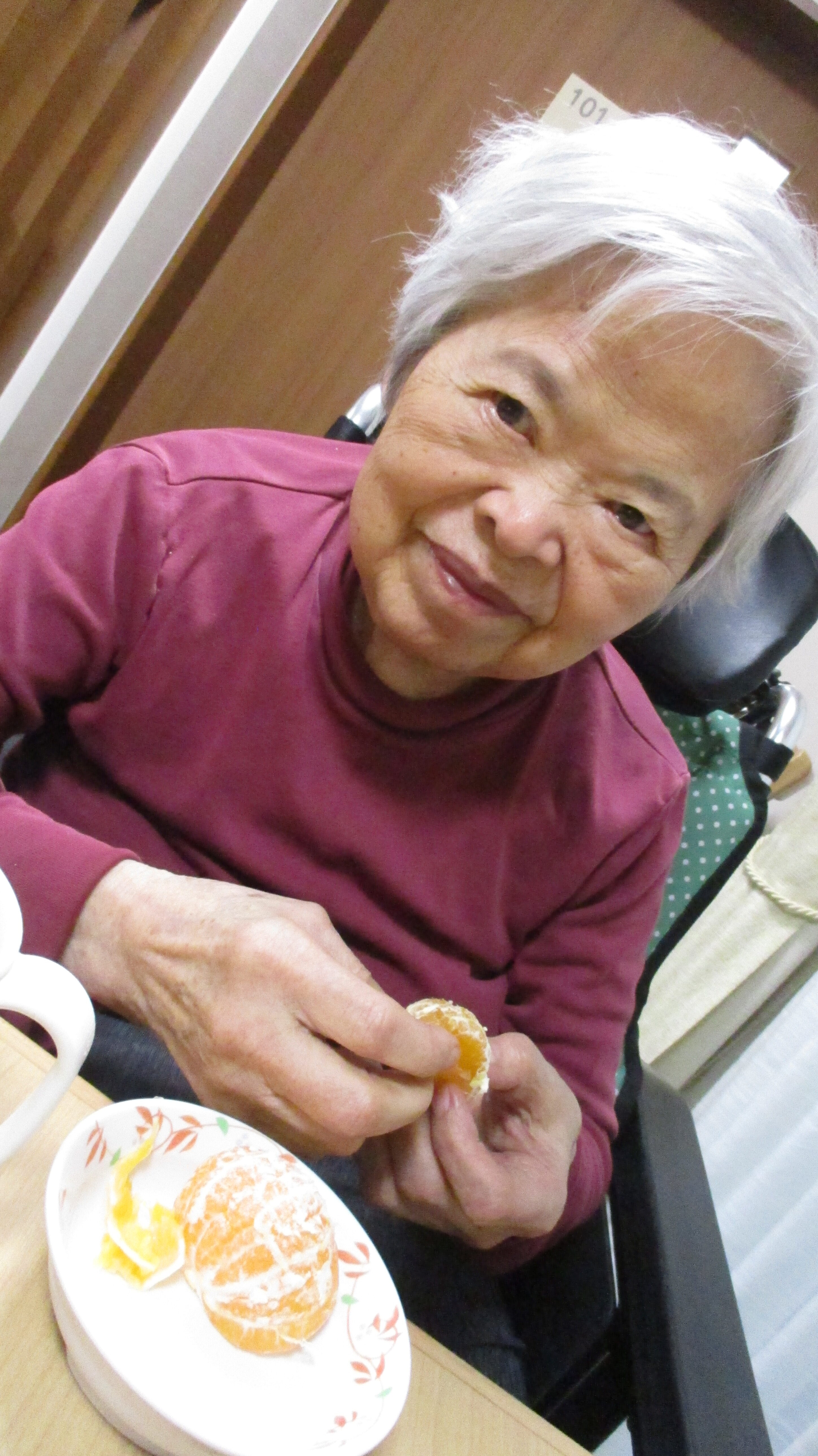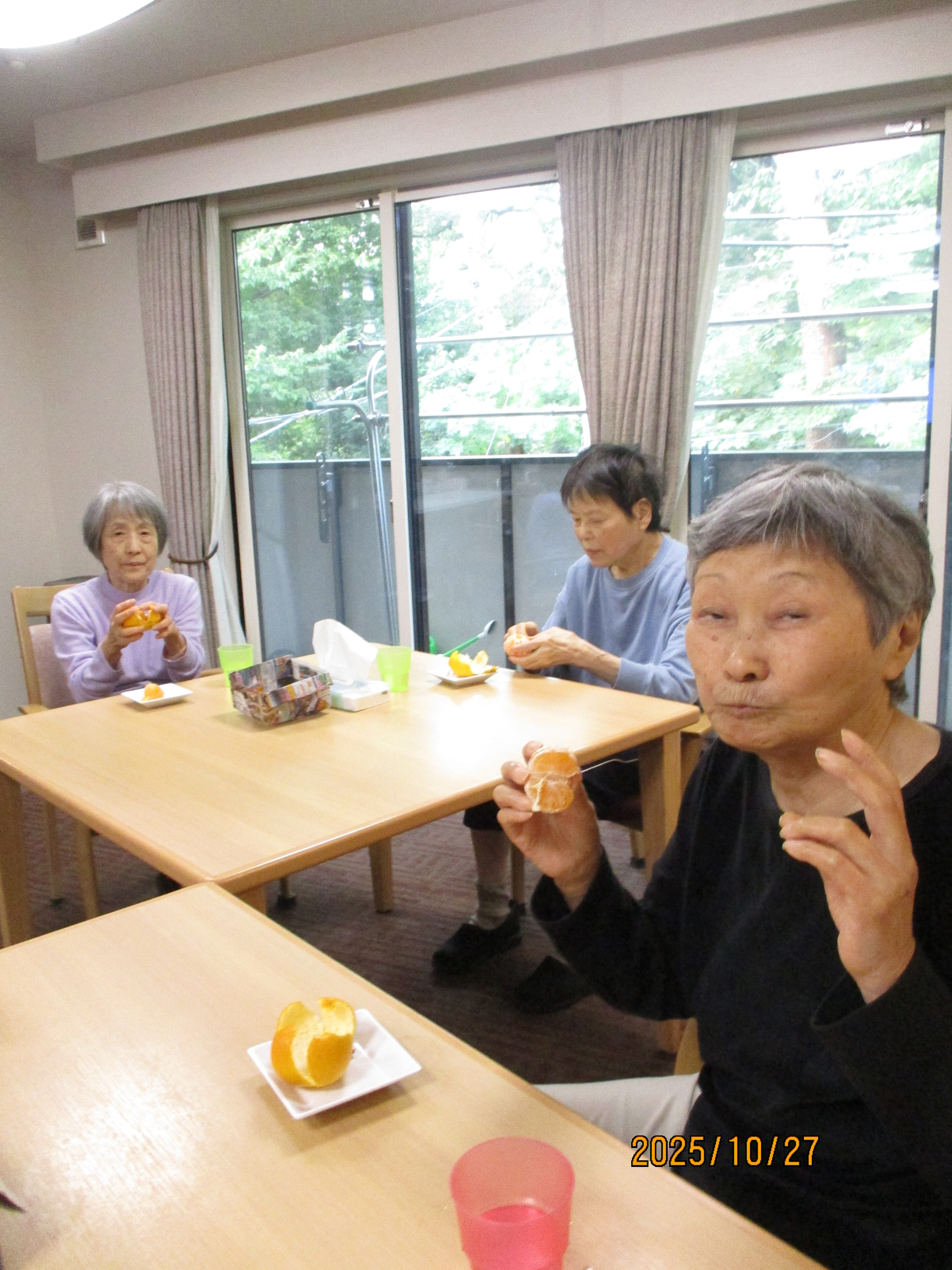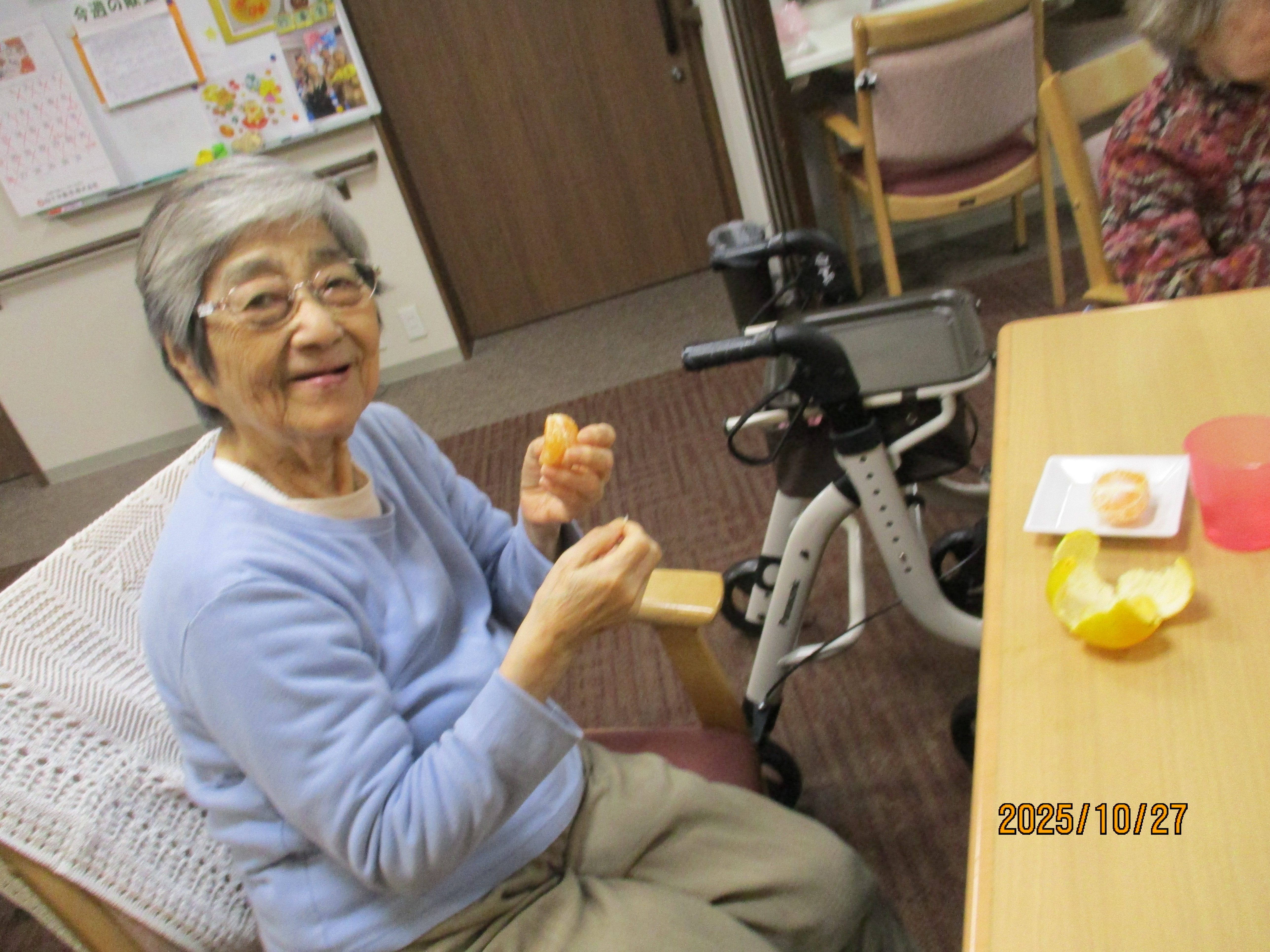 果物を頂く機会が多く、本日はみかんをおやつで食べました。好きなみかんを取ってもらい、お家でほっこり食べているように皆様くつろぎながら楽しそうに食べていました。夏はスイカ、秋はみかんやキウイ、柿を頂きました🍊
