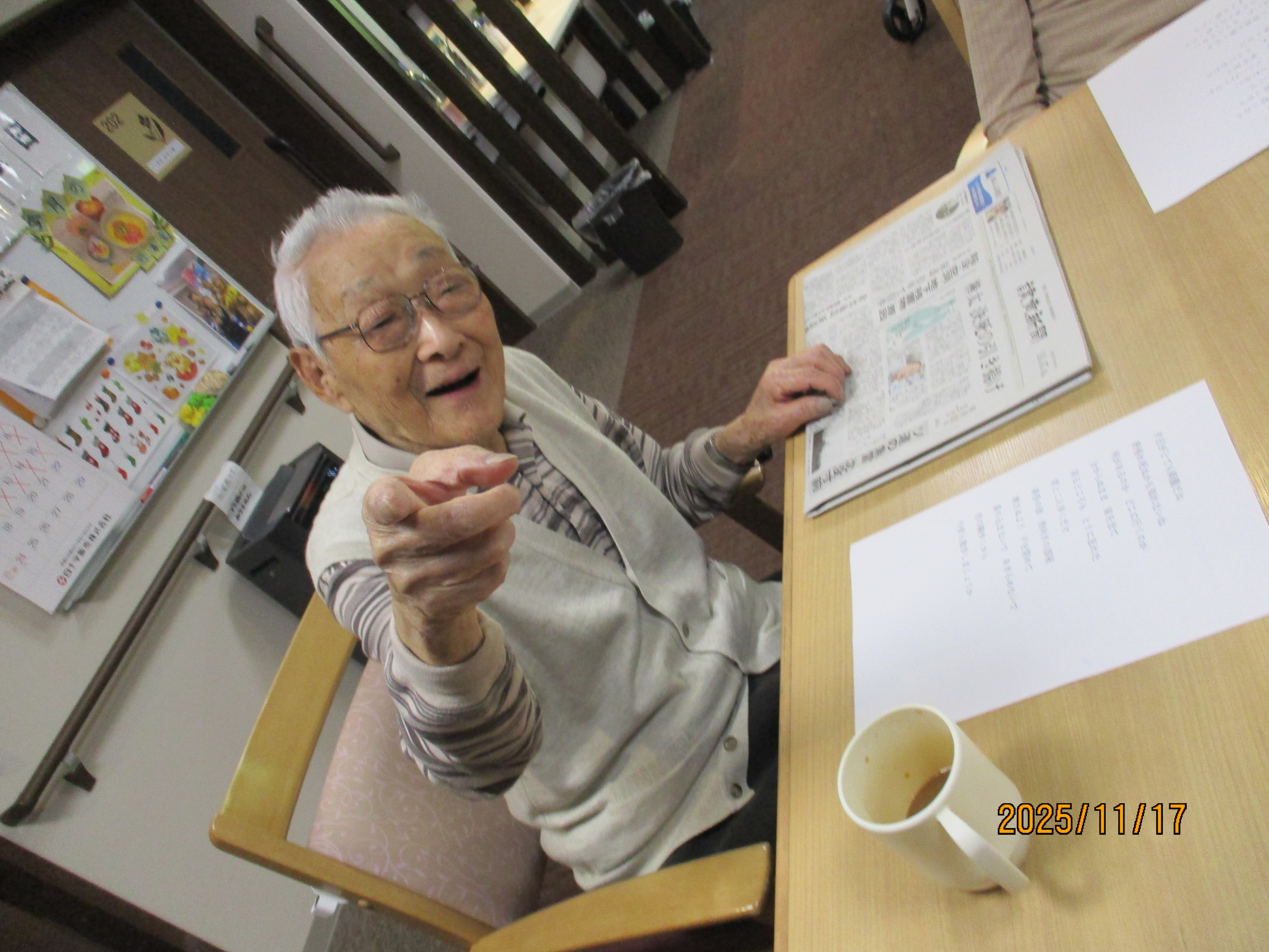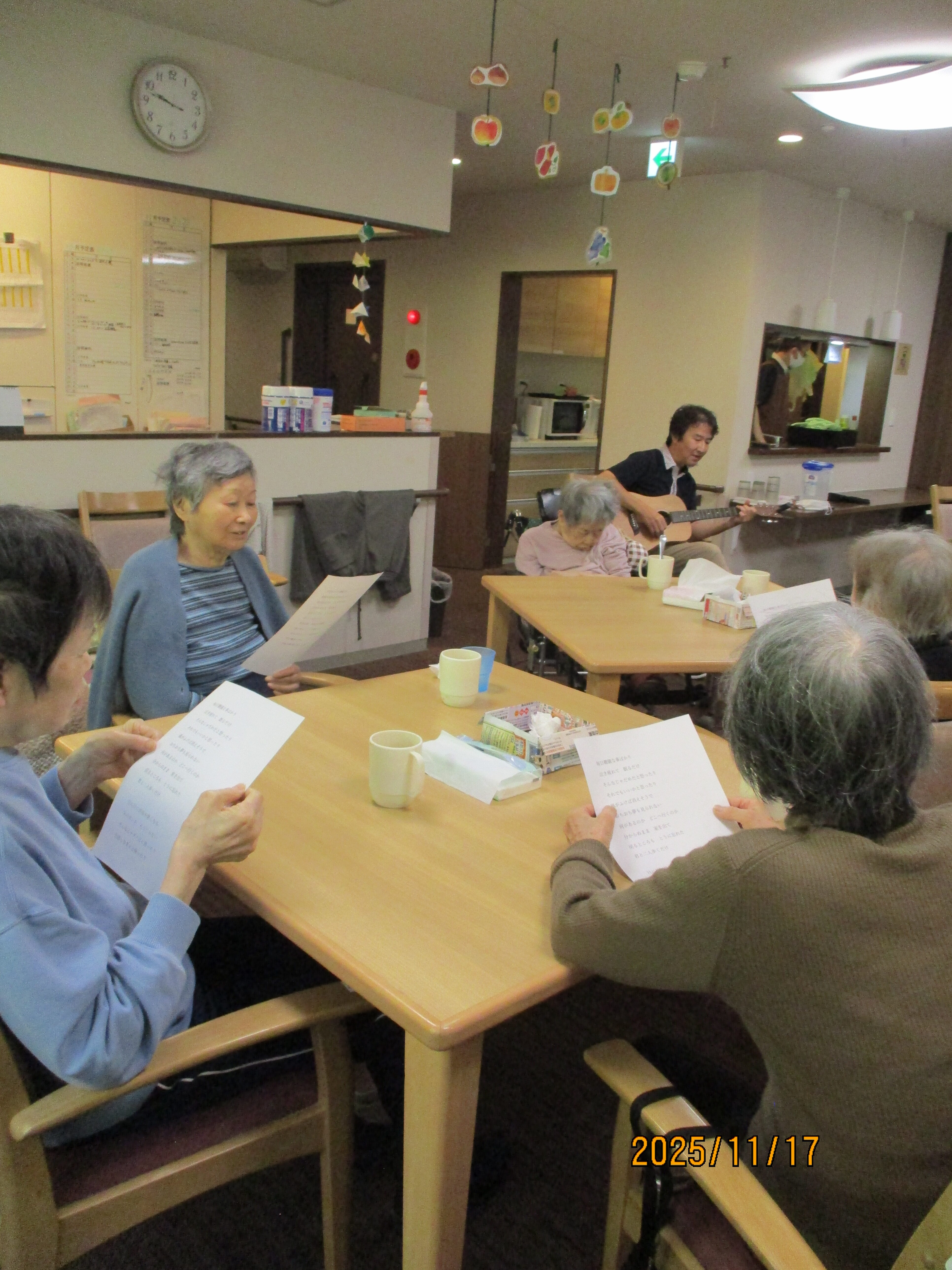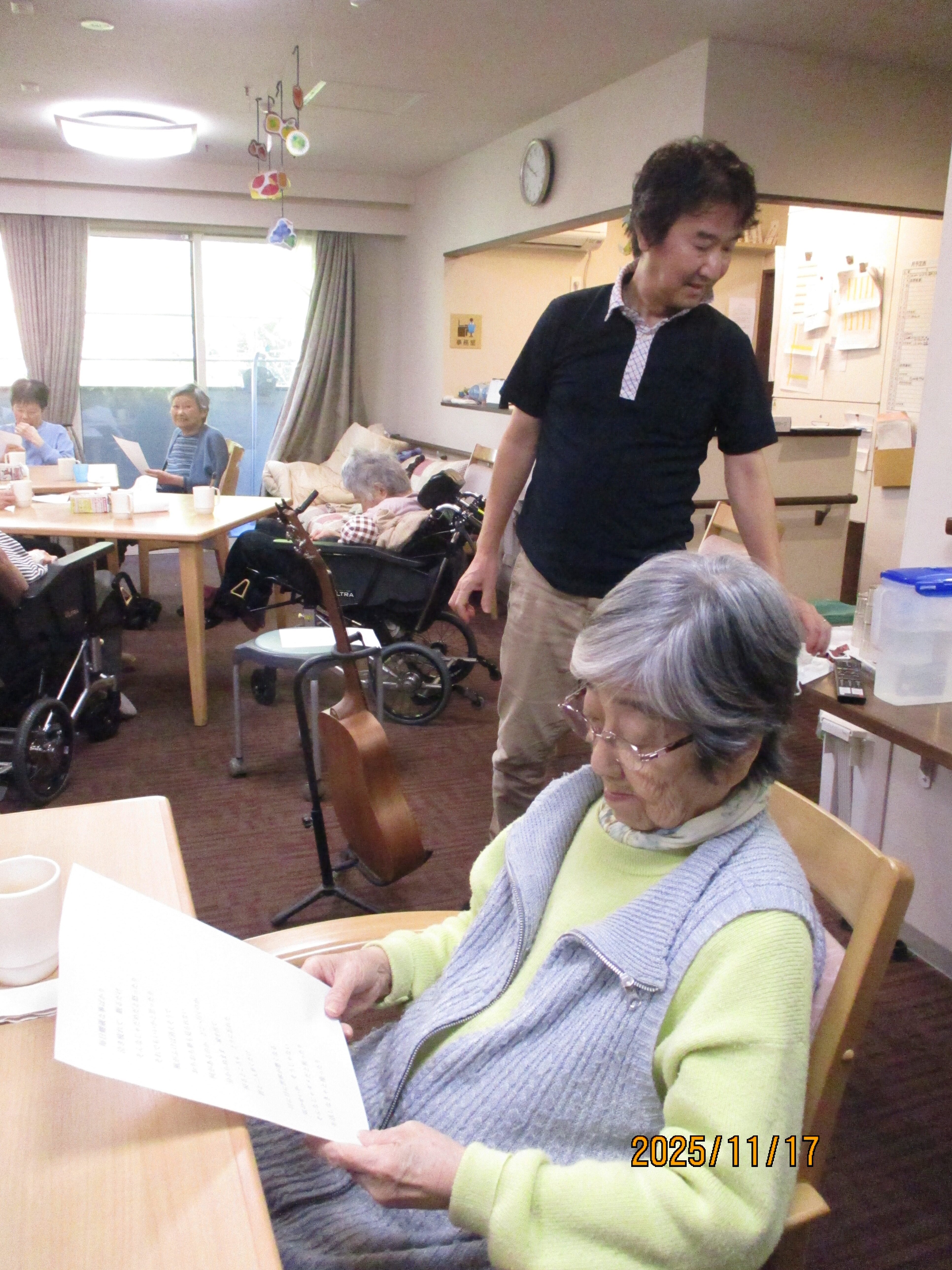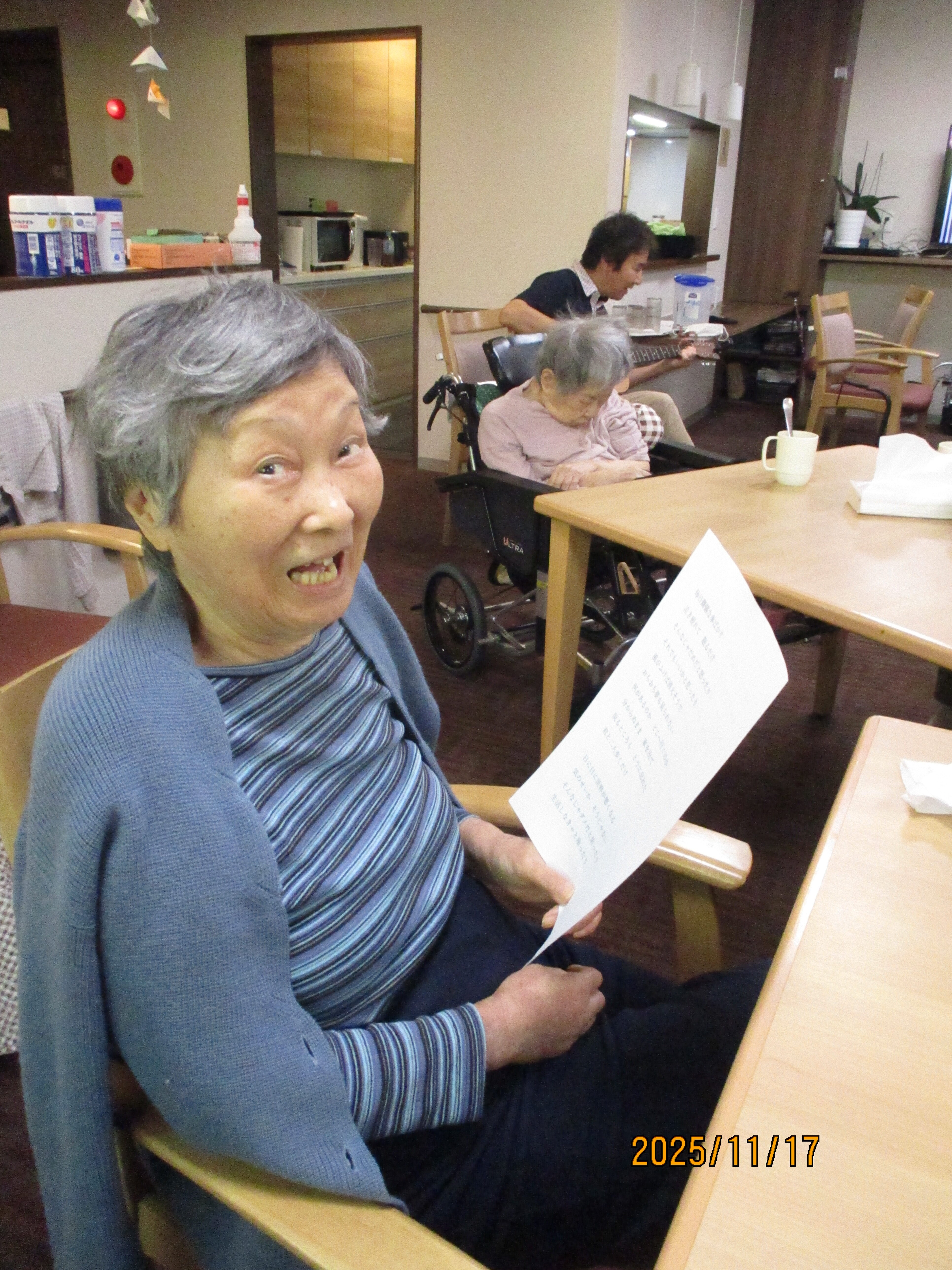 2階では朝ドラのばけばけを楽しみに観ています。そこで施設長が主題歌の『笑ったり転んだり』の歌詞カードを用意。ギター演奏をしてみんなで歌ってみました。「次回運営推進会議でご家族に披露できないかな?」と意気込んでおります。