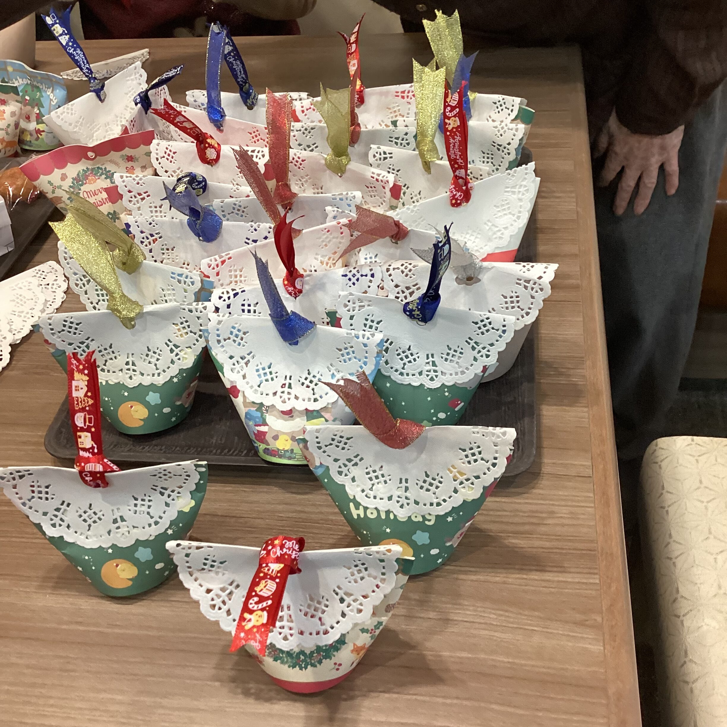 紙コップやペーパーコースターを使って、クリスマス仕様の小物入れを作りました! 皆さん上手に完成しました🎄中には飴が入っています🍭