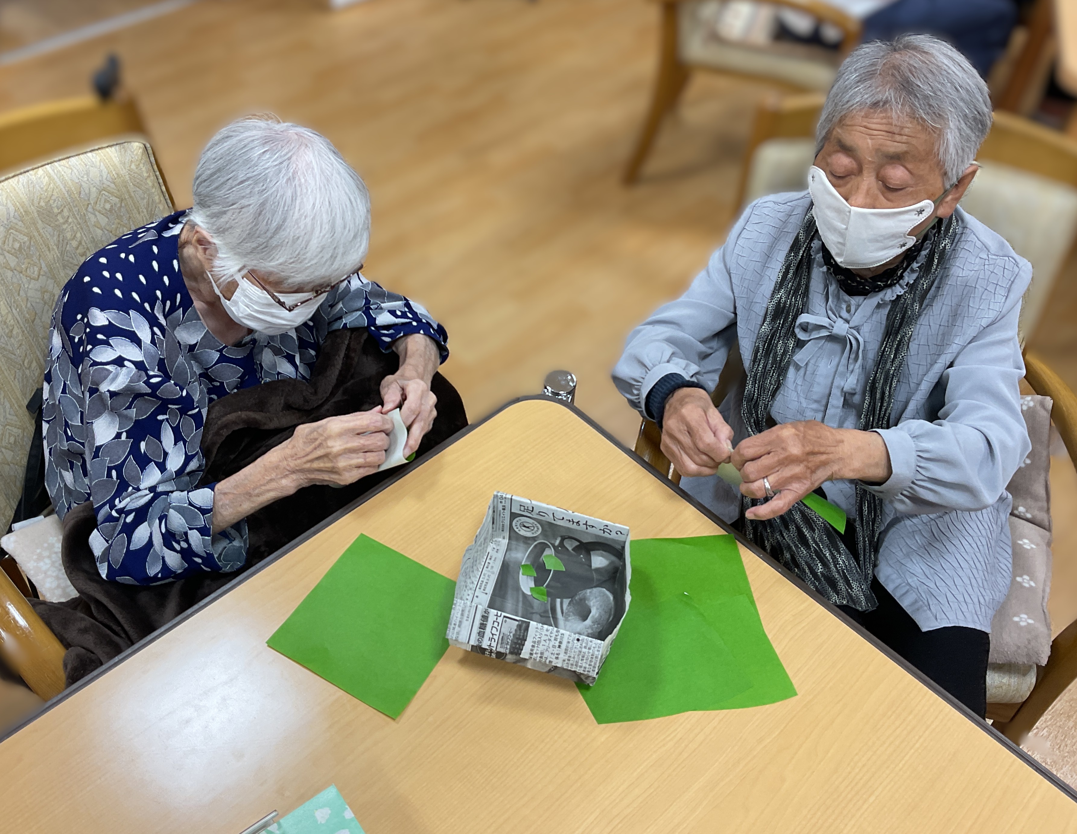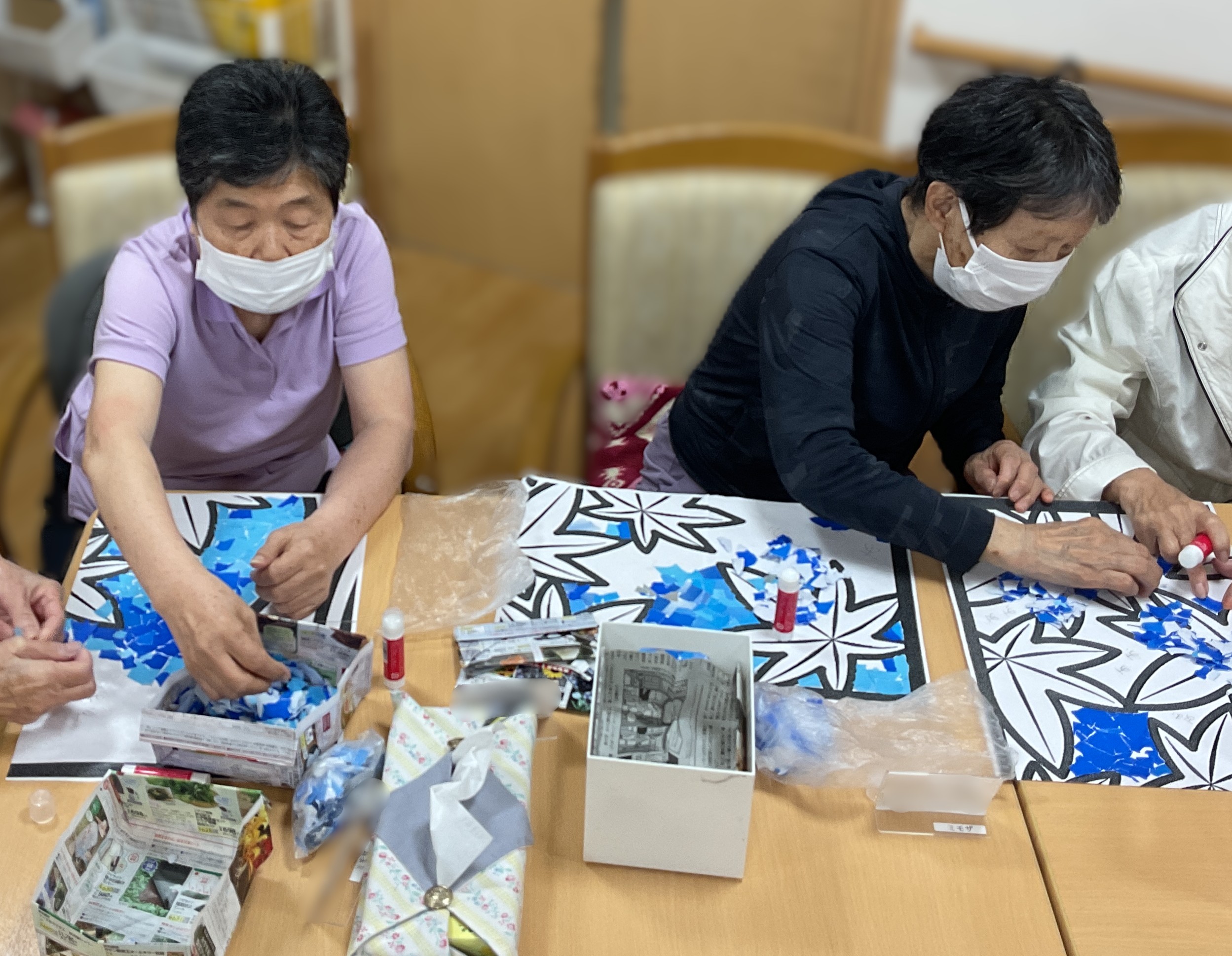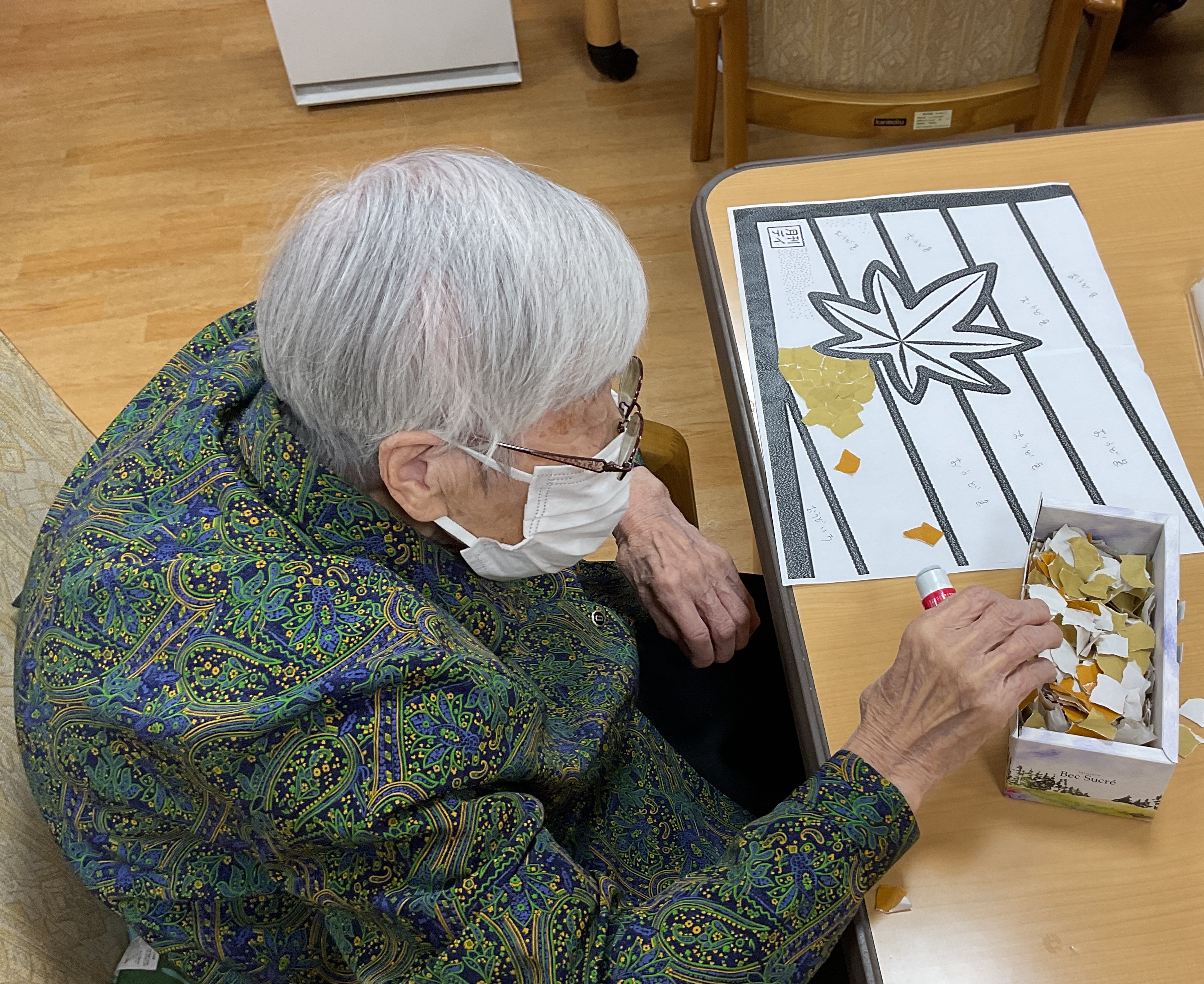 今月は紅葉のちぎり絵を制作しました♪ みなさまの頑張りでとてもカラフルに仕上げることができました♫