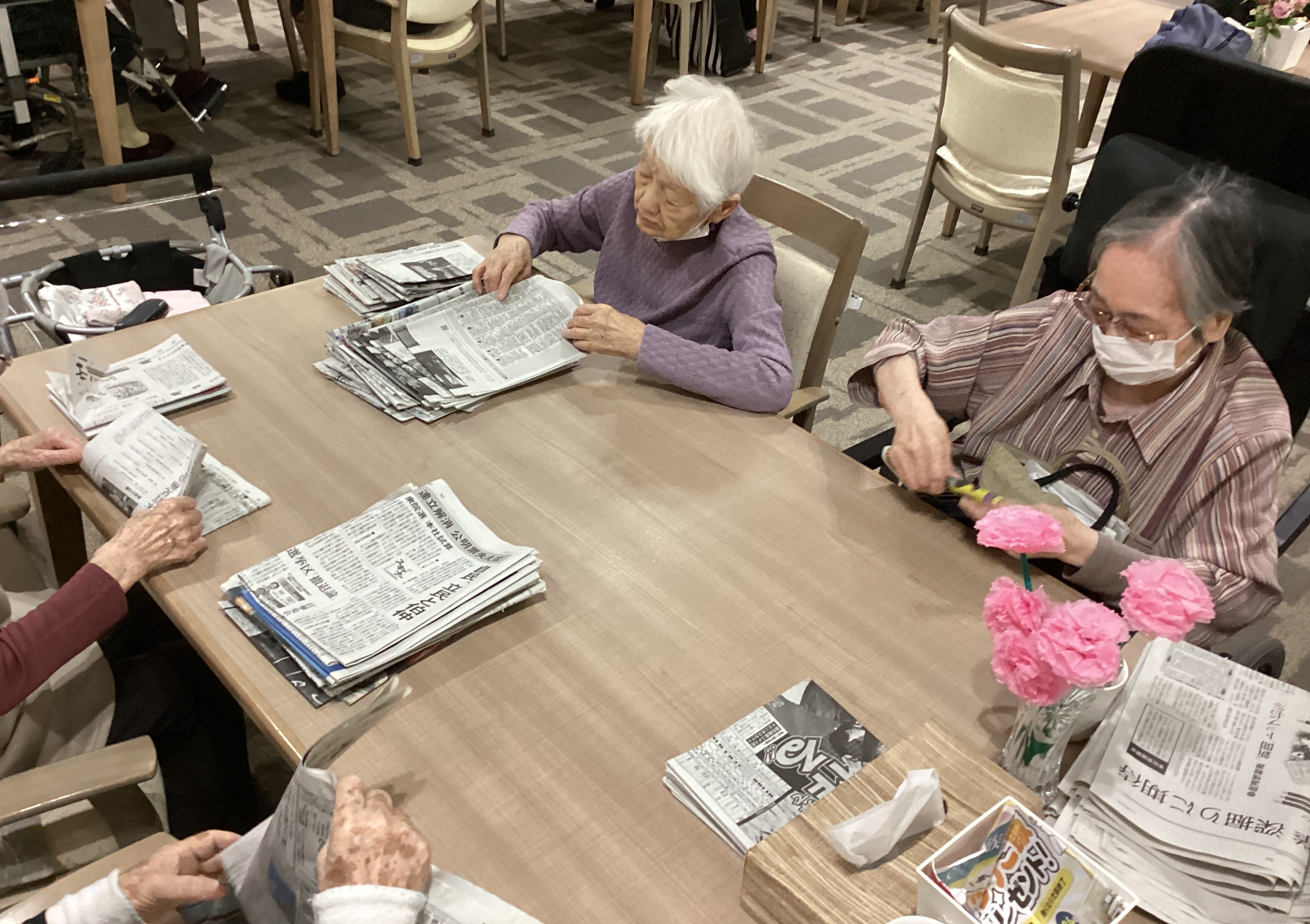 手先のリハビリも兼ねて、新聞やお洋服などの畳み物のお手伝いをしてくださることがあります。「手伝うよ、持ってきて」と積極的にお手伝いしてくださり、あっという間に全て畳み終えてしまいます!いつもありがとうございます😊