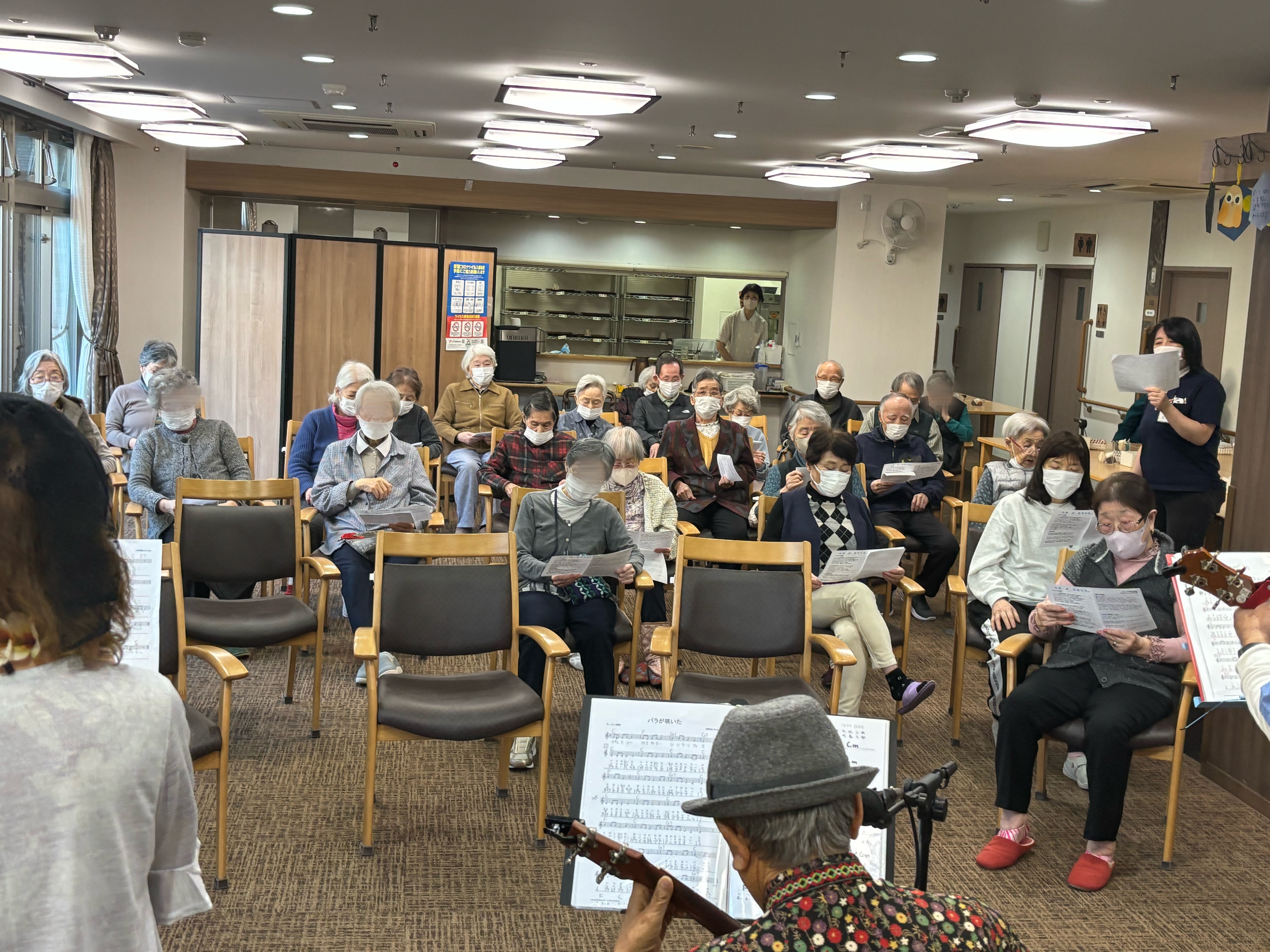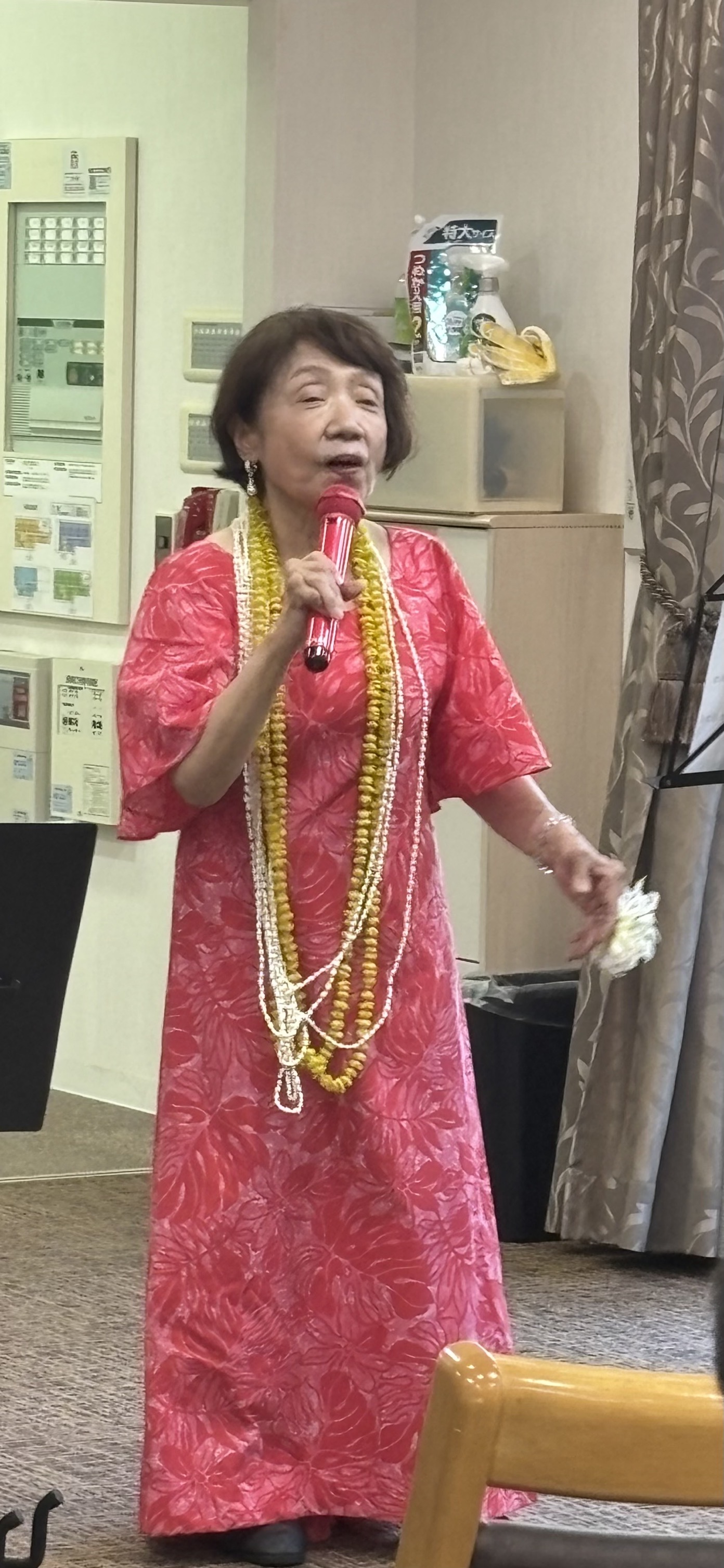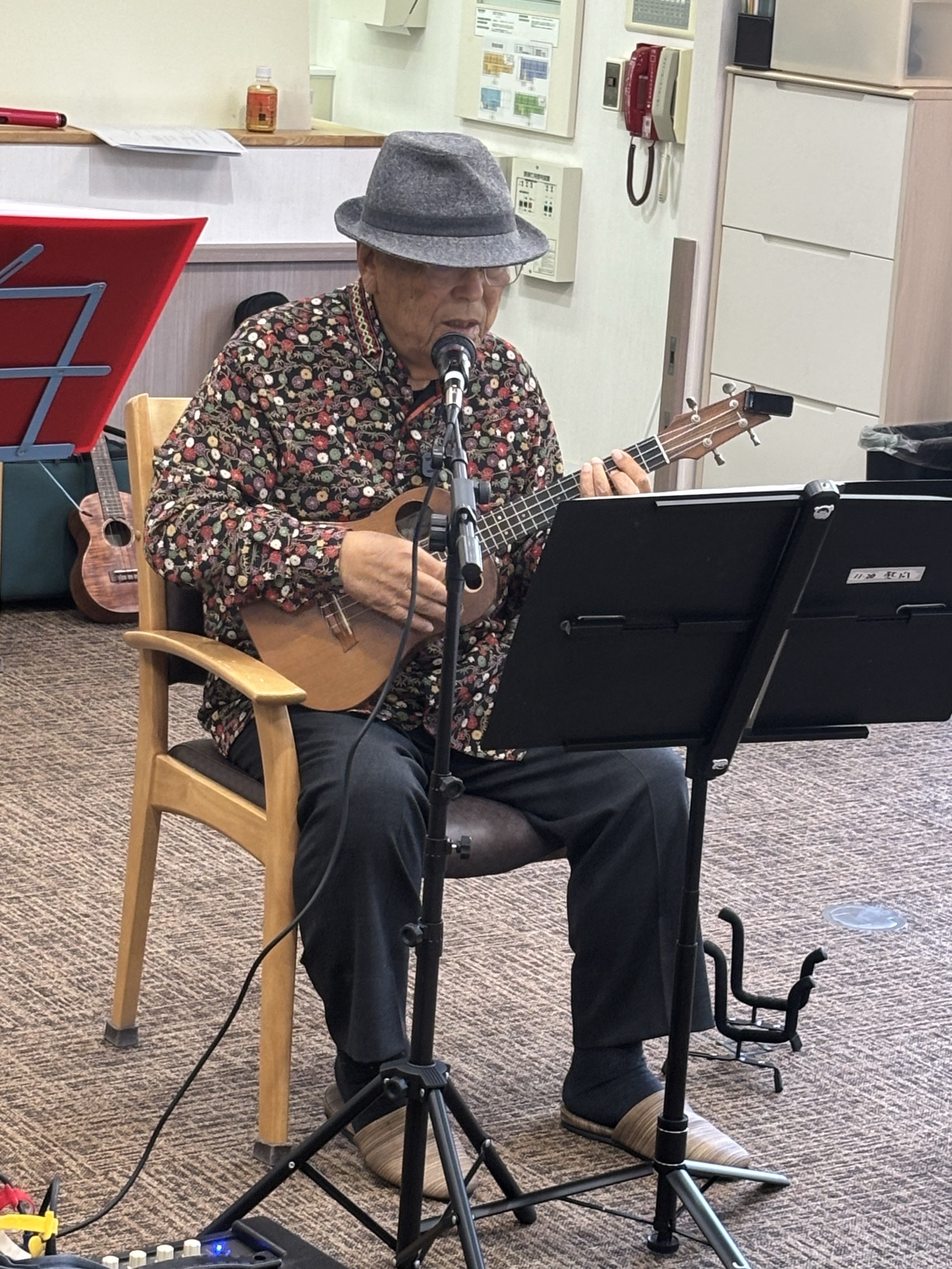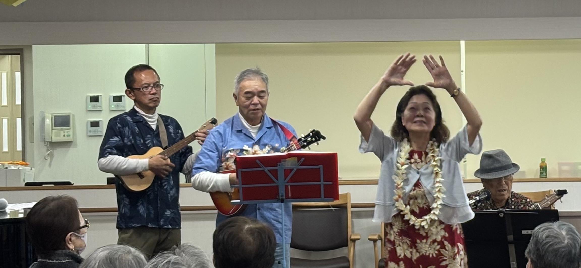 ボランティアの「音楽日和」さんによるウクレレの演奏会です。ウクレレの演奏に透き通る綺麗な歌声と低音の素敵な歌声がマッチしていました。 途中にフラダンスや皆様と歌う曲なども盛り込まれ、あっという間に時間が過ぎました。